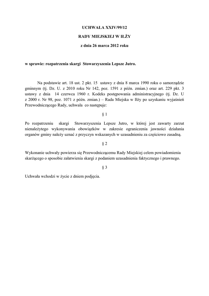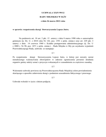 UCHWAŁA XXIV/99/12 RADY MIEJSKIEJ W IŁŻY z dnia 26 marca 2012 roku w sprawie: rozpatrzenia skargi Stowarzyszenia Lepsze Jutro. Na podstawie art. 18 ust. 2 pkt. 15 ustawy z dnia 8 marca 1990 roku o samorządzie gminnym (tj. Dz. U. z 2010 roku Nr 142, poz. 1591 z późn. zmian.) oraz art. 229 pkt. 3 ustawy z dnia 14 czerwca 1960 r. Kodeks postępowania administracyjnego (tj. Dz. U z 2000 r. Nr 98, poz. 1071 z późn. zmian.) – Rada Miejska w Iłży po uzyskaniu wyjaśnień Przewodniczącego Rady, uchwala co następuje: §1 Po rozpatrzeniu skargi Stowarzyszenia Lepsze Jutro, w której jest zawarty zarzut nienależytego wykonywania obowiązków w zakresie ograniczenia jawności działania organów gminy należy uznać z przyczyn wskazanych w uzasadnieniu za częściowo zasadną. §2 Wykonanie uchwały powierza się Przewodniczącemu Rady Miejskiej celem powiadomienia skarżącego o sposobie załatwienia skargi z podaniem uzasadnienia faktycznego i prawnego. §3 Uchwała wchodzi w życie z dniem podjęcia. UZASADNIENIE W dniu 26 stycznia 2012 roku wpłynęła do Rady Miejskiej w Iłży skarga złożona przez Stowarzyszenie Lepsze Jutro, której przedstawicielem jest Pani Grażyna Kuc na nienależyte wykonywanie obowiązków przez Przewodniczącego Rady w zakresie ograniczenia jawności działania organów gminy. Zgodnie z procedurą rozpatrywania skarg została ona niezwłocznie przekazana do Komisji Statutowo – Regulaminowej Rady Miejskiej w celu zbadania jej zasadności. W dniu 23 lutego 2012 r. Komisja Statutowo - Regulaminowa po przeanalizowaniu okoliczności sprawy, które przedstawił skarżący oraz po wysłuchaniu wyjaśnień Przewodniczącego oraz skarżącej uznała skargę za częściowo zasadną. Rada Miejska w Iłży, po zapoznaniu się z protokołem Komisji Statutowo – Regulaminowej dotyczącym badania skargi ustaliła, że: 1) Skarżąca w przedstawionych zarzutach podaje, że w dniu 13.01.2012 r. odbyła się sesja nadzwyczajna Rady Miejskiej w Iłży, o której terminie, porządku obrad, miejscu i czasie sesji nie było informacji na stronie internetowej BIP. Po przeprowadzeniu wyjaśnień w tej sprawie ustalono, że sesja nadzwyczajna w dniu 13.01.2012 r. odbyła się na wniosek Burmistrza zgodnie z art. 20 ust. 3 ustawy o samorządzie gminnym (tj. Dz. U. z 2001 r. Nr 142 poz. 1591 z późn. zm) oraz § 12 ust. 3 Statutu Gminy Iłża. Głównym powodem jej zwołania były plany jakie przedstawił Minister Sprawiedliwości oraz Prezes Sądu Okręgowego w Radomiu dot. przynależności sądowej gminy Iłża. Zgodnie z tymi założeniami ustalono, że dobrze będzie jak zostanie podjęta uchwała w sprawie wyrażenia protestu przeciwko likwidacji Sądu Rejonowego w Lipsku, a także przynależności Gminy Iłża do Sądu Rejonowego w miejscowości Przysucha. Dlatego też Burmistrz wystąpił do Przewodniczącego Rady z wnioskiem o zwołanie sesji nadzwyczajnej. Przewodniczący Rady zgodnie z art. 20 ust. 3 ustawy o samorządzie gminnym obowiązany jest zwołać sesję na dzień przypadający w ciągu 7 dni od dnia złożenia wniosku, co oznacza, że może ją zwołać nawet na jeden dzień przed sesją. Skarżąca podaje, że zgodnie § 10 Regulaminu obrad Rady Miejskiej w Iłży - „zawiadomienie o miejscu, terminie i problematyce obrad podaje się do wiadomości mieszkańców na 3 dni przed sesją”. W praktyce nie zawsze będzie można zastosować ten przepis, ponieważ Przewodniczący ma możliwość zwołać sesje nadzwyczajną w ciągu 7 dniu od dnia złożenia wniosku to jest również w terminie krótszym niż przewiduje to § 10 Regulaminu obrad Rady Miejskiej w Iłży. W takim przypadku należy domniemywać, że przepis ten dotyczy sesji zwyczajnej. Jednakże należy zaznaczyć, że zawiadomienie o sesji nadzwyczajnej powinno być zamieszczone na stronie internetowej BIP, ponieważ jest to informacja jawna i nie należy w jakikolwiek sposób ograniczać dostęp mieszkańców do takiej informacji. Dlatego też zobowiązuje się zamieszczać tego typu informacje na bieżąco. 2) Skarżąca podaje, że chciała uczestniczyć w posiedzeniu tej sesji i po przybyciu na miejsce, w której odbywało się posiedzenie i wyrażenia chęci uczestniczenia w tym posiedzeniu, Przewodniczący Rady, jak twierdzi skarżąca odpowiedział, że jest to sesja nadzwyczajna, będą omawiane 2 punkty obrad i nie widzi potrzeby uczestnictwa w niej skarżącej. Zgodnie z oświadczeniem Przewodniczącego Rady oraz pracowników biura Rady Miejskiej w Iłży - światków zdarzenia, którzy złożyli notatki służbowe na okoliczność rozmowy jaka była przeprowadzona pomiędzy Przewodniczącym Rady – Andrzejem Pałką, a Panią Grażyną Kuc przed posiedzeniem sesji nadzwyczajnej w dniu 13.01.2012 wynika, że po zapytaniu się skarżącego, czy może wejść na posiedzenie sesji, Przewodniczący odpowiedział, że zaprasza, po czym dodał, że jest to sesja nadzwyczajna i nie można zmienić porządku obrad, wobec powyższego nie będzie można niektórych rzeczy do niej wprowadzić. Na to skarżąca powiedziała, że przyniosła pewien artykuł, który chciałaby, aby został Radnym przedstawiony. Przewodniczący Rady oznajmił, że zapozna Radnych z tą informacją, jednakże uważa, że bardziej zasadne będzie odczytanie tego na posiedzeniu sesji zwykłej, ponieważ wówczas na Sali znajdują się również Sołtysi i goście zaproszeni, wobec tego więcej osób będzie mogło się z tą informacją zapoznać. Na to skarżąca wyraziła zgodę i nie roszcząc żadnych pretensji wyszła. Cała rozmowa odbywała się w bardzo grzecznej atmosferze. W związku z tymi wyjaśnieniami trudno stwierdzić winę Przewodniczącego, ponieważ skarżąca miała możliwość wejścia na posiedzenie sesji nadzwyczajnej . Reasumując stwierdzić należy, iż według oceny Rady Miejskiej w Iłży postawione zarzuty skarżącego okazały się częściowo zasadne w pierwszym punkcie przedstawionej s