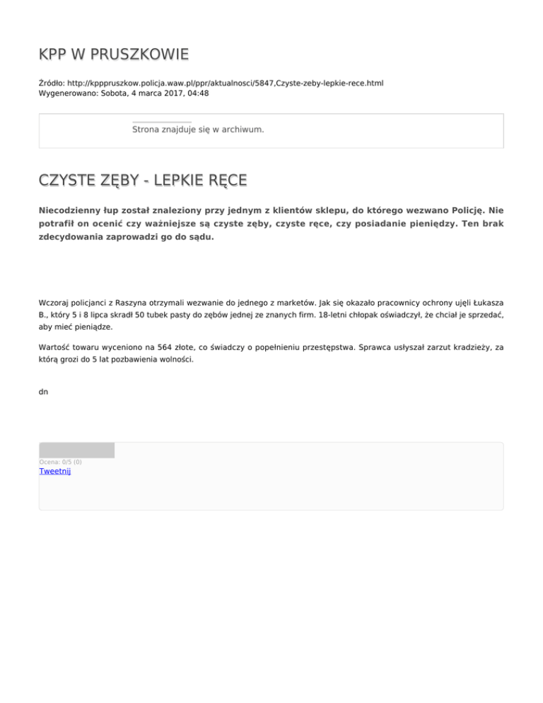 KPP W PRUSZKOWIE Źródło: http://kpppruszkow.policja.waw.pl/ppr/aktualnosci/5847,Czyste-zeby-lepkie-rece.html Wygenerowano: Sobota, 4 marca 2017, 04:48 Strona znajduje się w archiwum. CZYSTE ZĘBY - LEPKIE RĘCE Niecodzienny łup został znaleziony przy jednym z klientów sklepu, do którego wezwano Policję. Nie potrafił on ocenić czy ważniejsze są czyste zęby, czyste ręce, czy posiadanie pieniędzy. Ten brak zdecydowania zaprowadzi go do sądu. Wczoraj policjanci z Raszyna otrzymali wezwanie do jednego z marketów. Jak się okazało pracownicy ochrony ujęli Łukasza B., który 5 i 8 lipca skradł 50 tubek pasty do zębów jednej ze znanych firm. 18-letni chłopak oświadczył, że chciał je sprzedać, aby mieć pieniądze. Wartość towaru wyceniono na 564 złote, co świadczy o popełnieniu przestępstwa. Sprawca usłyszał zarzut kradzieży, za którą grozi do 5 lat pozbawienia wolności. dn Ocena: 0/5 (0) Tweetnij