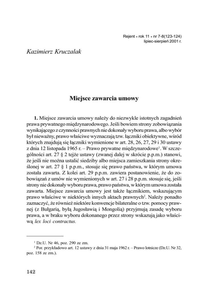 Kazimierz Kruczalak Rejent * rok 11 * nr 7-8(123-124) lipiec-sierpieñ 2001 r. Kazimierz Kruczalak Miejsce zawarcia umowy 1. Miejsce zawarcia umowy nale¿y do niezwykle istotnych zagadnieñ prawa prywatnego miêdzynarodowego. Jeœli bowiem strony zobowi¹zania wynikaj¹cego z czynnoœci prawnych nie dokona³y wyboru prawa, albo wybór by³ niewa¿ny, prawo w³aœciwe wyznaczaj¹ tzw. ³¹czniki obiektywne, wœród których znajduj¹ siê ³¹czniki wymienione w art. 28, 26, 27, 29 i 30 ustawy z dnia 12 listopada 1965 r. – Prawo prywatne miêdzynarodowe1. W szczególnoœci art. 27 § 2 tej¿e ustawy (zwanej dalej w skrócie p.p.m.) stanowi, ¿e jeœli nie mo¿na ustaliæ siedziby albo miejsca zamieszkania strony okreœlonej w art. 27 § 1 p.p.m., stosuje siê prawo pañstwa, w którym umowa zosta³a zawarta. Z kolei art. 29 p.p.m. zawiera postanowienie, ¿e do zobowi¹zañ z umów nie wymienionych w art. 27 i 28 p.p.m. stosuje siê, jeœli strony nie dokona³y wyboru prawa, prawo pañstwa, w którym umowa zosta³a zawarta. Miejsce zawarcia umowy jest tak¿e ³¹cznikiem, wskazuj¹cym prawo w³aœciwe w niektórych innych aktach prawnych2. Nale¿y ponadto zaznaczyæ, ¿e równie¿ niektóre konwencje bilateralne o tzw. pomocy prawnej (z Bu³gari¹, by³¹ Jugos³awi¹ i Mongoli¹) przyjmuj¹ zasadê wyboru prawa, a w braku wyboru dokonanego przez strony wskazuj¹ jako w³aœciw¹ lex loci contractus. 1 Dz.U. Nr 46, poz. 290 ze zm. Por. przyk³adowo art. 12 ustawy z dnia 31 maja 1962 r. – Prawo lotnicze (Dz.U. Nr 32, poz. 158 ze zm.). 2 142 Miejsce zawarcia umowy 2. £¹cznik miejsca zawarcia umowy (lex loci contractus) znany by³ ju¿ w œredniowieczu3. Wyrós³ z potrzeb praktyki. Poszukiwaniu jednego prawa dla umów sprzeda¿y lub zamiany sprzyja³a obserwacja transakcji dokonywanych z regu³y na jarmarkach i targach lub zawieranych w siedzibie urzêdników w formie oficjalnej. Miejsce zawarcia umowy by³o w zwi¹zku z tym jawne i pewne. Wspó³czeœnie wymienione zalety ³¹cznika miejsca zawarcia umowy straci³y jednak¿e swoj¹ wartoœæ i praktyczn¹ przydatnoœæ. W szczególnoœci charakter wspó³czesnego handlu œwiatowego sprawia, ¿e miejsce, w którym s¹ zawierane umowy jest czêsto przypadkowe i pozbawione g³êbszego zwi¹zku z zawart¹ umow¹. Drugim powodem, który zachwia³ sensem kierowania siê ³¹cznikiem miejsca zawarcia umowy jest przyjêta powszechnie na œwiecie zasada zawierania umów handlowych za pomoc¹ oferty (umowy zawierane inter absentes). Umowa zawarta w trybie ofertowym (listem, telegramem, teleksem lub przez internet) nie ma w istocie miejsca zawarcia. Dochodzi do niej przez z³o¿enie oœwiadczeñ woli w co najmniej dwóch ró¿nych miejscach. Jeœli przeto mówi siê potocznie, ¿e umowa zawarta w trybie ofertowym, zosta³a zawarta w okreœlonym miejscu, to miejsce to jest w rzeczywistoœci fikcyjne. Tak¿e zawarcie umowy w trybie rokowañ rodziæ mo¿e (i rodzi) okreœlone trudnoœci w ustaleniu miejsca zawarcia umowy. Mianowicie wystêpuje to szczególnie wtedy, gdy poszczególne fazy rokowañ poprzedzaj¹ce ostateczne zawarcie umowy odby³y siê w ró¿nych pañstwach, lub gdy w danym pañstwie dosz³o jedynie do parafowania umowy, w innych do jej podpisania4. 3. W zwi¹zku z podniesionymi trudnoœciami w ustalaniu miejsca zawarcia umowy, a jednoczeœnie – w zwi¹zku z odes³aniem wskazanych wy¿ej ustaw do ³¹cznika „miejsce zawarcia umowy”, powstaje pytanie, czy przy ustalaniu tego miejsca nale¿y kierowaæ siê rozwi¹zaniami przyjêtymi w tej mierze przez prawo merytoryczne (por. np. art. 70 § 2 k.c.), czy te¿ powinno siê d¹¿yæ do samodzielnego, na gruncie prawa prywatnego miêdzynarodowego, rozstrzygniêcia. 3 Por. W. L u d w i c z a k, Miêdzynarodowe prawo prywatne, w opracowaniu K. Kruczalaka, Poznañ 1996, s. 251-252. 4 Por. M. P a z d a n, Prawo prywatne miêdzynarodowe, wyd. 6., Warszawa 2000, s. 141-142. 143 Kazimierz Kruczalak 4. Zwolennikiem pogl¹du, ¿e przy ustalaniu miejsca zawarcia umowy nale¿y kierowaæ siê rozwi¹zaniami przyjêtymi w prawie merytorycznym jest m.in. J. Jakubowski5. Zdaniem tego autora, jeœli umowa zosta³a zawarta miêdzy nieobecnymi (contractus inter absentes), to za miejsce zawarcia umowy przyjmuje siê miejsce, w którym sk³adaj¹cy ofertê otrzyma³ akceptacjê tej¿e oferty. Jest to tzw. teoria dorêczenia, w odró¿nieniu od przyjêtej w krajach anglosaskich teorii wys³ania (expedition theory, mail-box-theory). W œwietle tej ostatniej teorii, za miejsce zawarcia umowy uwa¿a siê miejsce, w którym oblat odes³a³ oferentowi ofertê po jej zaakceptowaniu. Zagadnienie miejsca zawarcia umowy miêdzy nieobecnymi jest zdaniem J. Jakubowskiego korelatem problemu chwili zawarcia takiej umowy. Ta ostatnia kwestia jest w prawie polskim uregulowana zgodnie z teori¹ dorêczenia, a nie teori¹ wys³ania (art. 70 § 2 k.c.). Pojawiaj¹cym siê tutaj trudnym zagadnieniem jest problem, w oparciu o który system prawny nale¿y ustaliæ, czy oferta zosta³a przyjêta i czy umowa dosz³a do skutku. Jak przyjmuje J. Jakubowski, mo¿na przyj¹æ w³aœciwoœæ prawa pañstwa, które by³oby w³aœciwe, gdyby nie istnia³ spór co do faktu, czy umowa dosz³a do skutku. Rozwi¹zanie to choæ czyni, co prawda (jak stwierdza powo³any Autor), wra¿enie petitionis principii, pozwala jednak¿e unikn¹æ trudnoœci w oznaczeniu miejsca zawarcia umowy. Wymóg, aby dojœcie umowy do skutku odpowiada³o prawu personalnemu obu stron (koniunkcja ³¹czników prowadz¹ca do ³¹cznego stosowania dwóch praw) wydaje siê bowiem zbyt rygorystyczna. Gdyby siê jednak okaza³o, ¿e strony maj¹ w chwili zawarcia umowy siedzibê lub miejsce zamieszkania w jednym pañstwie (art. 26 p.p.m.), stosuje siê prawo tego pañstwa, zarówno w wypadku umów wymienionych w art. 27 jak i innych umów, z wy³¹czeniem umów dotycz¹cych nieruchomoœci. Z uwagi na treœæ art. 30 p.p.m., przepisy o prawie w³aœciwym dla zobowi¹z