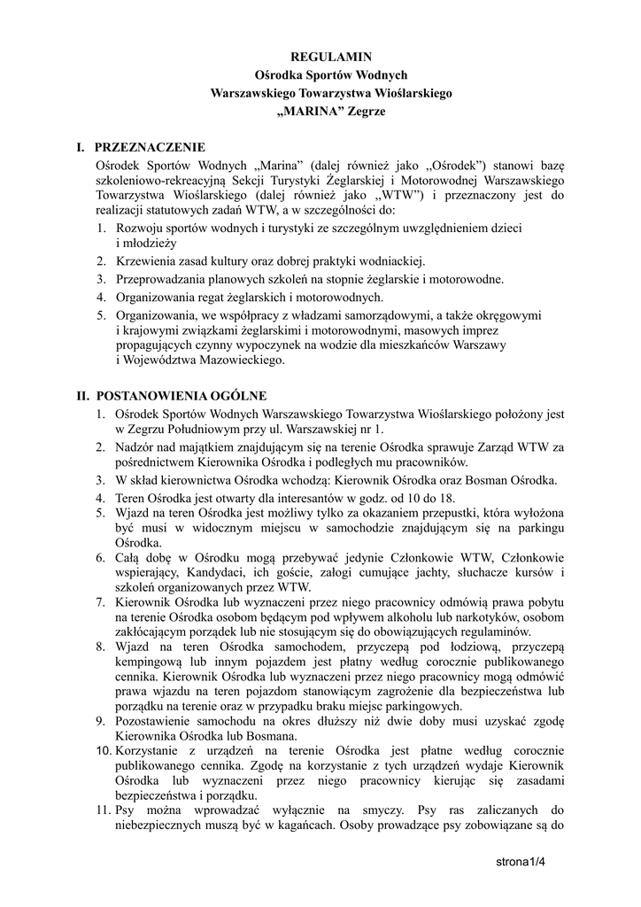 REGULAMIN Ośrodka Sportów Wodnych Warszawskiego Towarzystwa Wioślarskiego „MARINA” Zegrze I. PRZEZNACZENIE Ośrodek Sportów Wodnych „Marina” (dalej również jako ,,Ośrodek”) stanowi bazę szkoleniowo-rekreacyjną Sekcji Turystyki Żeglarskiej i Motorowodnej Warszawskiego Towarzystwa Wioślarskiego (dalej również jako ,,WTW”) i przeznaczony jest do realizacji statutowych zadań WTW, a w szczególności do: 1. Rozwoju sportów wodnych i turystyki ze szczególnym uwzględnieniem dzieci i młodzieży 2. Krzewienia zasad kultury oraz dobrej praktyki wodniackiej. 3. Przeprowadzania planowych szkoleń na stopnie żeglarskie i motorowodne. 4. Organizowania regat żeglarskich i motorowodnych. 5. Organizowania, we współpracy z władzami samorządowymi, a także okręgowymi i krajowymi związkami żeglarskimi i motorowodnymi, masowych imprez propagujących czynny wypoczynek na wodzie dla mieszkańców Warszawy i Województwa Mazowieckiego. II. POSTANOWIENIA OGÓLNE 1. Ośrodek Sportów Wodnych Warszawskiego Towarzystwa Wioślarskiego położony jest w Zegrzu Południowym przy ul. Warszawskiej nr 1. 2. Nadzór nad majątkiem znajdującym się na terenie Ośrodka sprawuje Zarząd WTW za pośrednictwem Kierownika Ośrodka i podległych mu pracowników. 3. W skład kierownictwa Ośrodka wchodzą: Kierownik Ośrodka oraz Bosman Ośrodka. 4. Teren Ośrodka jest otwarty dla interesantów w godz. od 10 do 18. 5. Wjazd na teren Ośrodka jest możliwy tylko za okazaniem przepustki, która wyłożona być musi w widocznym miejscu w samochodzie znajdującym się na parkingu Ośrodka. 6. Całą dobę w Ośrodku mogą przebywać jedynie Członkowie WTW, Członkowie wspierający, Kandydaci, ich goście, załogi cumujące jachty, słuchacze kursów i szkoleń organizowanych przez WTW. 7. Kierownik Ośrodka lub wyznaczeni przez niego pracownicy odmówią prawa pobytu na terenie Ośrodka osobom będącym pod wpływem alkoholu lub narkotyków, osobom zakłócającym porządek lub nie stosującym się do obowiązujących regulaminów. 8. Wjazd na teren Ośrodka samochodem, przyczepą pod łodziową, przyczepą kempingową lub innym pojazdem jest płatny według corocznie publikowanego cennika. Kierownik Ośrodka lub wyznaczeni przez niego pracownicy mogą odmówić prawa wjazdu na teren pojazdom stanowiącym zagrożenie dla bezpieczeństwa lub porządku na terenie oraz w przypadku braku miejsc parkingowych. 9. Pozostawienie samochodu na okres dłuższy niż dwie doby musi uzyskać zgodę Kierownika Ośrodka lub Bosmana. 10. Korzystanie z urządzeń na terenie Ośrodka jest płatne według corocznie publikowanego cennika. Zgodę na korzystanie z tych urządzeń wydaje Kierownik Ośrodka lub wyznaczeni przez niego pracownicy kierując się zasadami bezpieczeństwa i porządku. 11. Psy można wprowadzać wyłącznie na smyczy. Psy ras zaliczanych do niebezpiecznych muszą być w kagańcach. Osoby prowadzące psy zobowiązane są do strona1/4 natychmiastowego usuwania pozostawionych przez nie odchodów. Za wszelkie szkody spowodowane przez psy całkowitą odpowiedzialność ponoszą ich właściciele. 12. Palenie ognisk dozwolone jest tylko w wyznaczonych miejscach i za zgodą Kierownika lub Bosmana Ośrodka. 13. Teren i urządzenia Ośrodka nie mogą być wykorzystywane do celów promocji lub reklamy handlowej. Zabronione jest umieszczanie na terenie Ośrodka plakatów, transparentów, flag itp. mających charakter reklamowy, bez pisemnej zgody Zarządu WTW. 14. Warszawskie Towarzystwo Wioślarskie udostępniając na terenie OSW „Marina” miejsce do stacjonowania sprzętu (jachty, silniki, osprzęt, wyposażenie, itp.) nie ponosi z tego tytułu odpowiedzialności cywilnej, ze względu na wady tkwiące w złożonym sprzęcie lub za bezprawną działalność osób trzecich. W interesie każdego armatora winno być zawarcie indywidualnego i dobrowolnego ubezpieczenia posiadanego sprzętu w wybranym przez siebie towarzystwie ubezpieczeniowym. 15. Osoby nie przestrzegające zasad powyższego regulaminu mogą zostać usunięte z terenu Ośrodka. III. REGULAMIN PORTOWY Postanowienia ogólne 1. Sezon nawigacyjny (dalej również jako ,,sezon letni”) trwa od 01.05 do 31.10, a sezon zimowy od 01.11 do 30.04. 2. Port obsługiwany jest w sezonie nawigacyjnym w godzinach 9.00 - 19.00 z przerwą w godz. 13.00 - 14.00. 3. W sezonie zimowym Kierownik Ośrodka przyjmuje interesantów w każdą sobotę i niedzielę tygodnia od godz. 10.00 do 14.00. 4. Szkolenia i imprezy sportowe w sezonie zimowym obsługiwane są po uzgodnieniu z Kierownikiem Ośrodka. 5. Cennik na dany rok dostępny jest do wglądu na terenie Ośrodka co najmniej od 1 marca. Rok w rozumieniu Regulaminu trwa od 1 maja do 30 kwietnia. Obowiązki użytkowników portu 1. Użytkownikiem portu może być wyłącznie: Członek WTW lub Kandydat Członek wspierający WTW Zaakceptowany przez Kierownika Ośrodka inny Armator, który uregulował opłaty portowe zgodnie z cennikiem obowiązującym w Ośrodku. 2. Właściciele jachtów i łodzi bądź ich użytkownicy, którzy zamierzają korzystać ze stanowisk cumowniczych w sezonie nawigacyjnym, zobowiązani są do 15 marca każdego roku złożyć stosowny wniosek w biurze Kierownika Ośrodka. 3. W przypadku składowania jachtów i łodzi w sezonie zimowym odpowiedni wniosek należy złożyć w terminie do 15 września. 4. Stanowiska cumownicze przydzielane będą w miarę posiadania wolnych miejsc oraz zgodnie z kolejnością składanych wniosków. Decyzje o przydziale stanowisk cumowniczych na sezon letni będą wydawane do dnia 31 marca, a na sezon zimowy do dnia 30 września przez Kierownika Ośrodka. W terminie 14 dni od przydzielenia miejsca należy wnieść opłatę portową za cały sezon (letni lub zimowy). Brak wniesionej opłaty skutkuje utratą przydzielonego miejsca. Opłaty uiszcza się gotówką w siedzibie Ośrodka albo przelewem na rachunek bankowy WTW. 5. W wyjątkowych przypadkach Zarz