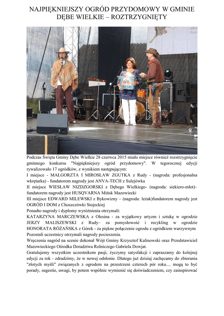 NAJPIĘKNIEJSZY OGRÓD PRZYDOMOWY W GMINIE DĘBE WIELKIE – ROZTRZYGNIĘTY Podczas Święta Gminy Dębe Wielkie 28 czerwca 2015 miało miejsce również rozstrzygnięcie gminnego konkursu "Najpiękniejszy ogród przydomowy". W tegorocznej edycji rywalizowało 17 ogródków, z wynikiem następującym: I miejsce - MAŁGORZTA I MIROSŁAW ZGUTKA z Rudy - (nagroda: profesjonalna wkrętarka) - fundatorem nagrody jest ANVA-TECH z Sulejówka II miejsce WIESŁAW NIZDZGORSKI z Dębego Wielkiego- (nagroda: siekiero-młot)– fundatorem nagrody jest HUSQVARNA Mińsk Mazowiecki III miejsce EDWARD MILEWSKI z Bykowizny – (nagroda: leżak)fundatorem nagrody jest OGRÓD I DOM z Choszczówki Stojeckiej Ponadto nagrody i dyplomy wyróżnienia otrzymali: KATARZYNA MARCZEWSKA z Olesina - za wyjątkowy artyzm i sztukę w ogrodzie JERZY MALISZEWSKI z Rudy– za pomysłowość i recykling w ogrodzie HONORATA RÓŻAŃSKA z Górek - za piękne połączenie ogrodu z ogródkiem warzywnym Pozostali uczestnicy otrzymali nagrody pocieszenia. Wręczenia nagród na scenie dokonał Wójt Gminy Krzysztof Kalinowski oraz Przedstawiciel Mazowieckiego Ośrodka Doradztwa Rolniczego Gabriela Dowjat. Gratulujemy wszystkim uczestnikom pasji, życzymy satysfakcji i zapraszamy do kolejnej edycji za rok - zdradzimy, że w nowej odsłonie. Dlatego już dzisiaj zachęcamy do zbierania "złotych myśli" związanych z ogrodem na przestrzeni czterech pór roku.... mogą to być porady, sugestie, uwagi, by potem wspólnie wymienić się doświadczeniem, czy zainspirować