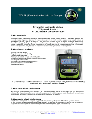 Oryginalna instrukcja obsługi Wilgotnościomierz HYDROMETER GM-200 #071054 1. Wprowadzenie Wilgotnościomierz opracowany został do pomiaru wilgotności betonu, gipsu, cementu i styropianu. Możliwa jest również analiza wilgotności drewna. Do niekwestionowanych mocnych punktów zastosowanej metody należą jej wysoka rozdzielczość, łatwość w obsłudze i fakt, że pomiar odbywa się bez ingerencji w badaną powierzchnię. Niewielkie gabaryty obudowy, ergonomiczny kształt oraz guma przeciwpoślizgowa na bokach urządzenia gwarantują pewne trzymanie w ręce oraz wygodę posługiwania się. Aby pomiar był jak najbardziej komfortowy zastosowano miernik przyspieszenia, który troszczy się o prawidłowe ustawienie wyświetlacza podczas pomiaru. 2. Właściwości produktu Wymiary: 142x79x24 mm Waga (z kompletem baterii): 200g Zasilanie: dwie baterie AA Przeciętna żywotność nowych baterii: 20 godzin Wyświetlacz: monochromatyczny, rozdzielczość 128x63 pikseli z podświetlaniem tła Automatyczne ustawianie się wyświetlacza Temperatura pracy: od 5ºC do 40ºC 9 skali pomiarowych 1 - pasek stanu; 2 - wartość zmierzona; 3 - nazwa wybranej skali; 4 - 'przycisk SELECT MATERIAL'; 5 - przycisk 'ON'; 6 - przycisk 'SELECT DISPLAY' 3. Włączanie wilgotnościomierza Aby włączyć urządzenie nacisnąć przycisk "ON". Wilgotnościomierz włącza się automatycznie bez wykonywania kalibracji. Po włączeniu urządzenia na wyświetlaczu pojawia się ostatnio wybrana skala. Gdy baterie są zbyt mocno rozładowane, urządzenie zasygnalizuje taki stan rzeczy i następnie się wyłączy. 4. Wyłączanie wilgotnościomierza Urządzenie automatycznie się wyłącza, gdy przez dłuższy czas nie jest używane. Wydłuża to żywotność baterii. W celu ręcznego wyłączenia wilgotnościomierza nacisnąć i przytrzymać przycisk ‘SELECT MATERIAL’. Przy każdym wyłączaniu zasilania w pamięci zapisywane są ostatnie ustawienia (skala, język, progi alarmów). WOLFF GmbH & Co. KG | D-74360 Ilsfeld | Ungerhalde 1 | Tel. +49 (0)7062-91556-0 | Faks +49 (0)7062-91556-10 | E-mail [email protected] | Internet www.wolff-tools.de 5. Sposób pomiaru: Urządzenie bada właściwości materiałów dielektrycznie poprzez pomiar pola elektrycznego emitowanego przez kulkę metalową. Właściwości dielektryczne zależą od wilgotności, gęstości objętościowej materiału oraz elementów metalowych. UWAGA!! Elementy metalowe (np. gwoździe, śruby) w strefie pomiarowej urządzenia zawyżają zmierzoną wartość. Wyniki pomiarów wyświetlane są na wyświetlaczu. Miernik wilgotności posiada 13 skal umożliwiających określenie wilgotności danego materiału. Wybrany zakres wyświetlany jest na dole na wyświetlaczu. W celu przeprowadzenia pomiaru docisnąć metalową kulkę do badanego materiału i przytrzymać naciśnięty przycisk "ON". UWAGA!! Kąt pomiędzy wilgotnościomierzem a badaną powierzchnią powinien zawierać się w przedziale od 45º do 90º. Po zwolnieniu przycisku 'ON" wilgotnościomierz automatycznie przechodzi do trybu 'HOLD'. Wybór skali Dzięki uwzględnieniu wielu skali w urządzeniu można zrezygnować z tabeli korekcyjnej. Dzięki temu pomiar jest nie tylko dokładniejszy, ale również prostszy i wygodniejszy. Wybrany zakres wyświetlany jest na dole na wyświetlaczu. W celu zmiany skali pomiarowej należy krótko nacisnąć przycisk ‘SELECT MATERIAL’. UWAGA!! Po włączeniu urządzenia na wyświetlaczu pojawia się ostatnio wybrana skala. Tabela 1 Nazwa i opis zakresów pomiarowych dostępnych w GM-200 Poz. Nazwa skali Opis 1 Skala względna Skala podstawowa. Pokazuje wilgotność względną materiału. 2 Jastrych anhydrytowy %wag. Skala "beton" wykorzystywana jest do pomiaru powierzchni jastrychów anhydrytowych. Dane podawane są w procentach wagowych wody. 3 Jastrych anhydrytowy %CM Skala "beton" wykorzystywana jest do pomiaru powierzchni jastrychów anhydrytowych. Podawane wartości CM są wartościami przybliżonymi. 4 Jastrych cementowy %wag Skala "beton" wykorzystywana jest do pomiaru powierzchni jastrychów cementowych. Dane podawane są w procentach wagowych wody. 5 Jastrych cementowy %CM Skala "beton" wykorzystywana jest do pomiaru powierzchni jastrychów cementowych. Podawane wartości CM są wartościami przybliżonymi. Skala "beton" wykorzystywana jest do pomiaru powierzchni betonowych. Określa wyrażony w procentach stosunek wagi wody zawartej w badanym materiale do wagi tego materiału w stanie całkowicie suchym. Skala rozciąga się od 0% do 6%, przy czym wartość 6% odpowiada w 6 Beton %wag. przybliżeniu maksymalnej fizycznej zdolności do wchłaniania wody przez beton. Zawartości wilgoci określonej w taki sposób nie wolno jest pomylić z emisją masy ani z żadnymi innymi jednostkami miar wykorzystywanymi podczas pomiarów innymi metodami oraz innymi urządzeniami pomiarowymi. 7 Tynk gipsowy %wag. Skala służy do kontroli wilgotności tynku gipsowego. Zawartość wody wyrażona jest w procentach wagowych. 8 Drewno twarde %wag. Skala służy do kontroli wilgotności drewna o gęstości od 0,6 do 0,9 [103 kg/m3] (np. dąb). Zawartość wody wyrażona jest w procentach. 9 Drewno miękkie %wag. Skala służy do kontroli wilgotności drewna o gęstości od 0,4 do 0,55 [103 kg/m3] (np. świerk). Zawartość wody wyrażona jest w procentach. "Skala CM" w tym wskaźniku wilgotności nie zastępuje określania wilgotności szczątkowej jastrychów urządzeniem CM w sposób opisany np. w objaśnieniach do normy DIN 18365 "Roboty przy układaniu wykładzin". WOLFF GmbH & Co. KG | D-74360 Ilsfeld | Ungerhalde 1 | Tel. +49 (0)7062-91556-0 | Faks +49 (0)7062-91556-10 | E-mail [email protected] | Internet www.wolff-tools.de Funkcja 'HOLD' Dzięki funkcji 'Hold' wyświetlana jest ostatnia zmierzona wartość. Funkcja 'Hold' aktywuje się automatycznie po zwolnieniu przycisku ‘ON’. Przejście urządzenia w ten tryb pracy sygnalizowane jest wyświetleniem 