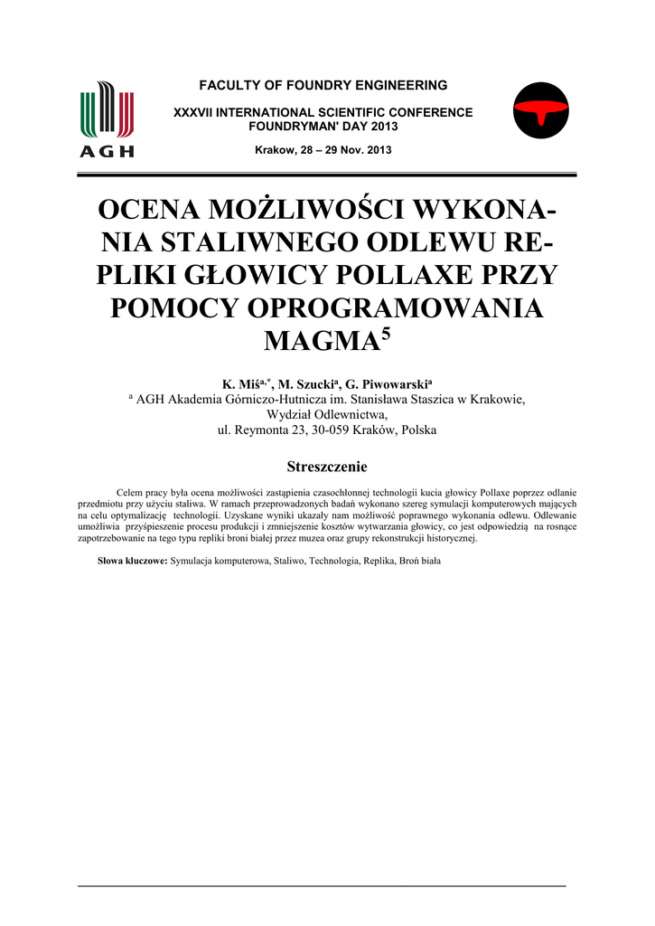 FACULTY OF FOUNDRY ENGINEERING XXXVII INTERNATIONAL SCIENTIFIC CONFERENCE FOUNDRYMAN' DAY 2013 Krakow, 28 – 29 Nov. 2013 OCENA MOŻLIWOŚCI WYKONANIA STALIWNEGO ODLEWU REPLIKI GŁOWICY POLLAXE PRZY POMOCY OPROGRAMOWANIA MAGMA5 a K. Miśa,*, M. Szuckia, G. Piwowarskia AGH Akademia Górniczo-Hutnicza im. Stanisława Staszica w Krakowie, Wydział Odlewnictwa, ul. Reymonta 23, 30-059 Kraków, Polska Streszczenie Celem pracy była ocena możliwości zastąpienia czasochłonnej technologii kucia głowicy Pollaxe poprzez odlanie przedmiotu przy użyciu staliwa. W ramach przeprowadzonych badań wykonano szereg symulacji komputerowych mających na celu optymalizację technologii. Uzyskane wyniki ukazały nam możliwość poprawnego wykonania odlewu. Odlewanie umożliwia przyśpieszenie procesu produkcji i zmniejszenie kosztów wytwarzania głowicy, co jest odpowiedzią na rosnące zapotrzebowanie na tego typu repliki broni białej przez muzea oraz grupy rekonstrukcji historycznej. Słowa kluczowe: Symulacja komputerowa, Staliwo, Technologia, Replika, Broń biała __________________________________________________________________________