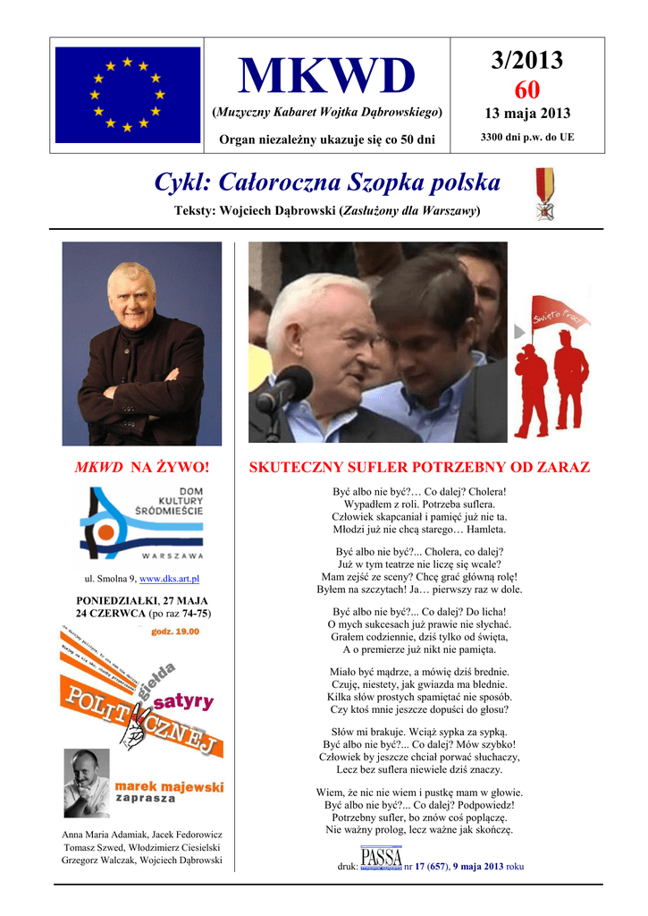 MKWD 3/2013 60 (Muzyczny Kabaret Wojtka Dąbrowskiego) 13 maja 2013 Organ niezależny ukazuje się co 50 dni 3300 dni p.w. do UE Cykl: Całoroczna Szopka polska Teksty: Wojciech Dąbrowski (Zasłużony dla Warszawy) MKWD NA ŻYWO! SKUTECZNY SUFLER POTRZEBNY OD ZARAZ Być albo nie być?… Co dalej? Cholera! Wypadłem z roli. Potrzeba suflera. Człowiek skapcaniał i pamięć już nie ta. Młodzi już nie chcą starego… Hamleta. ul. Smolna 9, www.dks.art.pl PONIEDZIAŁKI, 27 MAJA 24 CZERWCA (po raz 74-75) Być albo nie być?... Cholera, co dalej? Już w tym teatrze nie liczę się wcale? Mam zejść ze sceny? Chcę grać główną rolę! Byłem na szczytach! Ja… pierwszy raz w dole. Być albo nie być?... Co dalej? Do licha! O mych sukcesach już prawie nie słychać. Grałem codziennie, dziś tylko od święta, A o premierze już nikt nie pamięta. Miało być mądrze, a mówię dziś brednie. Czuję, niestety, jak gwiazda ma blednie. Kilka słów prostych spamiętać nie sposób. Czy ktoś mnie jeszcze dopuści do głosu? Słów mi brakuje. Wciąż sypka za sypką. Być albo nie być?... Co dalej? Mów szybko! Człowiek by jeszcze chciał porwać słuchaczy, Lecz bez suflera niewiele dziś znaczy. Anna Maria Adamiak, Jacek Fedorowicz Tomasz Szwed, Włodzimierz Ciesielski Grzegorz Walczak, Wojciech Dąbrowski Wiem, że nic nie wiem i pustkę mam w głowie. Być albo nie być?... Co dalej? Podpowiedz! Potrzebny sufler, bo znów coś poplączę. Nie ważny prolog, lecz ważne jak skończę. druk: nr 17 (657), 9 maja 2013 roku str. 2 MKWD, nr 3 (60) /2013, Warszawa, 13 maja 2013 roku (3300 dni po wstąpieniu do UE) KONKURS LITERACKI RYMUJ JAK SZYMBORSKA Z okazji wydania książki Błysk rewolwru, zawierającej żarty i zabawy słowne naszej Noblistki Wisławy Szymborskiej, redakcja Gazety Wyborczej ogłosiła błyskawiczny konkurs pod hasłem Rymuj jak Szymborska, z zadaniem wykorzystania jej ulubionych form literackich, jak adoralia, altruitki, rajzefiberki lub obelżyki. Nadesłano prawie 1000 utworów. Jury pod przewodnictwem Michała Rusinka wyróżniło 21 prac. I nagrodę zdobyła pani Ewa Gulczyńska. Adoralia a la Szymborska Wojciecha Dąbrowskiego uzyskały specjalne wyróżnienie (i książkę Błysk rewolwru w nagrodę). ADORALIA A LA SZYMBORSKA T: Chciałem adorować Teklę, Lecz się czuję z nią jak w piekle. A: Chciałem adorować Adę, Lecz mi Radek wszedł w paradę. P: Chciałem adorować Paulę, Lecz wolała pływać crawlem. U: Chciałem adorować Ulę, Lecz olała mnie w ogóle. B: Chciałem adorować Basię, Ale z Basią żyć nie da się. R: Chciałem adorować Ritę, Ale odwaliła kitę. W: Chciałem adorować Wandę, Lecz nie wyszedł mi ten tandem. C: Chciałem adorować Czesię, Lecz nazwała mnie obwiesiem. S: Chciałem adorować Sandrę, Lecz po Sandrze miewam chandrę. Z: Chciałem adorować Ziutę, Lecz wzgardziła moim fiutem. D: Chciałem adorować Darię, Lecz zbyt wiele stwarza barier. E: Chciałem adorować Ewę, Lecz ma obie ręce lewe. F: Chciałem adorować Florę, Lecz prawdziwym jest upiorem. G: Chciałem adorować Gosię, Lecz ma ciągle muchy w nosie. H: Chciałem adorować Hanię, Lecz się wzbrania przed kochaniem (w wersji sprośnej: przed ruchaniem). I: Chciałem adorować Igę, Lecz mi pokazała figę. J: Chciałem adorować Jadzię, Lecz ją uwiódł szejk w Rijadzie. K: Chciałem adorować Krysię, Lecz szybko sprzykrzyła mi się. L: Chciałem adorować Lilkę, Lecz mówiła wciąż: Za chwilkę! Ł: Chciałem adorować Łucję, Lecz mnie rażą jej ablucje. M: Chciałem adorować Martę, Lecz mnie zawsze zbywa żartem. N: Chciałem adorować Ninę, Lecz z nią popadłbym w ruinę. O: Chciałem adorować Olę, Ale mnie wywiodła w pole! (w wersji sprośnej: Ale rzekła: ja …) przedruk: nr 113 (7834), 16 maja 2013 roku nr 19 (659), 23 maja 2013 roku MKWD, nr 3 (60) /2013, Warszawa, 13 maja 2013 roku (3300 dni po wstąpieniu do UE) str. 3 A: Ty aniołku! Aparacie! Ty andrusie! - pewnie znacie? B: Dobrze jest używać stale: Ty bajbusie! Ty bęcwale! Ty bucusiu! Ty bajoku! Bajerancie! - ujdzie w tłoku! C: Ty ciposzu! Ty ciemnoto! Chlapo! Ciumciu! Chwieju! Cioto! D: Ty dewocie! Dupku! Dziwo! Dogmatyku! - daj na piwo! E: Ty eunuchu! Elegancie! F: Ty fircyku! Fatygancie! G: Ty gagatku! Ględo! Gadzie! Ty gudłaju! – nieco rzadziej! OBELŻYKI WG SZYMBORSKIEJ Obelżyki te na świstkach zapisała nam Noblistka. Więc od dzisiaj, pamiętajmy: niebanalnie przeklinajmy! Choćby ktoś ci wszedł za skórę, miej kulturę: żadnych kurew! Z etykietą iście dworską, dziś cytować masz Szymborską. H: Hałaburdo! Harpaganie! I: Ty icusiu! Ty iwanie! J: Ty jewreju! Jezuito! Ty jebako! - ujdzie ci to! K: Możesz w każdym użyć sporze: Ty kapucho! Ty kiziorze! Na ulicy, w sklepie, w parku: Ty kanciarzu! Ty kanarku! Ty kitajcu! Kutwo! Kruku! Kutasiński! - na facebooku. L: Liczyrzepo! Liczykrupo! Ł: Ty łazęgo! Łajzo! Łupo! M: Możesz w metrze mówić czule: Ty moskalu! Męcie! Mule! Muzułmanie! Ty matole! Ty miernoto! – zwłaszcza w szkole. N: Ty niedojdo! Niedorajdo! Nadgorliwcu! Ty oblajdo! O: Ośle! – dobre w autobusie. Obskurancie! Ochlapusie! P: Przy kieliszku i przy śledziu: Ty palancie! Pluskwo! Pedziu! Ty przygłupie! Ty piździelcu! Patafianie! Pomyleńcu! R: Ty rypajło! Ty rekinie! Rebe! – możesz dodać w gminie. S: Szmalcowniku! Srako! Szczurze! Ty szczekaczu! - znacznie dłużej! T: Ty tłumoku! Talmudysto! Ty truposzu! – mów artystom. U: A gdy ktoś podpadnie w tańcu: Ty usrańcu! Ujebańcu! W: Wajadaczu! Wyciruchu! Tak wygarnij mu do słuchu. Ty wałęso! Włóczykiju! Wal się, wieprzu! - i lżej ci już! Z: Tak ujawnisz prawdę nagą: Zarzygańcu! Zdziro! Zgago! Ż: Ty Żebraku! Żmijo! Żłobie! A na pewno ulżysz sobie! str. 4 MKWD, nr 3 (60) /2013, Warszawa, 13 maja 2013 roku (3300 dni po wstąpieniu do UE) KLUBOTEKA MA JUŻ ROCZEK! nr 17 (657), 9 maja 2013 roku Z założycielkami Fundacji i animatorkami dzi
