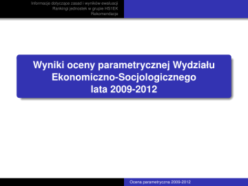 Informacje dotyczace ˛ zasad i wyników ewaluacji Rankingi jednostek w grupie HS1EK Rekomendacje Wyniki oceny parametrycznej Wydziału Ekonomiczno-Socjologicznego lata 2009-2012 Ocena parametryczna 2009-2012 Informacje dotyczace ˛ zasad i wyników ewaluacji Rankingi jednostek w grupie HS1EK Rekomendacje Plan prezentacji 1 Informacje dotyczace ˛ zasad i wyników ewaluacji 2 Rankingi jednostek w grupie HS1EK 3 Rekomendacje Ocena parametryczna 2009-2012 Informacje dotyczace ˛ zasad i wyników ewaluacji Rankingi jednostek w grupie HS1EK Rekomendacje Podstawowe informacje dotyczace ˛ zasad i wyników ewaluacji Łaczna ˛ liczba ewaluowanych jednostek wynosiła 962, w tym grupa 303 jednostek z obszaru nauk humanistycznych i społecznych. W jej ramach wyodrebniono ˛ tzw. Grupy Wspólnej Oceny GWO. Wydział Ekonomiczno-Socjologiczny zaliczony został do GWO, oznaczonej akronimem HS1EK, w której skład weszły 93 jednostki. Ocena opierała sie˛ na 4 kryteriach, na które złożyło sie˛ łacznie ˛ 37 aktywności i osiagni ˛ eć. ˛ Ocena parametryczna 2009-2012 Informacje dotyczace ˛ zasad i wyników ewaluacji Rankingi jednostek w grupie HS1EK Rekomendacje Podstawowe informacje dotyczace ˛ zasad i wyników ewaluacji Liczba publikacji uczestniczacych ˛ w ocenie 3N − 2N0 , gdzie: N – średnia liczba osób zatrudnionych przy realizacji badań naukowych, w przeliczeniu na pełny wymiar czasu pracy i w odniesieniu do całorocznego okresu zatrudnienia, N0 – liczba pracowników naukowo-dydaktycznych bez publikacji w czasopismach na listach A, B, C, w monografiach lub czas. zagranicznych poza listami A i C. Ocena parametryczna 2009-2012 Informacje dotyczace ˛ zasad i wyników ewaluacji Rankingi jednostek w grupie HS1EK Rekomendacje Kryterium I – osiagni ˛ ecia ˛ naukowe Kryterium II – potencjał naukowy Kryterium I, ocena: 26, 81 1. 2. 3. 4. 5. publikacje w czasopismach z listy A, publikacje w czasopismach z listy B, publikacje w czasopismach z listy C, monografie w j. angielskim, monografie w j. polskim. Kryterium II, ocena: 562 1. posiadane uprawnienia, 2. rozwój własnej kadry naukowej, 3. udział w rozwoju naukowym osób niebed ˛ acych ˛ pracownikami jednostki, 4. inne. Ocena parametryczna 2009-2012 Informacje dotyczace ˛ zasad i wyników ewaluacji Rankingi jednostek w grupie HS1EK Rekomendacje Kryterium III – materialne efekty działalności naukowej Kryterium IV – pozostałe efekty działalności naukowej Kryterium III, ocena: 0, 77 1. sprzedaż wyników badań naukowych lub prac rozwojowych, 2. projekty krajowe lub zagraniczne. Kryterium IV, ocena: 95 Ocena dziesieciu ˛ najważniejszych osiagni ˛ eć ˛ w skali 0-100. Ocena parametryczna 2009-2012 Informacje dotyczace ˛ zasad i wyników ewaluacji Rankingi jednostek w grupie HS1EK Rekomendacje Zestawienie ocen Zestawienie ocen dla Wydziału Ek.-Soc. Kryterium I Kryterium II Kryterium III Kryterium IV 26,81 562 0,77 95 Zestawienie ocen dla Wydziału Zarzadzania, ˛ UŁ Kryterium I Kryterium II Kryterium III Kryterium IV 27,87 336 0,84 77,5 Ocena parametryczna 2009-2012 Informacje dotyczace ˛ zasad i wyników ewaluacji Rankingi jednostek w grupie HS1EK Rekomendacje Zestawienie ocen Zestawienie ocen dla Wydziału Ek.-Soc. Kryterium I Kryterium II Kryterium III Kryterium IV 26,81 562 0,77 95 Zestawienie ocen dla Kolegium Analiz Ekonomicznych, SGH Kryterium I Kryterium II Kryterium III Kryterium IV 40,82 330 1,85 95 Ocena parametryczna 2009-2012 Informacje dotyczace ˛ zasad i wyników ewaluacji Rankingi jednostek w grupie HS1EK Rekomendacje Porównania parami Ocena ostateczna jednostki jest rezultatem zastosowania algorytmu porównań parami z pozostałymi jednostkami, znajdujacymi ˛ sie˛ w tej samej grupie GWO, z wykorzystaniem „ważonej relacji przewyższania”. W grupie porównywanych jednostek znajdowały sie˛ dodatkowo dwie jednostki referencyjne typu A i typu B, których parametry zostały zdefiniowane przez KEJN. Jednostki referencyjne uczestniczyły w porównaniach na podobnych zasadach, jak inne jednostki. Ocena parametryczna 2009-2012 Informacje dotyczace ˛ zasad i wyników ewaluacji Rankingi jednostek w grupie HS1EK Rekomendacje Parametry jednostek referencyjnych dla grupy HS1EK Typ JR Kryterium I Kryterium II Kryterium III Kryterium IV A 30,93 150 0,36 60 B 13,52 30 0,18 30 Ocena parametryczna 2009-2012 Informacje dotyczace ˛ zasad i wyników ewaluacji Rankingi jednostek w grupie HS1EK Rekomendacje Ocena ostateczna ewaluacji Ocena ostateczna Wydziału 30,88 jest suma˛ ważona˛ liczby punktów uzyskanych w algorytmie porównań parami. Wagi ocen dla poszczególnych kryteriów: – 65 dla kryterium I, – 15 dla kryterium II, – 5 dla kryterium III, – 15 dla kryterium IV. Ocena parametryczna 2009-2012 Informacje dotyczace ˛ zasad i wyników ewaluacji Rankingi jednostek w grupie HS1EK Rekomendacje Zasady przyporzadkowania ˛ kategorii naukowej Kategoria A Jednostki, dla których ocena ostateczna była równa lub wyższa od oceny jednostki referencyjnej typu A, zostały zaliczone do kategorii A. Kategoria C Jednostki, dla których ocena ostateczna była niższa od oceny jednostki referencyjnej typu B, zostały zaliczone do kategorii C. Kategoria B Pozostałe jednostki otrzymały kategorie˛ B. Ocena parametryczna 2009-2012 Informacje dotyczace ˛ zasad i wyników ewaluacji Rankingi jednostek w grupie HS1EK Rekomendacje Fragment rankingu jednostek w grupie HS1EK Nr Nazwa jednostki 1 2 3 4 5 6 7 8 9 10 ... 28 29 30 SGH; Kolegium Analiz Ekonomicznych SGH; Kolegium Zarzadzania ˛ i Finansów UE w Poznaniu; Wydział Towaroznawstwa UE w Poznaniu; Wydział Zarzadzania ˛ UW; Wydział Nauk Ekonomicznych UE we Wrocławiu; Wydział Inżynieryjno-Ekonomiczny SGH; Kolegium Nauk o Przedsiebiorstwie ˛ UE; Wydział Ekonomii Uniwersytet Szczeciński; Wydział Nauk Ekonom. i Zarzadz. ˛ SGGW w Warszawie; Wydział Zastosowań Informatyki i Matematyki ... Uniwersytet Łódzki; Wydział Ekonomiczno-Socjologiczn