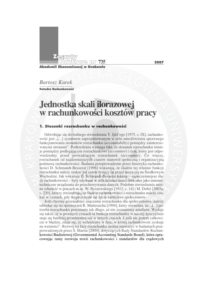 Zesz yty Naukowe nr 735 2007 Akademii Ekonomicznej w Krakowie Bartosz Kurek Katedra RachunkowoÊci Jednostka skali ilorazowej w rachunkowoÊci kosztów pracy 1. Stosunki rozrachunku w rachunkowoÊci Odwo∏ujàc si´ do trafnego stwierdzenia Y. Ijiri’ego [1975, s. IX], rachunkowoÊç jest „[...] systemem zaprojektowanym w celu umo˝liwienia sprawnego funkcjonowania stosunków rozrachunku (accountability) pomi´dzy zainteresowanymi stronami”. PodkreÊlenia wymaga fakt, ˝e stosunek rozrachunku istnieje pomi´dzy podlegajàcym rozrachunkowi (accountor) i tym, który jest odpowiedzialny przed prowadzàcym rozrachunek (accountee). Co wi´cej, rozrachunek od najdawniejszych czasów stanowi∏ spo∏ecznà i organizacyjnà podstaw´ rachunkowoÊci. Badania przeprowadzone przez historyka rachunkowoÊci D. Schmandt-Besserat [1996] wskazujà, ˝e Êladów tej w∏aÊnie funkcji rozrachunku nale˝y szukaç ju˝ osiem tysi´cy lat przed naszà erà na Ârodkowym Wschodzie. Jak wskazuje D. Schmandt-Besserat tokeny – najwczeÊniejsze Êlady rachunkowoÊci – by∏y u˝ywane w celu liczenia iloÊci dóbr oraz jako mnemotechniczne urzàdzenia do przechowywania danych. Podobne stwierdzenia mo˝na odnaleêç w pracach m.in. W. Byszewskiego [1912, s. 14] i M. Dobii [2003a, s. 220], którzy stwierdzajà, ˝e Êladów rachunkowoÊci i rozrachunku nale˝y szukaç w czasach, gdy rozpoczyna∏o si´ ˝ycie kulturowe spo∏eczeƒstw. JeÊli chcemy przewidzieç znaczenie rozrachunku dla spo∏eczeƒstwa, nale˝y odwo∏aç si´ do spostrze˝eƒ R. Mattessicha [1994], który stwierdza, ˝e: „[...] potrzeba rozrachunku pozostanie tak d∏ugo, a˝ nie zostaniemy anio∏ami. Wydaje si´ tak˝e, i˝ w pewnych czasach ta funkcja rozrachunku w naszej dyscyplinie staje si´ bardziej prominentna ni˝ w innych czasach. I jeÊli nie jestem ca∏kowicie w b∏´dzie, zdaje si´, ˝e wchodzimy w faz´, w której rachunkowoÊç zyskuje na wa˝noÊci”. Rozwój tej fazy rozrachunku mo˝na zauwa˝yç w badaniach przeprowadzonych przez S. Martin [2004], dotyczàcych Rady Standardów RachunkowoÊci Bud˝etowej (Governmental Accounting Standards Board), która opracowujàc ramy rozwoju teorii rachunkowoÊci i standardów dla rzàdowych Bartosz Kurek 70 jednostek, zwróci∏a szczególnà uwag´ na zwi´kszony poziom odpowiedzialnoÊci (accountability) rzàdowych jednostek (GASB Concepts Statement, §17, §32, §56). S. Martin wyjaÊnia ten zwi´kszony poziom odpowiedzialnoÊci, podkreÊlajàc istotnà spraw´ dostarczania publicznych pieni´dzy dla tych jednostek i oczekiwaƒ obywateli dotyczàcych skutecznego i wydajnego wykorzystania pieni´dzy pochodzàcych z podatków. Bardzo podobny poglàd na rozrachunki w rachunkowoÊci prezentuje S. Sunder [2002, s. 308–313], który stwierdza, ˝e „rachunkowoÊç jest dostawcà wiedzy powszechnej”. Ta wa˝na funkcja rachunkowoÊci jest niezaprzeczalnie zwiàzana z kontraktowà koncepcjà organizacji [Sunder 2003, s. 188 i nast.]. Istotny podkreÊlenia jest fakt, ˝e rozpatrywane kontrakty istniejà w ka˝dej ga∏´zi gospodarki i w ka˝dym spo∏eczeƒstwie (rys. 1). Uczestnicy kontraktów dostarczajà zasobów, oczekujàc w zamian otrzymania wi´kszych zysków ni˝ koszty utraconych korzyÊci [Sunder 2004, s. 231]. Konkludujàc mo˝na stwierdziç, ˝e rachunkowoÊç jest naukà, która pozwala zmierzyç wp∏ywy i wydatkowanie zasobów w organizacji, pod warunkiem istnienia okreÊlonej jednostki i sposobu pomiaru tych przep∏ywów. Menad˝erowie Akcjonariusze Rzàd Wierzyciele Audytorzy Sprzedawcy Pracownicy Klienci Rys. 1. Organizacja jako zbiorowoÊç kontraktów èród∏o: opracowanie w∏asne na podstawie: [Sunder 2004, s. 233]. Na szczególnà uwag´ zas∏ugujà w tym kontekÊcie stwierdzenia uznanych badaczy rachunkowoÊci: A. Jarugi [2002] i S. Surdykowskiej [1999]. Wspomniane autorki wskazujà na stosunki rozrachunku w aspekcie mi´dzynarodo- Jednostka skali ilorazowej w rachunkowoÊci... 71 wym. A. Jaruga [2002, s. 1] uwypukla znaczenie rachunkowoÊci dla globalnych inwestycji, porównujàc rachunkowoÊç do „mi´dzynarodowego j´zyka biznesu”, który zapewniç mo˝e harmonizacj´, a dzi´ki temu porównywalnoÊç sprawozdaƒ finansowych. S. Surdykowska [1999, s. 33] wskazuje z kolei na znaczenie metody bilansowej w rachunkowoÊci. Metoda ta pozwala bowiem na realizacj´ podstawowego celu rachunkowoÊci, którym jest „tworzenie p∏aszczyzny porozumiewania si´ w dzia∏alnoÊci gospodarczej osób podejmujàcych zarówno indywidualne, jak i zbiorowe wysi∏ki zmierzajàce do pomna˝ania kapita∏u we w∏asnym lub cudzym imieniu, a tak˝e ustalenie, w jakim zakresie w wynikach tego procesu uczestniczà inni, w tym tak˝e paƒstwo”. Do realizacji tych rozrachunków w rachunkowoÊci konieczny jest pomiar. Nale˝y zauwa˝yç, ˝e R. Mattessich [1964], wià˝àc teori´ rachunkowoÊci z teorià pomiaru ekonomicznego, wniós∏ istotny wk∏ad w rozwój teorii rachunkowoÊci. OkreÊli∏ on bowiem przedmiot teorii rachunkowoÊci jako teori´ kwantytatywnego opisu wielkoÊci ekonomicznych charakteryzujàcych ekonomik´ przedsi´biorstwa (podejÊcie retrospektywne). Sformu∏owany zosta∏ tak˝e zbiór za∏o˝eƒ, którym powinien podlegaç pomiar ekonomiczny b´dàcy rachunkowoÊcià. R. Mattessich [2004, s. 29] twierdzi równie˝, ˝e rachunkowoÊç – w odró˝nieniu od innych dyscyplin, tzw. nauk stosowanych – jest czystà naukà, to znaczy charakteryzuje si´ wi´kszym rygorem reprezentowania rzeczywistoÊci. Trzeba tu wspomnieç definicj´ rozpatrywanej dyscypliny sformu∏owanà przez E. Burzym [1980, s. 13], wed∏ug której rachunkowoÊç to: „uniwersalny, elastyczny, podmiotowy system informacyjno-kontrolny, zdeterminowany metodà bilansowà, która jest nierozerwalnie z nim zwiàzanà metodà poznawczà, umo˝liwiajàcà tworzenie liczbowego obrazu powstania, podzia∏u i przep∏ywu wartoÊci oraz wynikajàcych stàd rozrachunków mi´dzy