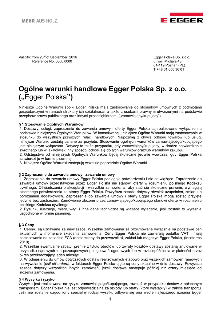 Validity: from 23rd of September, 2016 Reference No. 0800.0000 Egger Polska Sp. z o.o. ul. św. Michała 43 61-119 Poznan (PL) T +48 61 650 36 01 Ogólne warunki handlowe Egger Polska Sp. z o.o. („Egger Polska”) Niniejsze Ogólne Warunki spółki Egger Polska mają zastosowanie do stosunków umownych z podmiotami gospodarczymi w ramach struktury ich działalności, a także z osobami prawnymi utworzonymi na podstawie przepisów prawa publicznego oraz innymi przedsiębiorcami („zamawiający/kupujący”). § 1 Stosowanie Ogólnych Warunków 1. Dostawy, usługi, zaproszenia do zawarcia umowy i oferty Egger Polska są realizowane wyłącznie na podstawie niniejszych Ogólnych Warunków. W konsekwencji, niniejsze Ogólne Warunki mają zastosowanie w stosunku do wszystkich przyszłych relacji handlowych. Najpóźniej z chwilą odbioru towarów lub usług, niniejsze Warunki zostają uznane za przyjęte. Stosowanie ogólnych warunków zamawiającego/kupującego jest niniejszym wyłączone. Dotyczy to także przypadku, gdy zamawiający/kupujący, w drodze potwierdzenia zwrotnego lub w jakikolwiek inny sposób, odnosi się do tych warunków oraz/lub warunków zakupu. 2. Odstępstwa od niniejszych Ogólnych Warunków będą skuteczne jedynie wówczas, gdy Egger Polska zatwierdzi je w formie pisemnej. 3. Niniejsze Ogólne Warunki zastępują wszelkie poprzednie Ogólne Warunki. § 2 Zaproszenie do zawarcia umowy i zawarcie umowy 1. Zaproszenia do zawarcia umowy Egger Polska podlegają potwierdzeniu i nie są wiążące. Zaproszenie do zawarcia umowy przedstawione przez Egger Polska nie stanowi oferty w rozumieniu polskiego Kodeksu cywilnego. Oświadczenia o akceptacji i wszystkie zamówienia, aby stać się skuteczne prawnie, wymagają pisemnego potwierdzenia ze strony Egger Polska. Powyższa zasada dotyczy również uzupełnień, zmian lub porozumień dodatkowych. Zaproszenia do zawarcia umowy i oferty Egger Polska mogą zostać przyjęte jedynie bez zastrzeżeń. Zamówienie złożone przez zamawiającego/kupującego stanowi ofertę w rozumieniu polskiego Kodeksu cywilnego. 2. Rysunki, ilustracje, miary, wagi i inne dane techniczne są wiążące wyłącznie, jeśli zostało to wyraźnie uzgodnione w formie pisemnej. § 3 Ceny 1. Cenniki są uznawane za niewiążące. Wszelkie zamówienia są przyjmowane wyłącznie na podstawie cen aktualnych w momencie składania zamówienia. Ceny Egger Polska nie zawierają podatku VAT i mają zastosowanie na zasadzie FCA (dostarczony do przewoźnika), zakład lub magazyn Egger Polska, (Incoterms 2010). 2. Wszelkie ewentualne rabaty, premie z tytułu obrotów lub zwroty kosztów dostawy zostaną anulowane w przypadku sądowych lub pozasądowych postępowań ugodowych lub w razie opóźnienia w płatności przez okres przekraczający jeden miesiąc. 3. W odniesieniu do umów dotyczących dostaw realizowanych etapowo oraz wszelkich zamówień ramowych na wywołanie (call-off orders), w fakturach Egger Polska ujęte są ceny aktualne w dniu dostawy. Powyższa zasada dotyczy wszystkich innych zamówień, jeżeli dostawa następuje później niż cztery miesiące od złożenia zamówienia. § 4 Wysyłka i ryzyko Wysyłka jest realizowana na ryzyko zamawiającego/kupującego, również w przypadku dostaw z opłaconym transportem. Egger Polska nie jest odpowiedzialna za szkody lub straty (które wystąpiły) w trakcie transportu. Jeśli nie zostanie uzgodniony specjalny rodzaj wysyłki, odbywa się ona wedle najlepszego uznania Egger 1 Polska, bez obowiązku zapewnienia najtańszego sposobu transportu. Koszty transportu muszą zostać zwrócone Egger Polska. Ryzyko przechodzi na zamawiającego/kupującego w momencie przekazania przesyłki przewoźnikowi i/lub opuszczenia sklepu Egger Polska do transportu. Jeśli wysyłka okaże się niemożliwa lub zostanie opóźniona bez winy Egger Polska, ryzyko przechodzi na zamawiającego/ kupującego po powiadomieniu go o gotowości do wysyłki. § 5 Dostawy z nadwyżką, niepełne, częściowe Dostawy z nadwyżką lub niedoborem towarów nieprzekraczającymi 10%, jak również zwyczajowe drobne odchylenia pomiarów są dopuszczalne i nie uprawniają zamawiającego/kupującego do podniesienia roszczeń. Dostawy częściowe są dopuszczalne w rozsądnym zakresie i podlegają oddzielnemu fakturowaniu. § 6 Polecenia odwołania dostawy W przypadku zamówień ramowych na wywołanie (call-off orders) lub podobnych zamówień zamawiający/kupujący jest zobowiązany do odbioru zamówionych towarów w rozsądnym okresie karencji, najpóźniej w ciągu sześciu miesięcy od daty złożenia zamówienia, chyba że indywidualnie uzgodniono inaczej w formie pisemnej. §7 Terminy płatności 1. O ile nie uzgodniono inaczej, termin płatności faktur Egger Polska wynosi 8 dni od daty wystawienia faktury z rabatem 2%, lub 30 dni - bez rabatu. 2. Egger Polska ma prawo, pomimo istnienia odmiennych warunków po stronie zamawiającego/kupującego, w pierwszej kolejności potrącić płatności z wcześniejszego długu; w każdym przypadku Egger Polska zawiadomi zamawiającego/kupującego o naturze dokonanego potrącenia. Jeżeli koszty i odsetki zostały już naliczone, Egger Polska ma prawo do potrącenia w pierwszej kolejności koszty, w następnej kolejności odsetki, a w ostatniej kolejności kwotę główną. 3. Płatność zostanie uznana za dokonaną, gdy Egger Polska będzie dysponować przedmiotową kwotą. W przypadku czeków, płatność zostanie uznana za dokonaną po nieodwołalnej realizacji czeku. Egger Polska przyjmuje weksle i czeki z zastrzeżeniem otrzymania środków pieniężnych, a weksle wyłącznie na podstawie odrębnego porozumienia. 4. Począwszy od terminu płatności, Egger Polska nalicza odsetki w wysokości 5% w skali roku. 5. W przypadku niedotrzymania terminu płatności przez zamawiającego/kupującego, Egger Polska ma prawo, począwszy od tego dnia, do naliczania odsetek od należności handlowych w wysoko