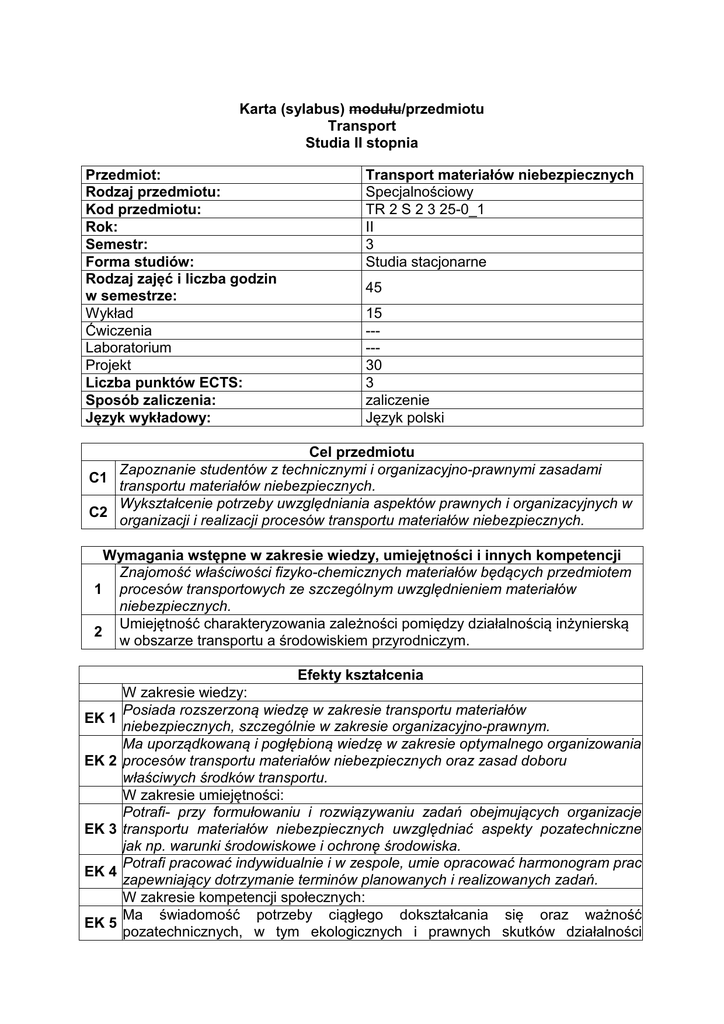 Karta (sylabus) modułu/przedmiotu Transport Studia II stopnia Przedmiot: Rodzaj przedmiotu: Kod przedmiotu: Rok: Semestr: Forma studiów: Rodzaj zajęć i liczba godzin w semestrze: Wykład Ćwiczenia Laboratorium Projekt Liczba punktów ECTS: Sposób zaliczenia: Język wykładowy: Transport materiałów niebezpiecznych Specjalnościowy TR 2 S 2 3 25-0_1 II 3 Studia stacjonarne 45 15 ----30 3 zaliczenie Język polski Cel przedmiotu Zapoznanie studentów z technicznymi i organizacyjno-prawnymi zasadami C1 transportu materiałów niebezpiecznych. Wykształcenie potrzeby uwzględniania aspektów prawnych i organizacyjnych w C2 organizacji i realizacji procesów transportu materiałów niebezpiecznych. Wymagania wstępne w zakresie wiedzy, umiejętności i innych kompetencji Znajomość właściwości fizyko-chemicznych materiałów będących przedmiotem 1 procesów transportowych ze szczególnym uwzględnieniem materiałów niebezpiecznych. Umiejętność charakteryzowania zależności pomiędzy działalnością inżynierską 2 w obszarze transportu a środowiskiem przyrodniczym. Efekty kształcenia EK 1 EK 2 EK 3 EK 4 EK 5 W zakresie wiedzy: Posiada rozszerzoną wiedzę w zakresie transportu materiałów niebezpiecznych, szczególnie w zakresie organizacyjno-prawnym. Ma uporządkowaną i pogłębioną wiedzę w zakresie optymalnego organizowania procesów transportu materiałów niebezpiecznych oraz zasad doboru właściwych środków transportu. W zakresie umiejętności: Potrafi- przy formułowaniu i rozwiązywaniu zadań obejmujących organizacje transportu materiałów niebezpiecznych uwzględniać aspekty pozatechniczne jak np. warunki środowiskowe i ochronę środowiska. Potrafi pracować indywidualnie i w zespole, umie opracować harmonogram prac zapewniający dotrzymanie terminów planowanych i realizowanych zadań. W zakresie kompetencji społecznych: Ma świadomość potrzeby ciągłego dokształcania się oraz ważność pozatechnicznych, w tym ekologicznych i prawnych skutków działalności inżynierskiej w obszarze transportu materiałów niebezpiecznych. Treści programowe przedmiotu Forma zajęć – wykłady Treści programowe Wprowadzenie do problematyki transportu materiałów niebezpiecznych. W1 Podstawowe definicje, pojęcia. Zasady klasyfikacji materiałów niebezpiecznych. Procedury klasyfikacyjne W2 (kryteria, metody badań). Oznakowania materiałów niebezpiecznych. Przepisy krajowe i międzynarodowe regulujące transport materiałów niebezpiecznych (ADR, RID, ADN, IMDG, ICA). Podział materiałów według W3 zagrożeń. Przewozy towarów i materiałów niebezpiecznych. Przepisy drogowe regulujące przewóz materiałów niebezpiecznych. Opakowania materiałów W4 niebezpiecznych. Wymagania odnośnie konstrukcji, wyposażenia i oznakowania pojazdów drogowych. Wymagania odnośnie kierujących pojazdami przewożącymi ładunki niebezpieczne. Wymagania odnośnie załadunku, przewozu, W5 rozładunku materiałów niebezpiecznych. Dokumenty wymagane przy przewozie materiałów niebezpiecznych Czynniki ryzyka i ocena ryzyka w transporcie materiałów niebezpiecznych. W6 Zasady organizacji przewozów. Sposoby i techniki mocowania towarów niebezpiecznych. W7 Przewozy kolejowe ładunków niebezpiecznych. Transport lotniczy ładunków W8 niebezpiecznych. Transport ładunków niebezpiecznych drogą morską. Kolokwium zaliczeniowe. W9 Forma zajęć – projektowanie Treści programowe Zajęcia wprowadzające, zasady zaliczenia przedmiotu, harmonogram zajęć P1 projektowych, wybór tematu projektu. Projekt 1. Opracowanie założeń organizacyjnych i technicznych transportu wybranych materiałów niebezpiecznych w określonych przez P2 prowadzącego warunkach terenowych. Obrona projektu. P3 1 2 Metody dydaktyczne Wykład z prezentacją multimedialną Projekt Obciążenie pracą studenta Średnia liczba godzin na zrealizowanie Forma aktywności aktywności Godziny kontaktowe z wykładowcą, w tym: Godziny kontaktowe z wykładowcą, realizowane w formie zajęć 45 dydaktycznych – łączna liczba godzin w semestrze Godziny kontaktowe z wykładowcą, realizowane w formie np. konsultacji w 6 odniesieniu – łączna liczba godzin w semestrze Praca własna studenta, w tym: Przygotowanie się do zajęć projektowych Przygotowanie się do wykładów Łączny czas pracy studenta Sumaryczna liczba punktów ECTS dla przedmiotu: Liczba punktów ECTS w ramach zajęć o charakterze praktycznym (ćwiczenia, laboratoria, projekty) 1 2 3 1 2 3 19 5 75 3 2 Literatura podstawowa Grzegorczyk K., Buchar R.: Towary niebezpieczne. Transport w praktyce. ADR 2011-2013 wyd. Net Polska. Warszawa 2011 Kwaśniowski S (et.al.):Ładunki niebezpieczne w transporcie towarów. Wyd. Politechnika Wrocławska, 2014 Umowa europejska ADR 2011-2013 tekst oficjalny. T. I i II 2011. Wyd. Net Polska, Warszawa 2011 Literatura uzupełniająca Grzegorczyk K., Buchcar R., Towary niebezpieczne – transport w praktyce, ADR, Błonie 2011 Umowa europejska dotycząca międzynarodowego przewozu drogowego towarów niebezpiecznych (ADR) - European Agreement concerning the International Carriage of Dangerous Goods by Road (ADR), Genewa 2010, Grzegorczyk K., Buchar R.: Towary niebezpieczne – transport drogowy Macierz efektów kształcenia Odniesienie danego efektu kształcenia do Efekt efektów kształcenia zdefiniowanych dla całego programu (PEK) EK 1 TR2A_W03 + TR2A_W04 + EK 2 TR2A_W07++ TR2A_W08++ EK 3 EK4 EK5 TR2A_U09+ + TR2A_U08+ + TR2A_U08+ + TR2A_K01+ TR2A_K02+ Cele przedmiotu Treści programowe Metody dydaktyczne Metody oceny C1, C2 W1÷ W9 1 O1 C1, C2 W1÷W9 1 O1 C1, C2 W1÷W9 P1÷P2 1,2 C1,C2 P1÷P2 2 C1,C2 W1÷W9 P1÷P2 1,2 O1,O2 O2 O1,O2 Metody i kryteria oceny Symbol metody oceny O1 O2 Opis metody oceny Zaliczenie pisemne z wykładów Oddanie projektu Próg zaliczeniowy 50% 100% Autor Dr inż. Barbara Sykut programu: Adres e-mail: [email protected] Jednostka Instytut Transportu, Silników Spalinowych i Ekologii