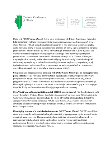 Co to jest POLST stanu Illinois? Jest to skrót pochodzący od: Illinois Practitioner Orders for Life-Sustaining Treatment (Dyspozycje lekarza dotyczące zabiegów podtrzymujących życie w stanie Illinois). POLST jest dokumentem stworzonym w celu ułatwienia rozmów pomiędzy osobą poważnie chorą, w stanie zaawansowanej choroby lub słabą, a jej/jego lekarzem na temat przewidywań i opinii odnośnie do opieki zdrowotnej jej proponowanej. Celem dyskusji jest wspólne stworzenie najodpowiedniejszego dla aktualnego stanu zdrowia pacjenta planu postępowania i wyznaczenie celów opieki zdrowotnej chorego. POLST stanu Illinois jest rozporządzeniem ostatniej woli (dokument określający życzenia osoby odnośnie do opieki zdrowotnej, sporządzony przed znalezieniem się jej w stanie nagłym, czy zagrażającym jej życiu) jak również zaleceniami lekarza, co oznacza, że wola pacjenta będzie chroniona we wszystkich miejscach (np. w szpitalu, w domu, w domu opieki). Czy posiadanie rozporządzenia ostatniej woli POLST stanu Illinois jest do zaakceptowania przez katolika? Tak. Poważnie chorzy katolicy są zachęcani do aktywnego uczestnictwa w podejmowaniu decyzji dotyczących ich opieki zdrowotnej. Zindywidualizowany, dobrze przygotowany POLST stanu Illinois może być źródłem wyraźnych i szczegółowych instrukcji klinicznych, spisanych w oparciu o uprzednie konwersacje, może zostać użyty w razie nagłego wypadku, kiedy okoliczności uniemożliwiają przeprowadzenie rozmowy. Czy POLST stanu Illinois jest taki sam, jak POLST innych stanów? Nie. Każdy stan ma swój własny formularz. W stanie Illinois Katolickie stowarzyszenie zdrowia stanu Illinois, Katolicka konferencja stanu Illinois, katoliccy etycy ds. opieki zdrowotnej i biskupi stanu Illinois byli zaangażowani w tworzenie formularza POLST stanu Illinois. POLST stanu Illinois został stworzony dla sprostowania pewnych moralnych kwestii, o których jest mowa w formularzach POLST innych stanów. Kto mógłby skorzystać z posiadania dokumentu POLST stanu Illinois? POLST stanu Illinois został stworzony dla osób poważnie chorych, co do których przypuszcza się, że pozostał im nie więcej niż jeden rok życia. Osoby poważnie chore, takie jak: nieuleczalnie chore, osoby z zaawansowanymi chorobami, osoby bardzo słabe, o dużym ryzyku utraty zdolności podejmowania decyzji w kwestiach opieki zdrowotnej w przeciągu najbliższego roku, mogą skorzystać z posiadania POLST stanu Illinois. Jeśli posiadam POLST stanu Illinois, to czy powinienem mieć także Pełnomocnictwo dotyczące opieki zdrowotnej? Tak. Pełnomocnictwo dotyczące opieki zdrowotnej jest dokumentem, w którym wyznaczasz kogoś do podejmowania decyzji związanych z opieką zdrowotną w swoim imieniu, na wypadek gdybyś sam nie był w stanie tego zrobić. Wszystkie osoby dorosłe, mogące podejmować decyzje zachęcane są do posiadania Pełnomocnictwa dotyczącego opieki zdrowotnej. O jakiego rodzaju zabiegach i leczeniu mówi POLST stanu Illinois? O resuscytacji krążeniowo-oddechowej (CPR - reanimacja), nagłej pomocy medycznej (włączywszy w to wentylację mechaniczną i przewóz do szpitala), sztucznie zarządzanym odżywianiu i nawadnianiu organizmu, dokumentacji rozmów i innych Rozporządzeniach ostatniej woli. Co Kościół katolicki naucza o zabiegach i procedurach podtrzymujących życie? Kościół katolicki popiera godność życia ludzkiego na ziemi i mówi, że ostatecznym przeznaczeniem nas wszystkich jest życie z Bogiem w niebie. Kościół radzi, aby osoba stosowała te środki chroniące życie, które nie są zbyt uciążliwe dla niego lub dla niej i które dają rozsądną nadzieję na uzyskanie spodziewanego dobra. Równocześnie Kościół naucza, że osoba może zgodnie z prawem zaniechać używania środków chroniących życie, jeśli ona lub on uznają je za zbyt uciążliwe lub nieprzynoszące wystarczającej korzyści. Odżywianie i nawadnianie organizmu nie powinno być zatrzymane lub wycofane w celu spowodowania śmierci. Jeśli jednak, pewne środki zapewniające odżywianie i nawadnianie organizmu stają się nazbyt uciążliwe lub nie przynoszą wystarczającej korzyści, to stosowanie ich przestaje być wymagane wówczas, gdy dotyczy to osoby w ostatnich stadiach życia. Czy dostępne są jakieś poradniki prezentujące katolicką perspektywę na temat podejmowania decyzji dotyczących zabiegów i leczenia podtrzymującego życie? Tak. Etyczne i religijne dyrektywy dla podmiotów katolickich świadczących usługi opieki zdrowotnej, część V dotycząca Kwestii opieki poważnie chorych i umierających wydana przez Konferencję biskupów amerykańskich (Ethical Religious Directives for Catholic Health Care Services (The United States Conference of Catholic Bishops’ Ethical and Religious Directives for Catholic Health Care Services, Part V on Issues in Care for the Seriously Ill and Dying) jest pomocnym streszczeniem. Publikacja ta jest dostępna w języku angielskim, bezpłatnie pod adresem internetowym: http://www.usccb.org/issues-and-action/human-life-and-dignity/healthcare/upload/Ethical-Religious-Directives-Catholic-Health-Care-Services-fifth-edition-2009.pdf Co powinienem zrobić, jeśli chciałbym uzyskać więcej informacji na temat stworzenia POLST stanu Illinois? Jeżeli jesteś zainteresowany posiadaniem POLST stanu Illinois dla siebie samego, porozmawiaj ze swoim lekarzem. Jeżeli masz jakiekolwiek moralne pytania odnośnie do formularza POLST stanu Illinois i dotyczą one Ciebie lub osób najbliższych, prosimy o skontaktowanie się z księdzem w Twojej parafii.