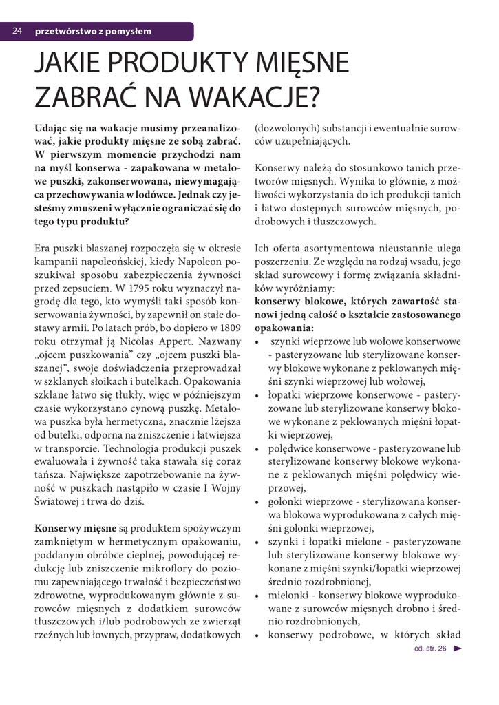 24 przetwórstwo z pomysłem JAKIE PRODUKTY MIĘSNE ZABRAĆ NA WAKACJE? Udając się na wakacje musimy przeanalizować, jakie produkty mięsne ze sobą zabrać. W pierwszym momencie przychodzi nam na myśl konserwa - zapakowana w metalowe puszki, zakonserwowana, niewymagająca przechowywania w lodówce. Jednak czy jesteśmy zmuszeni wyłącznie ograniczać się do tego typu produktu? (dozwolonych) substancji i ewentualnie surowców uzupełniających. Era puszki blaszanej rozpoczęła się w okresie kampanii napoleońskiej, kiedy Napoleon poszukiwał sposobu zabezpieczenia żywności przed zepsuciem. W 1795 roku wyznaczył nagrodę dla tego, kto wymyśli taki sposób konserwowania żywności, by zapewnił on stałe dostawy armii. Po latach prób, bo dopiero w 1809 roku otrzymał ją Nicolas Appert. Nazwany „ojcem puszkowania” czy „ojcem puszki blaszanej”, swoje doświadczenia przeprowadzał w szklanych słoikach i butelkach. Opakowania szklane łatwo się tłukły, więc w późniejszym czasie wykorzystano cynową puszkę. Metalowa puszka była hermetyczna, znacznie lżejsza od butelki, odporna na zniszczenie i łatwiejsza w transporcie. Technologia produkcji puszek ewaluowała i żywność taka stawała się coraz tańsza. Największe zapotrzebowanie na żywność w puszkach nastąpiło w czasie I Wojny Światowej i trwa do dziś. Ich oferta asortymentowa nieustannie ulega poszerzeniu. Ze względu na rodzaj wsadu, jego skład surowcowy i formę związania składników wyróżniamy: konserwy blokowe, których zawartość stanowi jedną całość o kształcie zastosowanego opakowania: • szynki wieprzowe lub wołowe konserwowe - pasteryzowane lub sterylizowane konserwy blokowe wykonane z peklowanych mięśni szynki wieprzowej lub wołowej, • łopatki wieprzowe konserwowe - pasteryzowane lub sterylizowane konserwy blokowe wykonane z peklowanych mięśni łopatki wieprzowej, • polędwice konserwowe - pasteryzowane lub sterylizowane konserwy blokowe wykonane z peklowanych mięśni polędwicy wieprzowej, • golonki wieprzowe - sterylizowana konserwa blokowa wyprodukowana z całych mięśni golonki wieprzowej, • szynki i łopatki mielone - pasteryzowane lub sterylizowane konserwy blokowe wykonane z mięśni szynki/łopatki wieprzowej średnio rozdrobnionej, • mielonki - konserwy blokowe wyprodukowane z surowców mięsnych drobno i średnio rozdrobnionych, • konserwy podrobowe, w których skład Konserwy mięsne są produktem spożywczym zamkniętym w hermetycznym opakowaniu, poddanym obróbce cieplnej, powodującej redukcję lub zniszczenie mikroflory do poziomu zapewniającego trwałość i bezpieczeństwo zdrowotne, wyprodukowanym głównie z surowców mięsnych z dodatkiem surowców tłuszczowych i/lub podrobowych ze zwierząt rzeźnych lub łownych, przypraw, dodatkowych Konserwy należą do stosunkowo tanich przetworów mięsnych. Wynika to głównie, z możliwości wykorzystania do ich produkcji tanich i łatwo dostępnych surowców mięsnych, podrobowych i tłuszczowych. cd. str. 26 26 przetwórstwo z pomysłem wchodzą podroby, surowce mięsne i tłuszczowe ze zwierząt rzeźnych, surowce uzupełniające, przyprawy i substancje dodatkowe dozwolone, • konserwy typu „mięso w sosie własnym”, których zawartość stanowi mięso wieprzowe lub wołowe o zachowanej strukturze tkankowej oraz sos własny, • konserwy tłuszczowe, w których skład wchodzą głównie surowce tkankowe tłuszczowe oraz ewentualnie surowce mięsne, przyprawy, surowce uzupełniające i substancje dodatkowe dozwolone. Biorąc pod uwagę stopień rozdrobnienia wsadu wyróżniamy konserwy: • nierozdrobnione - wsad stanowi jeden blok mięsa (szynka, łopatka, polędwica); • rozdrobnione - wsad stanowi masa przygotowana podobnie jak na kiełbasy. Warto również wiedzieć, że ze względu na zastosowany rodzaj obróbki cieplnej w procesie produkcyjnym konserwy dzielimy się na: • pasteryzowane - poddawane obróbce cieplnej w otwartych kotłach lub autoklawach w temperaturze poniżej 100°C; • sterylizowane - poddawane obróbce cieplnej w autoklawach, z zastosowaniem podwyższonego ciśnienia w temperaturze ponad 100°C; • t yndalizowane - poddawane obróbce cieplnej w temperaturze do 100°C, 3-krotnie w odstępach 24-godzinnych; • trwałe w temperaturze otoczenia - poddawane obróbce cieplnej spełniającej określone wymagania co do czasu i temperatury osiągniętej w centrum geometrycznym produktu. Spośród wielu rodzajów opakowań bezpośrednich możemy wybrać konserwy opakowane w: • puszki blaszane, • folię wielowarstwową, • puszki metalowe z wieczkami z tworzyw sztucznych, • słoje szklane. Zanim jednak spakujemy w wakacyjny bagaż zakupione konserwy musimy je dokładnie sprawdzić. Konserwa powinna być szczelna i nie wykazywać wad zamknięcia puszki, słoja lub pojemnika z folii. Bardzo ważne jest, aby przed otwarciem konserwy sprawdzić, czy wieczko konserwy nie jest wypukłe. Może to świadczyć o zachodzących wewnątrz procesach psucia mikrobiologicznego - wzroście przetrwalników Clostridium botulinum, co po spożyciu wywołuje bardzo niebezpieczne dla życia zatrucie jadem kiełbasianym. Należy również zwrócić uwagę na trwałość produktów. Okresy przechowywania dla poszczególnych rodzajów konserw, licząc od daty produkcji, wynoszą: dla konserw pasteryzowanych przechowywanych w temperaturze 0-6°C: • 9 miesięcy w opakowaniach metalowych, • 6 miesięcy w opakowaniach z tworzyw sztucznych, dla konserw sterylizowanych i trwałych przechowywanych w temperaturze 0-18°C: 18 miesięcy, • 12 miesięcy w przypadku zastosowania dodatku surowców uzupełniających. Po otwarciu produktu, jego cechy organoleptyczne muszą być zgodne z cechami zadeklarowanymi w jego nazwie rodzajowej i innymi informacjami podanymi na etykietach. Wadami konserw są: • występowanie ciał obcych i zanieczyszczeń w treści konserwy i zalewach, • występowanie 