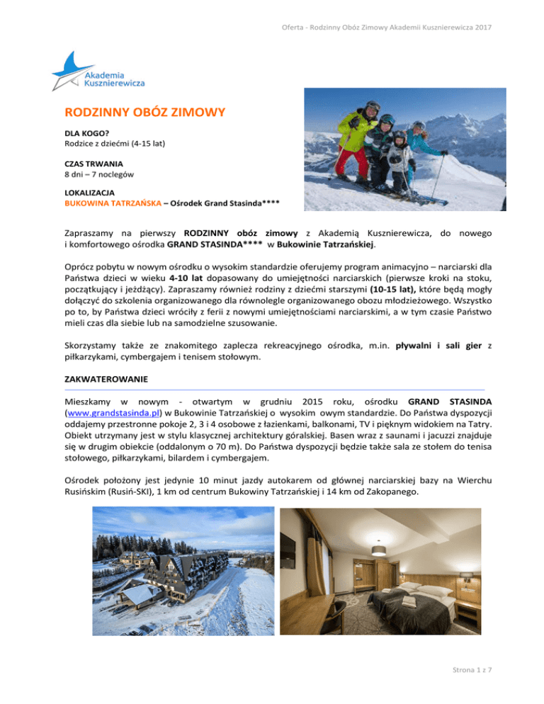 Oferta - Rodzinny Obóz Zimowy Akademii Kusznierewicza 2017 RODZINNY OBÓZ ZIMOWY DLA KOGO? Rodzice z dziećmi (4-15 lat) CZAS TRWANIA 8 dni – 7 noclegów LOKALIZACJA BUKOWINA TATRZAŃSKA – Ośrodek Grand Stasinda**** Zapraszamy na pierwszy RODZINNY obóz zimowy z Akademią Kusznierewicza, do nowego i komfortowego ośrodka GRAND STASINDA**** w Bukowinie Tatrzańskiej. Oprócz pobytu w nowym ośrodku o wysokim standardzie oferujemy program animacyjno – narciarski dla Państwa dzieci w wieku 4-10 lat dopasowany do umiejętności narciarskich (pierwsze kroki na stoku, początkujący i jeżdżący). Zapraszamy również rodziny z dziećmi starszymi (10-15 lat), które będą mogły dołączyć do szkolenia organizowanego dla równolegle organizowanego obozu młodzieżowego. Wszystko po to, by Państwa dzieci wróciły z ferii z nowymi umiejętnościami narciarskimi, a w tym czasie Państwo mieli czas dla siebie lub na samodzielne szusowanie. Skorzystamy także ze znakomitego zaplecza rekreacyjnego ośrodka, m.in. pływalni i sali gier z piłkarzykami, cymbergajem i tenisem stołowym. ZAKWATEROWANIE Mieszkamy w nowym - otwartym w grudniu 2015 roku, ośrodku GRAND STASINDA (www.grandstasinda.pl) w Bukowinie Tatrzańskiej o wysokim owym standardzie. Do Państwa dyspozycji oddajemy przestronne pokoje 2, 3 i 4 osobowe z łazienkami, balkonami, TV i pięknym widokiem na Tatry. Obiekt utrzymany jest w stylu klasycznej architektury góralskiej. Basen wraz z saunami i jacuzzi znajduje się w drugim obiekcie (oddalonym o 70 m). Do Państwa dyspozycji będzie także sala ze stołem do tenisa stołowego, piłkarzykami, bilardem i cymbergajem. Ośrodek położony jest jedynie 10 minut jazdy autokarem od głównej narciarskiej bazy na Wierchu Rusińskim (Rusiń-SKI), 1 km od centrum Bukowiny Tatrzańskiej i 14 km od Zakopanego. Strona 1 z 7 Oferta - Rodzinny Obóz Zimowy Akademii Kusznierewicza 2017 WYŻYWIENIE Trzy posiłki dziennie, serwowane w restauracji ośrodka. Całodzienny serwis kawowy dostępny dla gości. KOSZT POBYTU W OŚRODKU GRAND STASINDA Z WYŻYWIENIEM (3 posiłki) 999 zł – OSOBA DOROSŁA - 7 noclegów w pokoju 2, 3 lub 4 osobowym (zgodnie z Państwa wyborem), pełne wyżywienie (3 posiłki), codziennie transfer na stok w Bukowinie Tatrzańskiej i z powrotem (w godzinach 09:30 – 13:00) wraz z obozem młodzieżowym, 2 wstępy 1,5h na basen w ośrodku Stasinda (oddalonym o 50 m), ubezpieczenie NNW, opieka pilota Akademii Kusznierewicza, opieka Sport Concierge Akademii Kusznierewicza, który pomoże Państwu zorganizować wszelkie narciarskie, i nie tylko, życzenia podczas pobytu. 799 zł – DZIECKO W WIEKU 5-12 lat - 7 noclegów w pokoju 2, 3 lub 4 osobowym z rodzicami (zgodnie z Państwa wyborem), pełne wyżywienie (3 posiłki), 2 wstępy 1,5h na basen w ośrodku Stasinda (oddalonym o 50 m) z rodzicami, ubezpieczenie NNW, opieka pilota Akademii Kusznierewicza. Cena pobytu za osobę nie zależy od liczby osób w pokoju. Pobyt z noclegiem na łóżku z rodzicami z wyżywieniem dzieci w wieku 0-3 lat – bezpłatnie. Zakwaterowanie pierwszego dnia od godziny 15:00, wykwaterowanie do godziny 11:00. Pierwszy posiłek – kolacja, ostatni posiłek – śniadanie. TERMINY Kod imprezy ORZM1 Termin 11.02. – 18.02.2017 r. ORZM2 18.02 – 25.02.2017 r. Strona 2 z 7 Oferta - Rodzinny Obóz Zimowy Akademii Kusznierewicza 2017 PROGRAM SZKOLENIOWY PIERWSZE KROKI NA STOKU DLA DZIECI W WIEKU 4-10 lat Cena programu: 850 zł Dla najmłodszych przygotowaliśmy ofertę składającą się z dwóch bloków zajęć - poranny 4 godzinny ze szkoleniem narciarskim pod okiem instruktora i animatora (w grupach maks. 5 osobowych) i popołudniowy 1,5 godzinny pełen animacji, gier, zabaw i konkursów na świeżym powietrzu lub sali zabaw w ośrodku. Szkolenie narciarskie w grupach zaawansowania (pierwsze kroki na stoku, początkująca i jeżdżąca), prowadzone przez instruktorów licencjonowanej szkoły narciarskiej PTAK TEAM na stoku w Bukowinie Tatrzańskiej – Rusiński Wierch - wyciąg taśma 100 m, narciarski tor przeszkód (1 instruktor na 5 dzieci, szkolenie w dniach poniedziałek – piątek, 5 dni x 2 h na nartach z instruktorem). Rozgrzewka w formie gier i zabaw (30 minut) oraz zabawy rekreacyjne i uzupełniające po szkoleniu narciarskim (45 - 60 minut) prowadzone przez animatora Akademii Kusznierewicza (1 animator na 5 dzieci). Transfery dla dzieci z ośrodka na stok i z powrotem pod opieką animatora Akademii Kusznierewicza w dniach poniedziałek-piątek. Rodzice mogą oddać dzieci animatorowi w ośrodku ok. 09:00, dzieci pojadą autokarem na stok, wezmą udział w zajęciach i wrócą autokarem z animatorem o godzinie 13:00 6 Bloków zajęć z animatorami popołudniu (1,5h dziennie, niedziela - piątek) – sanki, lepienie bałwanka, konkurencje sprawnościowe, zajęcia plastyczne i rytmiczne, sztafety i inne! Zawody narciarskie na zakończenie szkolenia z nagrodami Pamiątkowe zdjęcie w ramce na zakończenie pobytu Cena nie zawiera opłaty za wypożyczenie nart. Koszt ok. 40-50 zł dziennie za komplet, możliwość wypożyczenia na miejscu. Kaski dla dzieci są obowiązkowe. RAMOWY PLAN DNIA SZKOLENIA PIERWSZE KROKI NA STOKU 08:00 – 09:00 09:00 09:15 – 09:30 10:00 – 10:30 10:30 – 12:30 12:30 – 13:15 13:30 14:00 – 16:00 16:30 – 18:00 19:00 Śniadanie w(z rodzicami) Zbiórka w lobby z animatorami Wyjazd na stok w Bukowinie Tatrzańskiej Rozgrzewka z animatorem Akademii Kusznierewicza Zajęcia narciarskie z instruktorami PTAK TEAM Zajęcia animacyjne z animatorem Akademii Kusznierewicza Powrót do ośrodka Obiad z rodzicami i czas wolny Zajęcia rekreacyjne z animatorami Kolacja z rodzicami i czas wolny Strona 3 z 7 Oferta - Rodzinny Obóz Zimowy Akademii Kusznierewicza 2017 PROGRAM SZKOLENIA NARCIARSKIEGO LUB SNOWBOARDOWEGO DLA DZIECI W WIEKU 10-15 LAT MIESZKAJĄCYCH Z RODZICAMI Cena programu: 800 zł Dla młodzieży w wieku 10-15 lat, która mieszkać będzie w pokojach z 
