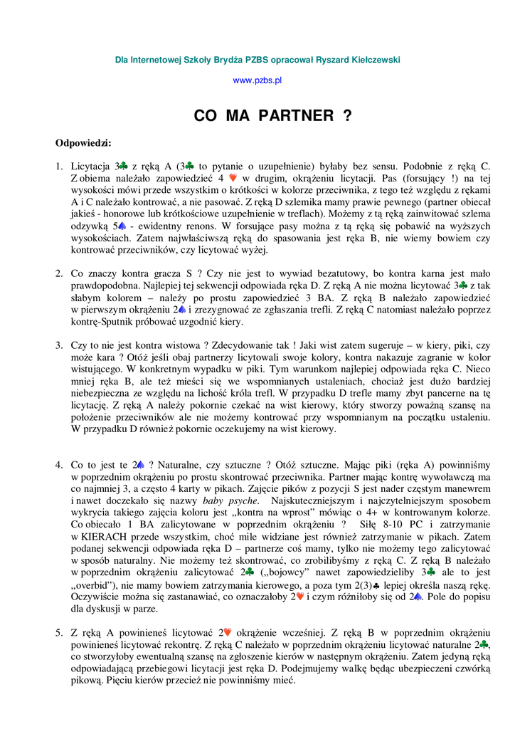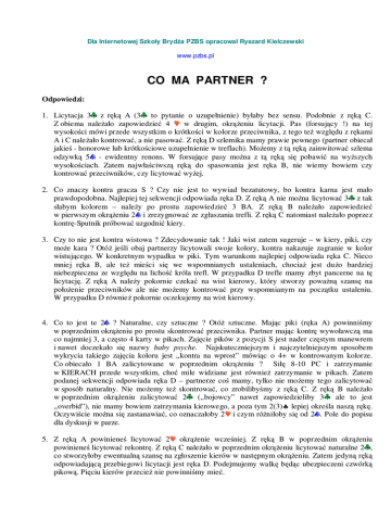 Dla Internetowej Szkoły Bryd a PZBS opracował Ryszard Kiełczewski www.pzbs.pl CO MA PARTNER ? Odpowiedzi: 1. Licytacja 3 z r k A (3 to pytanie o uzupełnienie) byłaby bez sensu. Podobnie z r k C. Z obiema nale ało zapowiedzie 4 w drugim, okr eniu licytacji. Pas (forsuj cy !) na tej wysoko ci mówi przede wszystkim o krótko ci w kolorze przeciwnika, z tego te wzgl du z r kami A i C nale ało kontrowa , a nie pasowa . Z r k D szlemika mamy prawie pewnego (partner obiecał jakie - honorowe lub krótko ciowe uzupełnienie w treflach). Mo emy z t r k zainwitowa szlema odzywk 5 - ewidentny renons. W forsuj ce pasy mo na z t r k si pobawi na wy szych wysoko ciach. Zatem najwła ciwsz r k do spasowania jest r ka B, nie wiemy bowiem czy kontrowa przeciwników, czy licytowa wy ej. 2. Co znaczy kontra gracza S ? Czy nie jest to wywiad bezatutowy, bo kontra karna jest mało prawdopodobna. Najlepiej tej sekwencji odpowiada r ka D. Z r k A nie mo na licytowa 3 z tak słabym kolorem – nale y po prostu zapowiedzie 3 BA. Z r k B nale ało zapowiedzie w pierwszym okr eniu 2 i zrezygnowa ze zgłaszania trefli. Z r k C natomiast nale ało poprzez kontr -Sputnik próbowa uzgodni kiery. 3. Czy to nie jest kontra wistowa ? Zdecydowanie tak ! Jaki wist zatem sugeruje – w kiery, piki, czy mo e kara ? Otó je li obaj partnerzy licytowali swoje kolory, kontra nakazuje zagranie w kolor wistuj cego. W konkretnym wypadku w piki. Tym warunkom najlepiej odpowiada r ka C. Nieco mniej r ka B, ale te mie ci si we wspomnianych ustaleniach, chocia jest du o bardziej niebezpieczna ze wzgl du na licho króla trefl. W przypadku D trefle mamy zbyt pancerne na t licytacj . Z r k A nale y pokornie czeka na wist kierowy, który stworzy powa n szans na poło enie przeciwników ale nie mo emy kontrowa przy wspomnianym na pocz tku ustaleniu. W przypadku D równie pokornie oczekujemy na wist kierowy. 4. Co to jest te 2 ? Naturalne, czy sztuczne ? Otó sztuczne. Maj c piki (r ka A) powinni my w poprzednim okr eniu po prostu skontrowa przeciwnika. Partner maj c kontr wywoławcz ma co najmniej 3, a cz sto 4 karty w pikach. Zaj cie pików z pozycji S jest nader cz stym manewrem i nawet doczekało si nazwy baby psyche. Najskuteczniejszym i najczytelniejszym sposobem wykrycia takiego zaj cia koloru jest „kontra na wprost” mówi c o 4+ w kontrowanym kolorze. Co obiecało 1 BA zalicytowane w poprzednim okr eniu ? Sił 8-10 PC i zatrzymanie w KIERACH przede wszystkim, cho mile widziane jest równie zatrzymanie w pikach. Zatem podanej sekwencji odpowiada r ka D – partnerze co mamy, tylko nie mo emy tego zalicytowa w sposób naturalny. Nie mo emy te skontrowa , co zrobiliby my z r k C. Z r k B nale ało w poprzednim okr eniu zalicytowa 2 („bojowcy” nawet zapowiedzieliby 3 ale to jest „overbid”), nie mamy bowiem zatrzymania kierowego, a poza tym 2(3)♣ lepiej okre la nasz r k . Oczywi cie mo na si zastanawia , co oznaczałoby 2 i czym ró niłoby si od 2 . Pole do popisu dla dyskusji w parze. 5. Z r k A powiniene licytowa 2 okr enie wcze niej. Z r k B w poprzednim okr eniu powiniene licytowa rekontr . Z r k C nale ało w poprzednim okr eniu licytowa naturalne 2 , co stworzyłoby ewentualn szans na zgłoszenie kierów w nast pnym okr eniu. Zatem jedyn r k odpowiadaj c przebiegowi licytacji jest r ka D. Podejmujemy walk b d c ubezpieczeni czwórk pikow . Pi ciu kierów przecie nie powinni my mie . Dla Internetowej Szkoły Bryd a PZBS opracował Ryszard Kiełczewski www.pzbs.pl 6. Pas jest forsuj cy i nie wyklucza zagrania szlema. Odpada zatem r ka D, partner bowiem nie mo e tak licytuj c posiada zatrzymania I klasy w pikach. R ka B to za słabe kiery i za słaba r ka, eby kusi los forsuj cym pasem. Z r k C nale y zalicytowa od razu 7 (partner nie mo e nie mie tego co nam do szlema potrzeba). Wła ciw zatem - dla przedstawionej - licytacji jest r ka A. 7. Z r k A nale ało najpierw licytowa 2 , a nie 1 . Z r k C nale ało uzgodni kiery w poprzednim okr eniu lub po prostu zapyta o liczb asów na uzgodnionych kierach. Z r k B nie nale ało zgłasza tak słabego koloru treflowego. Nale ało raczej zalicytowa wyczekuj ce 2 BA i czeka na ewentualne zgłoszenie trefli przez partnera. Zatem wła ciw dla przedstawionej sekwencji jest r ka D. 8. Tym razem wła ciw jest r ka B. Z r k A nale ało odpowiedzie albo 2 BA po 2 , a je li nie dokonali my tego, to po 4 nale ało powiedzie 4 BA. R ka C jest za słaba na dalsze ruszenie, za r ka D, to r ka zdecydowanie warta zalicytowania 2 w pierwszym okr eniu licytacji. 9. R ka A jest za słaba na tak akcj . Nale ało z ni zalicytowa 3 zamiast 3 w poprzednik okr eniu. Z r k B nale ało w pierwszym okr eniu licytowa 2 . Z r k C w drugim okr eniu wła ciw jest odzywka 4 zamiast 3 . Po pierwsze -nie mamy singletona kier, którego wskazujemy licytacj opisow . Po drugie – nasze trefle nie s warto ciowe. W zamian za to mamy nadwy ki punktowe i superfit karo. Idealn r k do przedstawionej licytacji jest r ka D. 10. Z r k A 2 BA przy ficie kierowym i braku zatrzymania treflowego jest odzywk wysoce niehigieniczn . Nale ało z ni fitowa kiery zgodnie ze stosowanymi ustaleniami. Z r k D równie w ostatnim okr eniu lepsze jest 3 z takim grubym dubletonem, a nie licytowanie pików z takim chudym kolorem. Wprawdzie 3 wyra przede wszystkim obaw o trefle ale łatwo mo e sprowokowa partnera do podniesienia pików z dubletonem. Przecie je li mamy obaw o trefle, nie mamy mocnego dubletona kier ani fitu karo, to piki s zazwyczaj dobrym kolorem. Z r k C – jak ju zdecydowali my si nie pokazywa słabej 6-ki pik, to nie usiłujmy tego zrobi okr enie pó niej. 3 BA z r ki S wygl da zreszt bardzo dobrze i nale y je zapowiedzie . W tej sytuacji podanej sekwencji najbardziej odpowiada r ka B. 11. Sekwencja S wskazuje niezbyt dobry kolor pikowy, niezdatny do licytacji z przeskokiem i półfit kierowy. Tym parametrom odpowiada r ka A. Z r kami B i D nale y zalicytowa piki z przeskokiem, a potem – je li nadarzy si spo