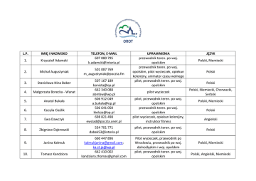 L.P. IMIĘ I NAZWISKO 1. Krzysztof Adamski 2. Michał Augustyniak 3. Stanisława Nina Bober 4. Małgorzata Borecka - Wanat 5. Anatol Bukała 6. Cecylia Cieślik 7. Ewa Dawczyk 8. Zbigniew Dąbrowski 9. Janina Kałmuk 10. Tomasz Kandziora TELEFON, E-MAIL 607 080 795 [email protected] 501 087 769 [email protected] UPRAWNIENIA przewodnik teren. po woj. opolskim przewodnik teren. po woj. opolskim, pilot wycieczek, opiekun kolonijny, animator czasu wolnego pilot, przewodnik teren. po woj. opolskim 507 167 189 [email protected] 662 340 088 [email protected] 606 912 049 [email protected] 506 641 050 [email protected] 698 821 498 [email protected] pilot, przewodnik teren. po woj. opolskim przewodnik teren. po woj. opolskim pilot wycieczek, opiekun kolonijny, instruktor fitness 534 701 771 [email protected] pilot, przewodnik teren. po woj. opolskim 660 447 896 [email protected]; [email protected] 662 410 002 [email protected] Pilot wycieczek, przewodnik po Wrocławiu, przewodnik po woj. dolnośląskim i woj. opolskim pilot, przewodnik teren. po woj. opolskim pilot wycieczek JĘZYK Polski, Niemiecki Polski Polski Polski, Niemiecki, Chorwacki, Serbski Polski, Niemiecki Polski Angielski Polski Polski, Niemiecki Polski, Angielski, Niemiecki 11. Małgorzata Konopka 12. Alina Kowarz 13. Felicyta Krawczyk 14. Agnieszka Kreduszyńska Kamionka 15. Wojciech Kwiecień 16. Justyna Lis 17. Małgorzata Mazur 18. Piotr Mielec 19. Stefan Muthwill 784 493 750 [email protected] 692781609 [email protected] 606 136 900 [email protected] 798 700 016 [email protected] przewodnik teren. po woj. opolskim przewodnik teren. po woj. opolskim pilot, przewodnik teren. po woj. opolskim przewodnik teren. po woj. opolskim 728 515 953 [email protected] http://www.3korony.com.pl/ pilot, przewodnik teren. po woj. opolskim Polski pilot Polski 507 047 867 [email protected] 509 080 872 [email protected] 502 181 709 [email protected] 502 475 724 [email protected] przewodnik teren. po woj. opolskim przewodnik teren. po woj. opolskim przewodnik teren. po woj. opolskim Polski Polski, Niemiecki Polski, Niemiecki Polski, Angielski Polski Polski Polski, Niemiecki 20. Marcin Nowak 691 342 595 [email protected] pilot, przewodnik teren. po woj. opolskim, przewodnik sudecki, kierownik wycieczek, opiekun kolonijny 21. Eugenia Ogórek 77 4664 40 07 [email protected] Pilot, rezydent biur podróży, wychowawca kolonijny 22. Anna Pilawska 692 934 696 [email protected] 23. Anna Ponisz 24. Jerzy Rudawa 25. 26. 607 146 930 [email protected] 604 520 403 [email protected] Agnieszka Skrzypulec 661 917 410 [email protected] Paweł Szymkowicz 603 792 221 [email protected] pilot, przewodnik teren. po woj. opolskim, przewodnik miejski po Pradze (Czechy) pilot, przewodnik teren. po woj. opolskim pilot, przewodnik teren. po woj. opolskim przewodnik teren. po woj. opolskim pilot, przewodnik teren. po woj. opolskim, Przewodnik terenowy po Dolnym Śląsku, przewodnik górski sudecki, przewodnik miejski po Pradze (Czechy) Polski, Niemiecki Niemiecki, Czeski Polski, Czeski Polski, Angielski, Włoski Polski Polski, Niemiecki Polski, Czeski 27. Ewa Światły 605 566 733 [email protected] 28. Ewa Tomaszczyk 697 554 701 [email protected] 29. Magdalena TorowskaMichalak 30. Grzegorz Tymczyszyn 696 667 255 [email protected] 693 873 135 [email protected] pilot, przewodnik teren. po woj. opolskim przewodnik teren. po woj. opolskim, przewodnik beskidzki, przewodnik terenowy-małopolska pilot, przewodnik teren. po woj. opolskim pilot, przewodnik teren. po woj. opolskim Polski Polski Polski, Angielski, Hiszpański Polski, Angielski
