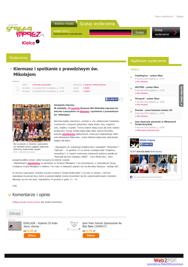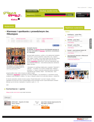 Now y użytkow nik Wybierz miasto Szukaj wydarzenia Szukaj (Kielce): Zaaw ansow ane w yszukiw anie W ybrane miasto Zaloguj Dodaj wydarzenie Szukaj Kielce Wydarzenia Najbliższe wydarzenia Kiermasz i spotkanie z prawdziwym św. Mikołajem Kielce: Paddington - pokaz filmu 9 stycznia 2015 (piątek), g. 12:15 Kino Moskwa Gdzie: Dworek Laszczyków Od kiedy: 14 grudnia 2014 (niedziela), g. 12:00 Do kiedy: 14 grudnia 2014 (niedziela), g. 14:00 Kategoria: Dodał: Miasto: Imprezy okolicznościowe AWA Kielce MATTEO - pokaz filmu 9 stycznia 2015 (piątek), g. 12:30 Kino Moskwa Lubię to! 1 Szczegóły imprezy: W niedzielę, 14 grudnia Muzuem Wsi Kieleckiej zaprasza do dworku Laszczyków na kiermasz i spotkanie z prawdziwym św. Mikołajem. Kiermasz będzie rekordow y, w eźmie w nim udział ponad trzydziestu w ystaw ców z pysznym jedzeniem, będą miody, sery, w ędzone ryby, w ędliny i w ypieki. Tw órcy ludow i będą uczyć jak robić ozdoby św iąteczne. Sw oje stoiska będą miały także Joanna W rońska autorka warsztatów plastycznych, znaw czyni regionalnego haftu oraz Aleksandra Makow ska - znana kielecka plastyczka, ilustratorka książek dla dzieci. Na w ystaw ie w dw orku Laszczyków od niedzieli można oglądać bajecznie kolorow e krakow skie szopki. Fotograf - pokaz filmu 9 stycznia 2015 (piątek), g. 18:00 Kino Moskwa Everest - poza krańcem świata 3D 9 stycznia 2015 (piątek), g. 18:00 Kino Moskwa Czar dawnych piosenek w Filharmonii Świętokrzyskiej 9 stycznia 2015 (piątek), g. 19:00 Filharmonia Świętokrzyska Strefa Imprez Lubię to! - Zapraszamy do w spólnego kolędow ania z zespołami: "Skokotliw i" i "Jędrusie". - O godzinie 12 na scenie w ystąpią także "kolędnicy (Fot. materiały prasowe) muzealnicy", w naszym w ykonaniu zobaczycie państw o jasełka pt. "Narodziła się nam nadzieja i miłość" - mów i Beata Ryń.- Sami przygotow aliśmy stroje i pilnie ćw iczymy by dobrze w ypaść. - Najmłodszych zapraszamy na spotkanie ze Św iętym Mikołajem. Tym praw dziw ym, w praw dziw ym stroju, w ydajemy w ojnę Mikołajow i z reklamy. Ten nasz, w biskupich szatach też ma dla dzieci słodycze - dodaje Ryń. W dw orku Laszczyków zostanie otw arta w ystaw a "Szopki Krakow skie" a na niej 12 szopek, z których najw iększa ma ponad dw a metry w ysokości.Będzie można dow iedzieć się kto w yprow adził szopki z kościoła i dlaczego są one tak duże. Zapraszamy 14 grudnia w godz. 11 - 14. 12 211 osób lubi obiekt Strefa Imprez. Wtyczka społecznościowa Facebooka (Lid) Komentarze i opinie Zaloguj się lub utw órz konto aby dodać komentarz. Zakupy reklama EXACLAIR - Koperta C6 Kolor Jasny różowy od 0,60 zł Zobacz Jean Marc Karnet Zaproszenie Na Ślub Białe (1040417) od 0,70 zł Zobacz converted by W eb2PDFConvert.com Kontakt Regulamin O serw isie Reklama RSS Polityka dotycząca plików cookies Media Regionalne Sp. z o.o. w W arszaw ie. 2001-2013 Media Regionalne sp. z o.o. w Warszawie zastrzegają, że rozpowszechnianie jakichkolwiek artykułów i materiałów zamieszczonych w portalu StrefaImprez.pl jest dozwolone wyłącznie z zachowaniem warunków korzystania z treści. Jakiekolwiek użycie treści wykraczające poza ww. warunki jest zabronione bez pisemnej zgody Mediów Regionalnych i nabycia licencji. Sprawdź, w jaki sposób możesz uzyskać licencję na wykorzystanie treści. Naruszenie tych zasad jest łamaniem prawa i grozi odpowiedzialnością karną. Serwis Strefa Imprez redagowany jest przez: rybuna Opolska Korzystając ze strony, w yrażasz zgodę na używ anie cookie. Przeczytaj w ięcej. ZAMKNIJ X converted by W eb2PDFConvert.com