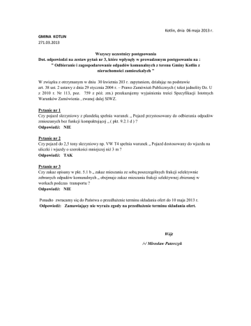 Kotlin, dnia 06 maja 2013 r. GMINA KOTLIN 271.03.2013 Wszyscy uczestnicy postępowania Dot. odpowiedzi na zestaw pytań nr 3, które wpłynęły w prowadzonym postępowaniu na : ” Odbieranie i zagospodarowanie odpadów komunalnych z terenu Gminy Kotlin z nieruchomości zamieszkałych ” W związku z otrzymanym w dniu 30 kwietnia 203 r. zapytaniem, działając na podstawie art. 38 ust. 2 ustawy z dnia 29 stycznia 2004 r. – Prawo Zamówień Publicznych ( tekst jednolity Dz. U z 2010 r. Nr 113, poz. 759 z póź. zm.) przekazujemy wyjaśnienia treści Specyfikacji Istotnych Warunków Zamówienia , zwanej dalej SIWZ. Pytanie nr 1 Czy pojazd skrzyniowy z plandeką spełnia warunek „ Pojazd przystosowany do odbierania odpadów zmieszanych bez funkcji kompaktującej „ ( pkt. 9.2.1 d ) ? Odpowiedź: NIE Pytanie nr 2 Czy pojazd do 2,5 tony skrzyniowy np. VW T4 spełnia warunek „ Pojazd dostosowany do wjazdu na uliczki i wjazdy o szerokości mniejszej niż 3 m ? Odpowiedź: TAK Pytanie nr 3 Czy zakaz opisany w pkt. 5.1 b „ zakaz mieszania ze sobą poszczególnych frakcji selektywnie zebranych odpadów komunalnych „ obejmuje zakaz mieszania frakcji selektywnej zbieranej w workach podczas transportu ? Odpowiedź: NIE Ponadto zwracamy się do Państwa o przedłużenie terminu składania ofert do 10 maja 2013 r. Odpowiedź: Zamawiający nie wyraża zgody na przedłużenie terminu składania ofert. Wójt /-/ Mirosław Paterczyk