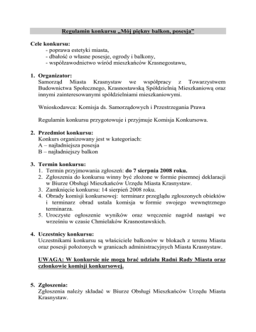 Regulamin konkursu „Mój piękny balkon, posesja” Cele konkursu: - poprawa estetyki miasta, - dbałość o własne posesje, ogrody i balkony, - współzawodnictwo wśród mieszkańców Krasnegostawu, 1. Organizator: Samorząd Miasta Krasnystaw we współpracy z Towarzystwem Budownictwa Społecznego, Krasnostawską Spółdzielnią Mieszkaniową oraz innymi zainteresowanymi spółdzielniami mieszkaniowymi. Wnioskodawca: Komisja ds. Samorządowych i Przestrzegania Prawa Regulamin konkursu przygotowuje i przyjmuje Komisja Konkursowa. 2. Przedmiot konkursu: Konkurs organizowany jest w kategoriach: A – najładniejsza posesja B – najładniejszy balkon 3. Termin konkursu: 1. Termin przyjmowania zgłoszeń: do 7 sierpnia 2008 roku. 2. Zgłoszenia do konkursu winny być złoŜone w formie pisemnej deklaracji w Biurze Obsługi Mieszkańców Urzędu Miasta Krasnystaw. 3. Zamknięcie konkursu: 14 sierpień 2008 roku. 4. Obrady komisji konkursowej: terminarz przeglądu zgłoszonych obiektów i terminarz obrad ustala komisja w formie swojego wewnętrznego terminarza. 5. Uroczyste ogłoszenie wyników oraz wręczenie nagród nastąpi we wrześniu w czasie Chmielaków Krasnostawskich. 4. Uczestnicy konkursu: Uczestnikami konkursu są właściciele balkonów w blokach z terenu Miasta oraz posesji połoŜonych w granicach administracyjnych Miasta Krasnystaw. UWAGA: W konkursie nie mogą brać udziału Radni Rady Miasta oraz członkowie komisji konkursowej. 5. Zgłoszenia: Zgłoszenia naleŜy składać w Biurze Obsługi Mieszkańców Urzędu Miasta Krasnystaw. 6. Komisja konkursowa: Komisję konkursową powołuje Burmistrz Krasnegostawu. Skład komisji konkursowej stanowi 6 osób: - 3 osoby z Rady Miasta (Członkowie Komisji ds. Samorządowych i Przestrzegania Prawa) - 1 osoba z Urzędu Miasta Krasnystaw - 1 osoba z Towarzystwa Budownictwa Społecznego - 1 osoba z Krasnostawskiej Spółdzielni Mieszkaniowej 7. Posiedzenia komisji. Posiedzenia komisji zwołuje i prowadzi Przewodniczący Komisji. Komisja konkursowa decyduje w drodze głosowania w sprawach nieuregulowanych zapisami niniejszego regulaminu. Komisja sporządza 2 protokoły końcowe, po jednym dla kaŜdej kategorii. Prace komisji kończy sporządzenie protokołu z całości prac komisji. Członkom komisji konkursowej nie przysługuje wynagrodzenie za udział w jej pracach. 8. Kryteria oceny: A: posesja - ogólny wygląd posesji, wraŜenia estetyczne, - stan i wygląd ogrodzenia, - kompozycje kwiatowe, - utrzymanie zieleni, trawniki, krzewy, - mała architektura ogrodowa, - sposób utylizacji odpadów. B: balkon - ogólny wygląd balkonu, estetyka, - ukwiecenie balkonu, kompozycje kwiatowe, - wypełnienie balustrady. Stosuje się punktację w skali 0 – 5. ZwycięŜa posesja, balkon, który otrzyma największą łącznie liczbę punktów (łączna suma punktów wszystkich członków komisji). 9. Nagrody: Ustala się nagrody rzeczowe. - Fundatorem nagród jest Burmistrz Krasnegostawu. - Spółdzielnie mieszkaniowe mogą ufundować dodatkowe nagrody. - Komisja konkursowa przyznaje wyróŜnienia w postaci pamiątkowych dyplomów. 10. Organizacja przebiegu konkursu. 1. Zarządzenie Burmistrza Krasnegostawu Nr 46 z dnia 9 maja 2008 r. w sprawie powołania Komisji konkursowej 2. Rozpoczęcie pracy przez Komisję Konkursową. 3. Przekazanie informacji o rozpoczęciu konkursu do wszystkich lokalnych mediów oraz umieszczenie jej w Internecie (publikacja regulaminu konkursu). 4. Rozstrzygnięcie konkursu – prezentacje i nagrodzenie zwycięzców (reportaŜ w Internecie, prasie i telewizji kablowej).
