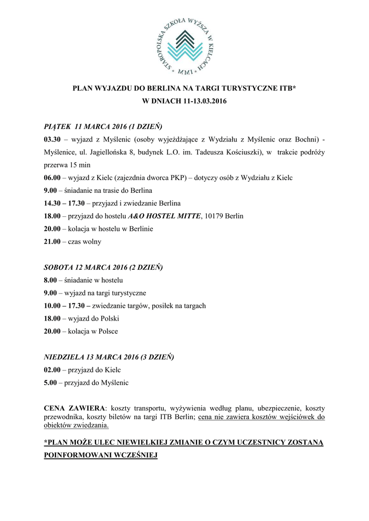 PLAN WYJAZDU DO BERLINA NA TARGI TURYSTYCZNE ITB* W DNIACH 11-13.03.2016 PIĄTEK 11 MARCA 2016 (1 DZIEŃ) 03.30 – wyjazd z Myślenic (osoby wyjeżdżające z Wydziału z Myślenic oraz Bochni) Myślenice, ul. Jagiellońska 8, budynek L.O. im. Tadeusza Kościuszki), w trakcie podróży przerwa 15 min 06.00 – wyjazd z Kielc (zajezdnia dworca PKP) – dotyczy osób z Wydziału z Kielc 9.00 – śniadanie na trasie do Berlina 14.30 – 17.30 – przyjazd i zwiedzanie Berlina 18.00 – przyjazd do hostelu A&O HOSTEL MITTE, 10179 Berlin 20.00 – kolacja w hostelu w Berlinie 21.00 – czas wolny SOBOTA 12 MARCA 2016 (2 DZIEŃ) 8.00 – śniadanie w hostelu 9.00 – wyjazd na targi turystyczne 10.00 – 17.30 – zwiedzanie targów, posiłek na targach 18.00 – wyjazd do Polski 20.00 – kolacja w Polsce NIEDZIELA 13 MARCA 2016 (3 DZIEŃ) 02.00 – przyjazd do Kielc 5.00 – przyjazd do Myślenic CENA ZAWIERA: koszty transportu, wyżywienia według planu, ubezpieczenie, koszty przewodnika, koszty biletów na targi ITB Berlin; cena nie zawiera kosztów wejściówek do obiektów zwiedzania. *PLAN MOŻE ULEC NIEWIELKIEJ ZMIANIE O CZYM UCZESTNICY ZOSTANĄ POINFORMOWANI WCZEŚNIEJ