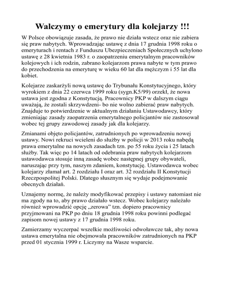 Walczymy o emerytury dla kolejarzy !!! W Polsce obowiązuje zasada, że prawo nie działa wstecz oraz nie zabiera się praw nabytych. Wprowadzając ustawę z dnia 17 grudnia 1998 roku o emeryturach i rentach z Funduszu Ubezpieczeniach Społecznych uchylono ustawę z 28 kwietnia 1983 r. o zaopatrzeniu emerytalnym pracowników kolejowych i ich rodzin, zabrano kolejarzom prawa nabyte w tym prawo do przechodzenia na emeryturę w wieku 60 lat dla mężczyzn i 55 lat dla kobiet. Kolejarze zaskarżyli nową ustawę do Trybunału Konstytucyjnego, który wyrokiem z dnia 22 czerwca 1999 roku (sygn.K5/99) orzekł, że nowa ustawa jest zgodna z Konstytucją. Pracownicy PKP w dalszym ciągu uważają, że zostali skrzywdzeni- bo nie wolno zabierać praw nabytych. Znajduje to potwierdzenie w aktualnym działaniu Ustawodawcy, który zmieniając zasady zaopatrzenia emerytalnego policjantów nie zastosował wobec tej grupy zawodowej zasady jak dla kolejarzy. Zmianami objęto policjantów, zatrudnionych po wprowadzeniu nowej ustawy. Nowi rekruci wcieleni do służby w policji w 2013 roku nabędą prawa emerytalne na nowych zasadach tzn. po 55 roku życia i 25 latach służby. Tak więc po 14 latach od odebrania praw nabytych kolejarzom ustawodawca stosuje inną zasadę wobec następnej grupy obywateli, naruszając przy tym, naszym zdaniem, konstytucję. Ustawodawca wobec kolejarzy złamał art. 2 rozdziału I oraz art. 32 rozdziału II Konstytucji Rzeczpospolitej Polski. Dlatego słusznym się wydaje podejmowanie obecnych działań. Uznajemy normę, że należy modyfikować przepisy i ustawy natomiast nie ma zgody na to, aby prawo działało wstecz. Wobec kolejarzy należało również wprowadzić opcję „zerowa” tzn. dopiero pracownicy przyjmowani na PKP po dniu 18 grudnia 1998 roku powinni podlegać zapisom nowej ustawy z 17 grudnia 1998 roku. Zamierzamy wyczerpać wszelkie możliwości odwoławcze tak, aby nowa ustawa emerytalna nie obejmowała pracowników zatrudnionych na PKP przed 01 stycznia 1999 r. Liczymy na Wasze wsparcie. ZBIERAMY PODPISY POPARCIA WNIOSKÓW KIEROWANYCH DO RZECZNIKA SPRAW OBYWATELSKICH O PODJĘCIE DZIAŁAŃ MAJĄCYCH NA CELU ZBADANIE KONSTYTUCYJNOŚCI PRZEPISÓW USTAWY Z DNIA 17 GRUDNIA 1998 R. O EMERYTURACH I RENTACH Z FUNDUSZU UBEZPIECZEŃ SPOŁECZNYCH. Podpisy poparcia można składać: 1. W budynku administracyjnym przy ul. Nakielskiej 3 w Tarn. Górach – w biurze u Pani Jolanty Chmielowskiej I piętro pok. nr 13 2. W budynku administracyjnym przy ul. Dubois 12 w Gliwicach – w kancelarii na parterze