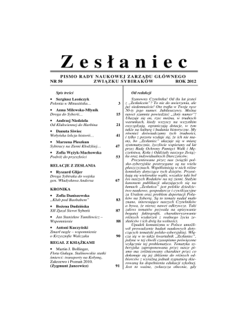 Zesłaniec PISMO RADY NAUK OWEJ ZARZĄDU GŁÓWNEGO NR 50 ZWI ĄZK U SYBIRAK ÓW ROK 2012 Spis treści • Sergiusz Leończyk Polonia w Minusińsku… Od redakcji 3 • Anna Milewska-Młynik Droga do Syberii… 15 • Andrzej Niedziela Od Klukwiennej do Harbina 21 • Danuta Siwiec Wołyńska lekcja historii… 41 • Marzena Pleszkun Sybiracy na Ziemi Kłodzkiej… 47 • Zofia Wężyk-Machowska Podróż do przeszłości 53 RELACJE Z ZESŁANIA • Ryszard Glijer Droga Sybiraka do wojska gen. Władysława Andersa 67 KRONIKA • Zofia Daniszewska „Klub pod Baobabem” 83 • Bożena Dudzińska XII Zjazd Sierot Syberii 87 • Jan Stanisław Tumiłowicz – Wspomnienie 88 • Antoni Kuczyński Zmarł nagle – wspomnienie o Krzysztofie Walczaku 90 REGAŁ Z KSIĄŻKAMI • Martin J. Bollinger, Flota Gułagu. Stalinowskie statki śmierci: transporty na Kołymę, Zakrzewo i Poznań 2010. (Zygmunt Jancewicz) 91 Szanowny Czytelniku! Od ilu lat jesteś z „Zesłańcem”? To nie do uwierzenia, ale już siedemnaście! Oto trafia w Twoje ręce 50-ty jego numer. Jubileuszowy. Można nawet szumnie powiedzieć „złoty numer”! Ukazuje się on, rzec można, w trudnych warunkach, kiedy wszyscy na wszystkim oszczędzają, ograniczają dotacje, w tym także na kulturę i badania historyczne. My również doświadczamy tych trudności, i tylko z pozoru wydaje się, że ich nie mamy, bo „Zesłaniec” ukazuje się w miarę systematycznie, życzliwie wspierany od lat przez Radę Ochrony Pamięci Walk i Męczeństwa, Koła i Oddziały naszego Związku oraz indywidualnych Darczyńców. Prezentowane przez nas związki polsko-syberyjskie postrzegane są na wielu płaszczyznach. Współistnieją w nich różne konteksty dotyczące tych dziejów. Przenikają się wielorakie wątki, wszakże taki był los naszych Rodaków na tej ziemi. Stałym kanonem publikacji ukazujących się na łamach „Zesłańca” jest polskie dziedzictwo naukowe, gospodarcze i cywilizacyjne za Uralem oraz problem deportacji Polaków na Syberię. Są to tematy nadal mało znane, interesujące naszych Czytelników a bywa, że nieraz nawet odkrywcze. Taki zakres tematów pozwala na opisywanie bogatej faktografii, charakteryzowanie różnych wydarzeń z realnego życia zesłańców i ich dróg ku wolności. Upadek komunizmu w Polsce umożliwił prowadzenie badań naukowych dotyczących tematyki polsko-syberyjskiej. Włącza się w to także kwartalnik „Zesłaniec”, jedyne w tej chwili czasopismo poświęcone wyłącznie tej problematyce. Tematyka syberyjska zaproponowana przez nasze pismo ma zróżnicowany charakter przez co dokonuje się jej zbliżenie do różnych odbiorców z wyraźną jednak sygnaturą skierowaną ku dopełnieniu edukacji szkolnej. Jest to ważne, zwłaszcza obecnie, gdy • E. N. Tumanik, Józef Adamowskij i stanowlenije parachodstwa w Zapadnoj Sibiri…, Nowosibirsk 2011. (Bolesław Orłowski) 92 • Leopolda Niemirowskiego podróż po Syberii Wschodniej, red. J. Dobrynina, Irkuck 2010. (Anna Milewska-Młynik) 94 • My, Sybiracy”, nr 22/2011 (Wiesław Krawczyński) 96 • S. Teresa Antonietta Frącek RM, Zesłaniec nad brzegami Wołgi… Wrocław 2011. (Maria Ziegler) 98 LISTY DO REDAKCJI 99 Na okładce: Leopolda Niemirowskiego album „Podróż po Syberii Wschodniej”, Irkuck 2010 (s. 1); Uczestnicy XII Zjazdu Sierot Syberii (Karpacz, 30.VIII. – 1.IX.2011 r.), fot. archiwum, (s. 4). Zeszyt opublikowany dzięki dotacji Rady Ochrony Pamięci Walk i Męczeństwa Wydawca: Zarząd Główny Związku Sybiraków, ul. Mazowiecka 12 00-048 Warszawa, tel. 22/827 93 71 Redakcja: A. Dobroński, A. Dzienkiewicz, W. Krawczyński, A. Kuczyński (red. nacz.), S. Sikorski, P. Zworski Sekretarz redakcji: M.B. Kuczyńska Wykonawca: Skład, druk i oprawa – QUAESTIO Przemysław Włodarczyk, ul. Paczkowska 26; 50-503 Wrocław Copyright nazwy „Zesłaniec” by A. Kuczyński Adres redakcji: ul. Bystrzycka 61/3 54-215 Wrocław, tel. 71/351 10 94 historia zaczyna być minimalizowana w programach szkół podstawowych i średnich. Zaakcentowanie, że u podstaw patriotyzmu leży znajomość dziejów ojczystych stanowi wyróżnik o podstawowym znaczeniu dla kultury i tożsamości narodowej. Często nasz Czytelnik odnajduje to w różnych fragmentach publikowanych artykułów. Patriotyzm był ważnym elementem naszego przetrwania w trudnych czasach zaborów. On też stanowił istotny składnik przemian, które doprowadziły do upadku komunizmu nad Wisłą. Polskość to historyczne dziedzictwo, klejnot narodu, to część ojczystego języka i kultury, tak jak religijność. Dzięki patriotyzmowi, językowi i religii przetrwaliśmy lata zaborów oraz inne formy zniewolenia. Uczyły nas tego nasze matki na syberyjskim zesłaniu i tułaczym szlaku. „Zesłaniec” jest ważnym zapisem polskiego dziedzictwa naukowego i kulturowego na Syberii. Utrwala on liczne świadectwa z tego zakresu, przypomina zesłańców-badaczy, którzy obdarzali naukę interesującymi opisami kultury autochtonicznych ludów Syberii i jej rozległych przestrzeni dokonując tam odkryć geologicznych, ustaleń geograficznych oraz innych rzeczywistości przyrodniczych. Tematyka ta posiada szczególne znaczenie dla bliższego poznania związków Polski z Syberią i stanowi cenne dopełnienie zobiektywizowanych współczesnych ujęć historycznych autorstwa badaczy rosyjskich i polskich. Ponadto nasza obecność na Syberii, zwłaszcza w latach drugiej wojny światowej jest stałym źródłem refleksji historycznej, która ani na chwilę nie zatrzymuje się w drodze poprzez stały dział na łamach „Zesłańca” noszący nazwę „Relacje z zesłania.” Dziękujemy wszystkim, którzy przyczyniają się do istnienia „Zesłańca”, zwłaszcza Autorom i Darczyńcom, bez pomocy których trudno wyobrazić sobie nasze trwanie już 17 lat. Dziękujemy też za wszechobecne wspieranie nas przez Czytelników, których listy sprowadzić można do refleksji, że „Z