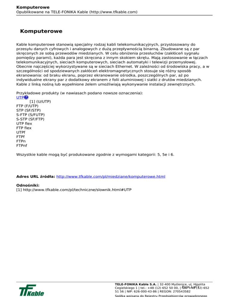 Komputerowe Opublikowane na TELE-FONIKA Kable (http://www.tfkable.com) Komputerowe Kable komputerowe stanowią specjalny rodzaj kabli telekomunikacyjnych, przystosowany do przesyłu danych cyfrowych i analogowych z dużą przepływnością binarną. Zbudowane są z par skręconych ze sobą przewodów miedzianych. W celu obniżenia przesłuchów (zakłóceń sygnału pomiędzy parami), każda para jest skręcona z innym skokiem skrętu. Mają zastosowanie w łączach telekomunikacyjnych, sieciach komputerowych, sieciach automatyki i telewizji przemysłowej. Obecnie najczęściej wykorzystywane są w sieciach Ethernet. W zależności od środowiska pracy, a w szczególności od spodziewanych zakłóceń elektromagnetycznych stosuje się różny sposób ekranowania: od braku ekranu, poprzez ekranowanie ośrodka, poszczególnych par, aż po indywidualne ekrany par z dodatkowy ekranem z folii aluminiowej i siatki z drutów miedzianych. Kable z linką nośną lub wypełnione żelem umożliwiają wykonywanie instalacji zewnętrznych. Przykładowe produkty (w nawiasach podano nowsze oznaczenia): UTP [1] (U/UTP) FTP (F/UTP) STP (SF/STP) S-FTP (S/FUTP) S-STP (SF/FTP) UTP flex FTP flex UTPf FTPf FTPn FTPnf Wszystkie kable mogą być produkowane zgodnie z wymogami kategorii: 5, 5e i 6. Adres URL źródła: http://www.tfkable.com/pl/miedziane/komputerowe.html Odnośniki: [1] http://www.tfkable.com/pl/techniczne/slownik.html#UTP TELE-FONIKA Kable S.A. | 32-400 Myślenice, ul. Hipolita Page+48 1 of(12) 1 652 Cegielskiego 1 | tel.: +48 (12) 652 50 00, | fax: 51 56 | NIP: 626-000-43-86 | REGON: 270543582 Powered by TCPDF (www.tcpdf.org)