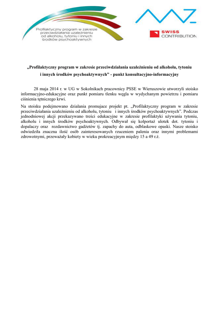 „Profilaktyczny program w zakresie przeciwdziałania uzależnieniu od alkoholu, tytoniu i innych środków psychoaktywnych” - punkt konsultacyjno-informacyjny 28 maja 2014 r. w UG w Sokolnikach pracownicy PSSE w Wieruszowie utworzyli stoisko informacyjno-edukacyjne oraz punkt pomiaru tlenku węgla w wydychanym powietrzu i pomiaru ciśnienia tętniczego krwi. Na stoisku podejmowano dzialania promujace projekt pt. „Profilaktyczny program w zakresie przeciwdziałania uzależnieniu od alkoholu, tytoniu i innych środków psychoaktywnych”. Podczas jednodniowej akcji przekazywano treści edukacyjne w zakresie profilaktyki używania tytoniu, alkoholu i innych środków psychoaktywnych. Odbywał się kolportaż ulotek dot. tytoniu i dopalaczy oraz rozdawnictwo gadżetów tj. zapachy do auta, odblaskowe opaski. Nasze stoisko odwiedziła znaczna ilość osób zainteresowanych rzuceniem palenia oraz innymi problemami zdrowotnymi, przeważały kobiety w wieku prokreacyjnym między 15 a 49 r.ż.