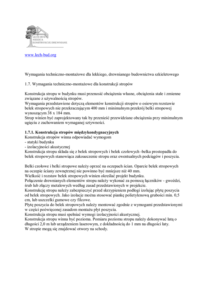 www.lech-bud.org Wymagania techniczno-montażowe dla lekkiego, drewnianego budownictwa szkieletowego 1.7. Wymagania techniczno-montażowe dla konstrukcji stropów Konstrukcja stropu w budynku musi przenosić obciążenia własne, obciążenia stałe i zmienne związane z używalnością stropów. Wymagania przedstawione dotyczą elementów konstrukcji stropów o osiowym rozstawie belek stropowych nie przekraczającym 400 mm i minimalnym przekrój belki stropowej wynoszącym 38 x 184 mm. Strop winien być zaprojektowany tak by przenieść przewidziane obciążenia przy minimalnym ugięciu z zachowaniem wymaganej sztywności. 1.7.1. Konstrukcja stropów międzykondygnacyjnych Konstrukcja stropów winna odpowiadać wymogom - statyki budynku - izolacyjności akustycznej Konstrukcja stropu składa się z belek stropowych i belek czołowych -belka prostopadła do belek stropowych stanowiąca zakoaeczenie stropu oraz ewentualnych podciągów i poszycia. Belki czołowe i belki stropowe należy oprzeć na oczepach ścian. Oparcie belek stropowych na oczepie ściany zewnętrznej nie powinno być mniejsze niż 40 mm. Wielkość i rozstaw belek stropowych winien określać projekt budynku. Połączenie drewnianych elementów stropu należy wykonać za pomocą łączników - gwoździ, śrub lub złączy metalowych według zasad przedstawionych w projekcie. Konstrukcję stropu należy zabezpieczyć przed skrzypieniem podłogi izolując płytę poszycia od belek stropowych. Jako izolacje można stosować piankę polietylenową grubości min. 0,5 cm, lub uszczelki gumowe czy filcowe. Płytę poszycia do belek stropowych należy montować zgodnie z wymogami przedstawionymi w części poówięconej zasadom montażu płyt poszycia. Konstrukcja stropu musi spełniać wymogi izolacyjności akustycznej. Konstrukcja stropu winna być pozioma. Pomiaru poziomu stropu należy dokonywać łatą o długości 2,0 m lub urządzeniem laserowym, z dokładnością do 1 mm na długości łaty. W stropie mogą się znajdować otwory na schody. Konstrukcja stropu międzykondygnacyjnego Strop międzykondygnacyjny z poszyciem podłogi 1.7.2. Konstrukcja otworu na schody Wielkość otworu określa projekt. Otwór tworzy się przez wycięcie belek stropowych, które, za pomocą wsporników belek, należy zawiesić na wymianie. Gdy wymiar otworu (prostopadły do belek stropowych) nie przekracza 120 cm, można stosować pojedyńczy wymian o przekroju równym przekrojowi belki stropowej. Natomiast, jeżeli wymiar przekracza 120 cm, należy stosować podwójny wymian. Przekrój elementów wymianu winien odpowiadać przekrojowi belki stropowej. Jeżeli wymiar otworu (równoległy do belek stropowych) przekracza 80 cm krawędzie otworu należy wzmocić dodatkową belką stropową. Gdy wielkość otworu przekracza 320 cm (prostopadle do belek stropowych) lub 200 cm (równolegle do belek stropowych) należy wykonać obliczenia konstrukcyjne określające wielkość wymianu i krawędzi otworu. Zasady konstrukcji otworu w stropie 1.7.3. Konstrukcja wykuszu równoległego do belek stropowych Konstrukcję stropu dla wykuszu okiennego równoległego do belek stropowych tworzą belki stropowe prostopadłe do belek stropu. Belki stropowe tworzące wykusz muszą być zakotwione w stropie na długości co najmniej sześciokrotnego wysięgu wykuszu. Belki należy zakotwić na podw-jnej belce stropowej. Konstrukcję stropu dla wykuszu okiennego równoległego do belek stropowych można wysunąc poza lico ściany na 400 mm w przypadku stosowania belek stropowych o min. przekroju 38 x 185 mm lub na 600 mm w przypadku belek stropowych o przekroju min. 38 x 235 mm. Gdy wymiar wykuszu, wystającego poza lico ściany, przekracza 600 mm należy wykonać obliczenia statyczne. Zasady montażu wykuszu na belkach równoległych do belek stropowych 1.7.4. Konstrukcja wykuszu okiennego prostopadła do belek stropowych Konstrukcję stropu wykuszu okiennego prostopadłego do belek stropowych tworzy się przez przedłużenie belek stropowych poza lico budynku. Gdy belki stropowe posiadają wymiar 38 x 185 mm, szerokość wykuszu wystającego poza lico ściany nie może przekroczyć 400 mm. Przy stosowaniu belek o przekroju 38 x 235 mm wysięg wykuszu można zwiększyć do 600 mm. Gdy wymiar wykuszu, wystającego poza lico ściany, przekracza 600 mm należy wykonać obliczenia statyczne. Zasady montażu wykuszu na belkach prostopadłych do belek stropowych 1.7.5. Oparcie ścianek działowych na stropie Spos-b oparcia ścianek działowych na stropie uzależniony jest od rodzaju ścianki działowej + nośnej lub nienośnej, a także od usytuowania ścianki względem belek stropowych. 1.7.5.1. Wzmocnienia stropu pod ścianki działowe nośne ścianki działowe biegnące równolegle do belek stropowych muszą być podtrzymane przez dodatkowe belki stropowe lub ściany nośne niższej kondygnacji. Stropy przenoszące ścianki działowe nośne prostopadłe do belek stropowych, przenoszące obciążenia z jednej lub więcej kondygnacji, nie wymagają dodatkowego wzmocnienia, jeżeli ścianki są usytuowane w odległości nie większej niż 60 cm od nośnej podpory (podciąg, ściana nona) znajdującej się poniżej stropu. Stropy przenoszące ścianki działowe nośne usytuowane prostopadle do belek stropowych, a przenoszące obciążenia z nieużytkowego stropu, nie wymagają dodatkowego wzmocnienia, jeżeli ścianki są usytuowane w - odległości nie większej niż 90 cm od nośnej podpory znajdującej się poniżej stropu. Zasada oparcia cianek działowych biegnących prostopadle do belek stropu 1.7.5.2. Oparcie ścianek działowych nienośnych Wzmocnienie stropu dla przeniesienia obciążeae ze ścianki działowej nienośnej biegnącej równolegle do belek stropowych należy wykonać w formie dodatkowej belki stropowej lub przewiązek. Przewiązki należy zamocować między belkami stropowymi, pod ścianką działową, w rozstawie nie większym niż 120 cm. Œcian
