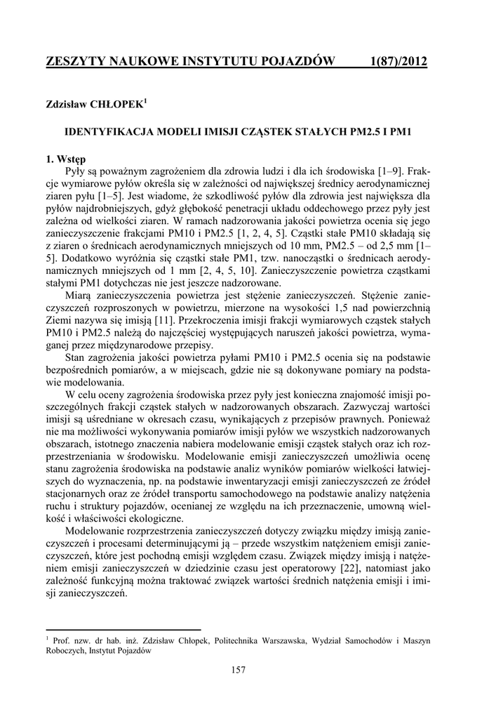 ZESZYTY NAUKOWE INSTYTUTU POJAZDÓW 1(87)/2012 Zdzisław CHŁOPEK1 IDENTYFIKACJA MODELI IMISJI CZĄSTEK STAŁYCH PM2.5 I PM1 1. Wstęp Pyły są poważnym zagrożeniem dla zdrowia ludzi i dla ich środowiska [1–9]. Frakcje wymiarowe pyłów określa się w zależności od największej średnicy aerodynamicznej ziaren pyłu [1–5]. Jest wiadome, że szkodliwość pyłów dla zdrowia jest największa dla pyłów najdrobniejszych, gdyż głębokość penetracji układu oddechowego przez pyły jest zależna od wielkości ziaren. W ramach nadzorowania jakości powietrza ocenia się jego zanieczyszczenie frakcjami PM10 i PM2.5 [1, 2, 4, 5]. Cząstki stałe PM10 składają się z ziaren o średnicach aerodynamicznych mniejszych od 10 mm, PM2.5 – od 2,5 mm [1– 5]. Dodatkowo wyróżnia się cząstki stałe PM1, tzw. nanocząstki o średnicach aerodynamicznych mniejszych od 1 mm [2, 4, 5, 10]. Zanieczyszczenie powietrza cząstkami stałymi PM1 dotychczas nie jest jeszcze nadzorowane. Miarą zanieczyszczenia powietrza jest stężenie zanieczyszczeń. Stężenie zanieczyszczeń rozproszonych w powietrzu, mierzone na wysokości 1,5 nad powierzchnią Ziemi nazywa się imisją [11]. Przekroczenia imisji frakcji wymiarowych cząstek stałych PM10 i PM2.5 należą do najczęściej występujących naruszeń jakości powietrza, wymaganej przez międzynarodowe przepisy. Stan zagrożenia jakości powietrza pyłami PM10 i PM2.5 ocenia się na podstawie bezpośrednich pomiarów, a w miejscach, gdzie nie są dokonywane pomiary na podstawie modelowania. W celu oceny zagrożenia środowiska przez pyły jest konieczna znajomość imisji poszczególnych frakcji cząstek stałych w nadzorowanych obszarach. Zazwyczaj wartości imisji są uśredniane w okresach czasu, wynikających z przepisów prawnych. Ponieważ nie ma możliwości wykonywania pomiarów imisji pyłów we wszystkich nadzorowanych obszarach, istotnego znaczenia nabiera modelowanie emisji cząstek stałych oraz ich rozprzestrzeniania w środowisku. Modelowanie emisji zanieczyszczeń umożliwia ocenę stanu zagrożenia środowiska na podstawie analiz wyników pomiarów wielkości łatwiejszych do wyznaczenia, np. na podstawie inwentaryzacji emisji zanieczyszczeń ze źródeł stacjonarnych oraz ze źródeł transportu samochodowego na podstawie analizy natężenia ruchu i struktury pojazdów, ocenianej ze względu na ich przeznaczenie, umowną wielkość i właściwości ekologiczne. Modelowanie rozprzestrzenia zanieczyszczeń dotyczy związku między imisją zanieczyszczeń i procesami determinującymi ją – przede wszystkim natężeniem emisji zanieczyszczeń, które jest pochodną emisji względem czasu. Związek między imisją i natężeniem emisji zanieczyszczeń w dziedzinie czasu jest operatorowy [22], natomiast jako zależność funkcyjną można traktować związek wartości średnich natężenia emisji i imisji zanieczyszczeń. Prof. nzw. dr hab. inż. Zdzisław Chłopek, Politechnika Warszawska, Wydział Samochodów i Maszyn Roboczych, Instytut Pojazdów 1 157 Z analizy zależności średniej imisji zanieczyszczeń od średniego natężenia emisji wynika, że do celów oceny zagrożenia środowiska można wykorzystywać modelowanie emisji. Z tego powodu często nawet faktyczne modelowanie imisji zanieczyszczeń kwalifikuje się do kategorii modelowania emisji, ponieważ modelowanie emisji jest we wszystkich innych wypadkach niezbędne do oceny imisji zanieczyszczeń. W pracy przedstawiono modele imisji cząstek stałych PM2.5 i PM1, opracowane przez autora. Do identyfikacji modeli wykorzystano wyniki badań empirycznych imisji zanieczyszczeń, wykonywane na stacjach w Brnie. O wyborze stacji nadzorowania jakości powietrza zdecydowały dwa podstawowe powody: stosunkowo dobra jakość wyników pomiarów oraz fakt, że w obszarze jednej aglomeracje stacje różnią się źródłami emisji zanieczyszczeń i warunkami ich rozprzestrzeniania, szczególnie w odniesieniu do motoryzacyjnych źródeł zanieczyszczeń. 2. Modelowanie imisji cząstek stałych PM2.5 i PM1 Do modelowania imisji cząstek stałych PM2.5 i PM1 wykorzystuje się wiedzę o imisji cząstek stałych PM10. Wyniki modelowania cząstek stałych PM10 z transportu samochodowego są analizowane w pracach [2, 3, 5–7, 9, 12–14]. W najbardziej syntetycznym ujęciu można stwierdzić, że wyróżnia się dwie grupy modeli emisji cząstek stałych PM10: 1. Modele oparte na zasadzie podobieństwa strukturalnego [5]. Są to modele zbudowane z jawnym uwzględnieniem występujących zjawisk fizycznych w przedmiocie modelowania. Emisja cząstek stałych PM10 jest modelowana jako zależność funkcyjna wielkości charakteryzujących jakość nawierzchni jezdni, masę pojazdu oraz – w niektórych wypadkach – udział dni z opadami atmosferycznymi, a w innych modelach jest również uwzględniana średnia prędkość pojazdów. Wyniki badań weryfikacyjnych nie potwierdzają jednoznacznie zgodności tych modeli z rzeczywistością, szczególnie w stosunku do ich parametrów, charakteryzujących właściwości funkcjonalne modeli. 2. Modele oparte na zasadzie podobieństwa funkcjonalnego [3, 5]. Są to modele behawiorystyczne [3, 5]. W tych modelach unika się modelowania emisji cząstek stałych PM10, sprowadzając zadanie wprost do modelowania imisji. W metodzie tej są wykorzystywane zależności korelacyjne imisji cząstek stałych PM10 oraz imisji tlenków azotu i tlenku węgla, zazwyczaj postulowane na podstawie wyników badań empirycznych jako liniowe. Do badania zagrożenia środowiska przez cząstki stałe PM2.5 i PM1 wykorzystuje się modele tworzone zgodnie z kryterium podobieństwa funkcjonalnego. Wykorzystuje się do tego celu definicje cząstek stałych PM10, PM2.5 i PM1. Na mocy definicji frakcji cząstek stałych zbiór cząstek stałych PM2.5 jest podzbiorem zbioru cząstek stałych PM10. Imisję cząstek stałych PM2.5 można zatem modelować jako liniowo zależn