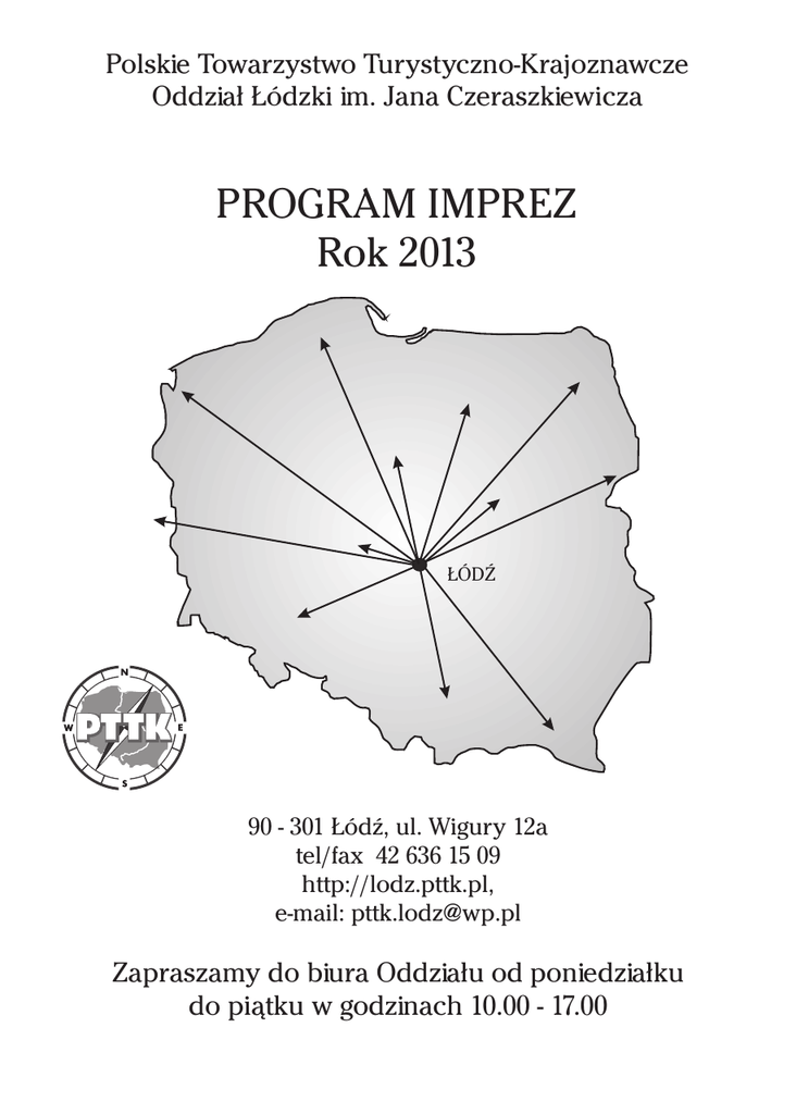 Polskie Towarzystwo Turystyczno-Krajoznawcze Oddział Łódzki im. Jana Czeraszkiewicza PROGRAM IMPREZ Rok 2013 ŁÓDŹ 90 - 301 Łódź, ul. Wigury 12a tel/fax 42 636 15 09 http://lodz.pttk.pl, e-mail: [email protected] Zapraszamy do biura Oddziału od poniedziałku do piątku w godzinach 10.00 - 17.00 Z ogromn¹ przyjemnoœci¹ przekazujemy na Pañstwa rêce kolejn¹ edycjê „Katalogu wycieczek autokarowych Oddzia³u £ódzkiego PTTK”. Stale rosn¹ce grono wiernych uczestników naszych imprez jest najlepsz¹ motywacj¹ do poszukiwania nowych tras, pomys³ów i miejsc w Polsce które chcielibyœmy przybli¿yæ naszym turystom. W bie¿¹cym roku uda³o siê utrzymaæ przyjêt¹ regu³ê, wedle której po³owê katalogu stanowi¹ znane i lubiane propozycje z lat ubieg³ych (czêsto jednak w nieco zmienionym uk³adzie), drug¹ czêœæ tworz¹ z tak¹ niecierpliwoœci¹ oczekiwane nowoœci. Z dum¹ musimy podkreœliæ, i¿ nowoœciami s¹ nie tylko nieodwiedzane do tej pory miejscowoœci i obiekty, ale te¿ nowe w swym charakterze imprezy. Fundament katalogu stanowi¹ tradycyjne wycieczki krajoznawcze, o d³ugoœci od jednego do piêciu dni. Podczas 36 takich podró¿y powêdrujemy szlakami tematycznymi (m.in. „Œladami Mickiewicza i Bonapartego w Wielkopolsce”, „Szlakiem Tuwima po Ziemi Tomaszowskiej”, œladami filmowego Ojca Mateusza na wycieczce „Sandomierz bez poœpiechu”), odwiedzimy imprezy tematyczne przybli¿aj¹ce genius loci zwiedzanego terenu (jarmark wielkanocny w Sierpcu, Czarne Wesele w skansenie w Klukach, procesja Bo¿ego Cia³a w £owiczu, Europejskie Œwiêto Bursztynu w Wieluniu, rekonstrukcja epizodów Bitwy nad Bzur¹ w Sochaczewie czy jarmarki bo¿onarodzeniowe w Krakowie i Berlinie). Radzi z uznania jakim cieszy siê seria wyjazdów o wspólnym mianowniku „bez poœpiechu” rozszerzyliœmy rodzinê miast stanowi¹cych cel tych wycieczek o Bydgoszcz, Legnicê, W³oc³awek i dawno przez nas nie odwiedzane Zakopane. Dziêkuj¹c za liczne g³osy z Pañstwa strony dotycz¹ce wymarzonych kierunków podró¿y na karty naszego katalogu zawita³y m.in. wycieczki na Kana³ Ostródzko - Elbl¹ski, Kaszuby, czy Roztocze. Nie zapomnieliœmy jednak o klasyce polskich szlaków wycieczkowych. Z myœl¹ o tych którzy zaczynaj¹ swoj¹ przygodê z poznawaniem Polski, ale i o koneserach pragn¹cych odœwie¿yæ sobie w pamiêci ukochane miejsca proponujemy wycieczki do Krakowa, Warszawy (choæ tym razem w nieco innych wydaniach), Kazimierza Dolnego i Koz³ówki, Wroc³awia czy najpiêkniejszych jesieni¹ Bieszczadów. Patrz¹c na szlaki naszych wêdrówek z bardziej ogólnej perspektywy dostrzec mo¿na œlady naszej bytnoœci w 15 z 16 województw (w tym 11 z wizyt¹ w stolicy województwa), odwiedzamy kilkakrotnie administracyjn¹ stolicê Polski (Warszawê), zawitamy te¿ do stolicy kulturalnej i historycznej (Krakowa), oraz do stolic turystycznych: zimowej (Zakopanego) i letniej (£eby, Ustki, Miêdzyzdrojów). Najbardziej elektryzuj¹ce mog¹ okazaæ siê jednak nowoœci. W tym roku: • po raz pierwszy przekraczamy granice Polski – zapraszamy na wspania³y jarmark bo¿onarodzeniowy do Berlina (a wiêc kolejna stolica do wpisania na nasz¹ nieformaln¹ listê :-) . • pierwszy raz podjêliœmy siê tak¿e organizacji wczasów pobytowych, nie zapominaj¹c jednak o Pañstwa krajoznawczej pasji wzbogaciliœmy ich program o kilka wycieczek do najciekawszych obiektów w okolicy. Na pocz¹tek zapraszamy na 9 dniowy pobyt na Wyspie Wolin w niezwykych Miêdzyzdrojach • po raz pierwszy przekroczyliœmy magiczn¹ liczbê 100 dni ³¹cznego trwania wszystkich proponowanych wycieczek. O jedn¹ czwart¹ wzros³a te¿ wzglêdem roku ubieg³ego iloœæ kilometrów jakie mamy do przejechania – w 2013 bêdzie to ponad 26 500 km, a wiêc odleg³oœæ pozwalaj¹ca odbyæ wyprawê do Australii i z powrotem! Bazuj¹c na Pañstwa sugestiach przygotowaliœmy tak¿e dwie linie produktów skierowanych do turystów nastawionych na nieco wiêksz¹ aktywnoœæ fizyczn¹ i bli¿szy kontakt z przyrod¹ ni¿ ma to miejsce podczas podro¿y autokarowej. Nie rezygnuj¹c z komfortu podczas noclegu i przejazdu, zapraszamy do pieszych wêdrówek górskich w ramach zakrojonego na trzy kolejne lata projektu „Zdobywamy Koronê Beskidów”, oraz do pomyœlanego na kilka kolejnych sezonów cyklu „Poznajemy Parki Narodowe” gdzie wêdrowaæ bêdziemy po najcenniejszych przyrodniczo rejonach Polski. Bli¿szych informacji na temat tych wyjazdów prosimy szukaæ w koñcowej czêœci katalogu. Mamy nadziejê ¿e nasz¹ ofert¹ pomo¿emy spe³niæ choæ czêœæ Pañstwa turystycznych marzeñ! - Za³oga Biura Oddzia³u £ódzkiego PTTK - 24 marca (Niedziela Palmowa) „JARMARK WIELKANOCNY W SIERPCU” Sierpc – Skansen Wsi Mazowieckiej (zwiedzanie wystawy „Wielkanoc na Mazowszu” prezentowanej w 10 zagrodach ch³opskich z koñca XIX i pocz¹tku XX w., oraz dworze szlacheckim, prezentacje zwyczajów wielkanocnych w cha³upach ch³opskich: wykonywanie palm, malowanie jaj, przygotowanie œwiêconki, zdobienie pod³óg ; piaskiem, wielkanocny kiermasz rêkodzie³a; P³ock – Wzgórze Tumskie z zespo³em katedralno – zamkowym, katedra mariawicka, zachowane rogatki miejskie, klasycystyczna zabudowa Starego Rynku z XIX w.; UWAGA: planowany powrót do £odzi ; oko³o godz. 18.00 umo¿liwiaj¹cy wziêcie udzia³u w mszy œwiêtej; 6-7 kwietnia ,,KRAKÓW BEZ POŒPIECHU” Kraków - Stare Miasto z Drog¹ Królewsk¹, Wzgórze Wawelskie wraz z katedr¹ i grobami królewskimi, dzielnica ¿ydowska Kazimierz, Nowa Huta - modelowy przyk³ad architektury socrealizmu, opactwo Cystersów w Mogile z XIII w., Krzes³awice - dworek Jana Matejki ; ulubiona rezydencja letnia artysty; 13-14 kwietnia ,,BYDGOSZCZ BEZ POŒPIECHU” Bydgoszcz - ,,Bydgoska Wenecja” - zabytkowy zespó³ urbanistyczny nad brzegami Brdy, zabytki sakralne Starego Miasta rozsiane na trzech wyspach, zespó³ zabytkowych spichlerzy z XVIII i