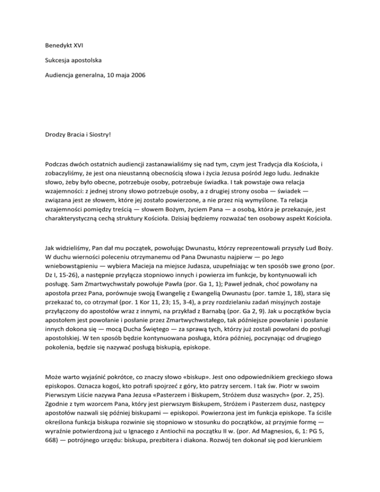 Benedykt XVI Sukcesja apostolska Audiencja generalna, 10 maja 2006 Drodzy Bracia i Siostry! Podczas dwóch ostatnich audiencji zastanawialiśmy się nad tym, czym jest Tradycja dla Kościoła, i zobaczyliśmy, że jest ona nieustanną obecnością słowa i życia Jezusa pośród Jego ludu. Jednakże słowo, żeby było obecne, potrzebuje osoby, potrzebuje świadka. I tak powstaje owa relacja wzajemności: z jednej strony słowo potrzebuje osoby, a z drugiej strony osoba — świadek — związana jest ze słowem, które jej zostało powierzone, a nie przez nią wymyślone. Ta relacja wzajemności pomiędzy treścią — słowem Bożym, życiem Pana — a osobą, która je przekazuje, jest charakterystyczną cechą struktury Kościoła. Dzisiaj będziemy rozważać ten osobowy aspekt Kościoła. Jak widzieliśmy, Pan dał mu początek, powołując Dwunastu, którzy reprezentowali przyszły Lud Boży. W duchu wierności poleceniu otrzymanemu od Pana Dwunastu najpierw — po Jego wniebowstąpieniu — wybiera Macieja na miejsce Judasza, uzupełniając w ten sposób swe grono (por. Dz I, 15-26), a następnie przyłącza stopniowo innych i powierza im funkcje, by kontynuowali ich posługę. Sam Zmartwychwstały powołuje Pawła (por. Ga 1, 1); Paweł jednak, choć powołany na apostoła przez Pana, porównuje swoją Ewangelię z Ewangelią Dwunastu (por. tamże 1, 18), stara się przekazać to, co otrzymał (por. 1 Kor 11, 23; 15, 3-4), a przy rozdzielaniu zadań misyjnych zostaje przyłączony do apostołów wraz z innymi, na przykład z Barnabą (por. Ga 2, 9). Jak u początków bycia apostołem jest powołanie i posłanie przez Zmartwychwstałego, tak późniejsze powołanie i posłanie innych dokona się — mocą Ducha Świętego — za sprawą tych, którzy już zostali powołani do posługi apostolskiej. W ten sposób będzie kontynuowana posługa, która później, poczynając od drugiego pokolenia, będzie się nazywać posługą biskupią, episkope. Może warto wyjaśnić pokrótce, co znaczy słowo «biskup». Jest ono odpowiednikiem greckiego słowa episkopos. Oznacza kogoś, kto potrafi spojrzeć z góry, kto patrzy sercem. I tak św. Piotr w swoim Pierwszym Liście nazywa Pana Jezusa «Pasterzem i Biskupem, Stróżem dusz waszych» (por. 2, 25). Zgodnie z tym wzorcem Pana, który jest pierwszym Biskupem, Stróżem i Pasterzem dusz, następcy apostołów nazwali się później biskupami — episkopoi. Powierzona jest im funkcja episkope. Ta ściśle określona funkcja biskupa rozwinie się stopniowo w stosunku do początków, aż przyjmie formę — wyraźnie potwierdzoną już u Ignacego z Antiochii na początku II w. (por. Ad Magnesios, 6, 1: PG 5, 668) — potrójnego urzędu: biskupa, prezbitera i diakona. Rozwój ten dokonał się pod kierunkiem Ducha Bożego, który pomaga Kościołowi w rozeznawaniu autentycznych form sukcesji apostolskiej, coraz lepiej określanych pośród wielorakości doświadczeń oraz form charyzmatycznych i służebnych, występujących w pierwotnych wspólnotach. Tak więc sukcesja w funkcji biskupiej jawi się jako kontynuacja posługi apostolskiej, gwarancja trwania w Tradycji apostolskiej, słowa i życia, powierzonej nam przez Pana. Więź między kolegium biskupów i pierwotną wspólnotą apostołów rozumiana jest przede wszystkim w sensie ciągłości historycznej. Jak widzieliśmy, do Dwunastu zostaje najpierw dołączony Maciej, później Paweł, następnie Barnaba, a potem inni, i w końcu powstaje w drugim i trzecim pokoleniu posługa biskupa. Tak więc ciągłość wyraża się w tym historycznym łańcuchu. Ciągłość sukcesji jest gwarancją trwania we wspólnocie kościelnej kolegium apostolskiego zgromadzonego przy Chrystusie przez Niego samego. Jednakże tę ciągłość, którą dostrzegamy najpierw w historycznej ciągłości szafarzy, należy rozumieć również w sensie duchowym, ponieważ sukcesja apostolska w posłudze uważana jest za szczególne miejsce działania i przekazywania Ducha Świętego. Wyraźne echo tych przekonań znajdujemy, na przykład, w następującym tekście Ireneusza z Lyonu (druga połowa II w.): «Otóż każdy, kto chce zobaczyć prawdę, może stwierdzić w każdym Kościele tradycję Apostołów na całym świecie. I możemy wyliczyć tych, których Apostołowie ustanowili biskupami w kościołach, oraz ich następców aż do nas. (...) [Apostołowie] chcieli bowiem, żeby ci, których zostawili jako swoich następców i którym przekazali swój własny urząd nauczycielski, byli 'doskonałymi' i nienagannymi. Ich prawidłowa działalność przyniosłaby dużą korzyść, a upadek spowodowałby dużą klęskę» (Adversus haereses, III, 3, 1: PG 7, 848; tłum. Andrzej Bober SJ, Antologia patrystyczna, Wydawnictwo WAM, Kraków 1966, s. 39). Wskazując tu na tę sieć sukcesji apostolskiej jako gwarancję zachowania słowa Pańskiego, Ireneusz skupia uwagę na Kościele «największym i najstarszym, i wszystkim znanym», który został «przez dwu najchwalebniejszych apostołów Piotra i Pawła założony i ustanowiony w Rzymie», uwydatniając Tradycję wiary, która w nim dociera do nas od apostołów przez sukcesję biskupów. I tak dla Ireneusza i dla Kościoła powszechnego sukcesja biskupów Kościoła rzymskiego staje się znakiem, kryterium oraz gwarancją nieprzerwanego przekazu wiary apostolskiej: «Z tym bowiem Kościołem dla jego naczelnego zwierzchnictwa (propter potentiorem principalitatem) musi się zgadzać każdy Kościół, tj. wszyscy zewsząd wierni, bo w nim przez tych, co są zewsząd, zachowała się tradycja apostolska» (Adversus haereses, III, 3, 2: PG 7, 848; dz. cyt., s. 39). Tak więc sukcesja apostolska — która opiera się na komunii z sukcesją Kościoła Rzymu — stanowi kryterium trwania poszczególnych Kościołów w Tradycji wspólnej wiary apostolskiej, która tą drogą mogła od początków dotrzeć aż do nas: «Tym porządkiem i takim następstwem trady