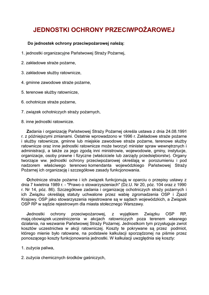 JEDNOSTKI OCHRONY PRZECIWPOŻAROWEJ Do jednostek ochrony przeciwpożarowej należą: 1. jednostki organizacyjne Państwowej Straży Pożarnej, 2. zakładowe straże pożarne, 3. zakładowe służby ratownicze, 4. gminne zawodowe straże pożarne, 5. terenowe służby ratownicze, 6. ochotnicze straże pożarne, 7. związek ochotniczych straży pożarnych, 8. inne jednostki ratownicze. Zadania i organizację Państwowej Straży Pożarnej określa ustawa z dnia 24.08.1991 r. z późniejszymi zmianami. Ostatnie wprowadzono w 1996 r. Zakładowe straże pożarne i służby ratownicze, gminne lub miejskie zawodowe straże pożarne, terenowe służby ratownicze oraz inne jednostki ratownicze może tworzyć minister spraw wewnętrznych i administracji, a także za jego zgodą inni ministrowie, wojewodowie, gminy, instytucje, organizacje, osoby prawne i fizyczne (właściciele lub zarządy przedsiębiorstw). Organy tworzące ww. jednostki ochrony przeciwpożarowej określają w porozumieniu i pod nadzorem właściwego terenowo komendanta wojewódzkiego Państwowej Straży Pożarnej ich organizację i szczegółowe zasady funkcjonowania. Ochotnicze straże pożarne i ich związek funkcjonują w oparciu o przepisy ustawy z dnia 7 kwietnia 1989 r. - "Prawo o stowarzyszeniach" (Dz.U. Nr 20, póz. 104 oraz z 1990 r. Nr 14, póz. 86). Szczegółowe zadania i organizację ochotniczych straży pożarnych i ich Związku określają statuty uchwalone przez wabię zgromadzenia OSP i Zjazd Krajowy. OSP jako stowarzyszenia rejestrowane są w sądach wojewódzkich, a Związek OSP RP w sądzie rejestrowym dla miasta stołecznego Warszawy. Jednostki ochrony przeciwpożarowej, z wyjątkiem Związku OSP RP, mają obowiązek uczestniczenia w akcjach ratowniczych poza terenem własnego działania, na wezwanie Państwowej Straży Pożarnej. Jednostkom tym przysługuje zwrot kosztów uczestnictwa w akcji ratowniczej. Koszty te pokrywane są przez podmiot, którego mienie było ratowane, na podstawie kalkulacji sporządzonej na piśmie przez ponoszącego koszty funkcjonowania jednostki. W kalkulacji uwzględnia się koszty: 1. zużycia paliwa, 2. zużycia chemicznych środków gaśniczych, 3. amortyzacji sprzętu, 4. wynagrodzeń osobowych, 5. wyżywienia, 6. poniesionych strat w wypadku awarii, uszkodzenia lub utraty sprzętu. Na żądanie podmiotu zwracającego koszty właściwa komenda rejonowa PSP jest obowiązana potwierdzić udział jednostek w działaniu ratowniczym. Jeżeli zwraca jacy koszty nie zgadza się z kalkulacją, może wystąpić do właściwego komendanta rejonowego PSP z wnioskiem o wydanie odpłatnej opinii w tej sprawie. Opinia stanowi podstawę do zmiany kalkulacji kosztów uczestnictwa jednostki ratowniczej poza terenem jej działania.