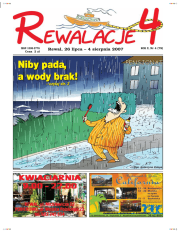 ISSN 1508-2776 Cena 2 zł Rewal, 26 lipca – 4 sierpnia 2007 ROK X, Nr 4 (79) Niby pada, a wody brak! – czytaj str. 3 – czytaj str. 3 Rys. Katarzyna Zalepa CO SŁYCHAĆ? Prezentujemy czwarty numer naszej gazety. Jak zwykle nie można przejść obok niej obojętnie. Dziennikarze Rewalacji postarali się nie tylko o genialną szatę graficzną, ale i o zapierające dech w piersiach, wspaniałe artykuły. Węszymy wszędzie – znamy wszystkie rewalskie uliczki i każdą ważną informacje. Nasz wywiad działa nieustannie, w dzień i w nocy. Rozmawialiśmy z Kabaretem Moralnego Niepokoju i z Paranienormalnymi. Zajęliśmy się pupilami i ścieżkami rowerowymi. Dyskutowaliśmy z turystami, sprzedawcami i z władzami. Chcemy Was o wszystkim informować na bieżąco. Polecam słuchanie RewalStacji 99,2 FM, gdzie tworzymy audycje na żywo. Odwiedźcie też naszą stronę internetową www.potegaprasy.pl. Ten wstęp nie jest reklamą. To czysta prawda. Koniecznie zwróćcie uwagę na te genialne rysunki... Polecam! Hejka hej!:) ANIA SIWIERSKA KIT (Krótkie Informacje Tekstowe) „Niechoże” – czy znacie taką miejscowość? To właśnie tam 26 lipca zawita Cyrk Arlekin. Nazwa została zapisana z błędem na biletach. Zapewne artyści pojawią się w znanym Niechorzu, gdzie odbędzie się ich występ. IV Festiwal Piosenki Morskiej „Złoty Sekstans 2007” odbędzie się 28 lipca na plaży w Pobierowie. W konkursie zaprezentują się młodzieżowe zespoły szantowe. Główną nagrodą dla najlepszej grupy, oprócz statuetki „Złoty Sekstans” jest 1000 zł. Początek imprezy o godzinie 18.00 – wstęp wolny. W numerze m.in.: Latarnik – ta praca była moim marzeniem – str. 5 Rozwiązanie konkursu na najpiękniejszy ogród – str. 8 Problem na czterech łapach – jak radzić sobie z czworonogiem na wakacjach – str. 11 Krejzole w Rewalu – Normalna rozmowa z Paranienormalnymi – str. 12 Wywiad z Kabaretem Moralnego Niepokoju – str. 13 2 MILENA KASZUBA, EWELINA RYTEL, FILIP WIETESKA Kalendarium imprez biegać przez Rewal, Gościno 26 lipca – wrocławski kabaret i Kołobrzeg. Neo-Nówka. Rewal, amfiteatr, 28 lipca – Lambda Beach – turgodz. 18: 00. niej siatkówki plażowej trójek. 26 lipca – Cyrk Arlekin. NiechoPustkowo, plaża. rze, ul. Polna, godz. 18: 30. 26 lipca – Krzysztof Krawczyk. 28 lipca – V Mistrzowstwa Strażaków Ochotnikow – Stihl TimberRewal, amfiteatr, godz. 20: 30. sports Series. Rewal, amfiteatr. 27 lipca – Cyrk Arlekin. Rewal, ul. 28 lipca – Run and Gun Street Słoneczna, godz. 18: 30. Ball Tour – IV Edycja koszykówki 27 lipca – Ogólnopolski Wieloetaamatorów, Pobierowo. powy Wyścig Kolarski o Puchar MILENA KASZUBA, EWELINA RYTEL Bałtyku 2007. Trasa będzie prze- Redaktor naczelna: Ania Siwierska Zastępca: Kuba August Zastępca zastępcy: Kasia Surowik Sekretarz (sekretarka): Kasia Więcek Nadworny grafik: Agnieszka Krzemień Dział foto: Maja Matusiak, Mateusz Stępniak Reklama: Marta Wągrowska, Marta Makus Korekta: Kasia Surowik, Agnieszka Krzemień, Kasia Więcek Przeszkadzała i pomagała: Agnieszka Pacho Skład: Grzegorz Ożga Adres Redakcji: Rewal, ul. Sikorskiego 10, tel. 607 650 742, e-mail: [email protected], URL: http://www.potegaprasy.pl Druk: Drukarnia Prasowa BJ Print s.c. Gryfice, ul. Bracka 4 Turniej siatkówki plażowej – Tatarek Beach Ball odbędzie się 29 lipca na plaży w Pustkowie. Każdy może w nim spróbować swych sił. Zapisy w dniu imprezy w godz. 10.00 – 10.30. Skarpa obok wejścia na plażę przy ul. Sikorskiego obsunęła się 22 lipca. Prawdopodobnie przyczyną zawalenia były obfite opady deszczu. Dzień później ekipa porządkowa zabezpieczyła obszar zagrażający turystom. – Mimo, że tablice informujące o niebezpieczeństwie istnieją tu od dawna, wczasowicze lekkomyślnie ignorują je, nie zważając na ryzyko – mówi jedna z kelnerek restauracji „U rybaka”. WIEŚCI Z REWALA Kolejna ulewa powodująca brak wody w kranach zaskoczyła nas w niedzielę 22 lipca. Zakręcony... kurek Jak wyjaśnił wójt Robert Skraburski, sytuacja spowodowana była troską... o mieszkańców! Zakład Wodociągów i Kanalizacji nie nadążał z odpompowywaniem ścieków i władze zdecydowały o odłączeniu wody. W przeciwnym wypadku osobom zamieszkałym na terenie Rewala groziłoby podtopienie. Te wiadomości dotarły do nas jednak dopiero w poniedziałek. Jak twierdzi Skraburski, telefon, pod którym zwykle udzielane są takie informacje, został zalany. Z kolei Roman Chałupnik, kierownik działu obsługi i odbiorców jest brak wody – dlatego przygotowali papierowe talerze, na których wydawano posiłki. Tylko przyjezdnym dokuczała awaria. – Przez cały dzień próbowałam dowiedzieć się, dlaczego nie ma wody. Nikt nie był w stanie mi odpowiedzieć – mówi Jadwiga z Jaworzna. Brak wiadomości powodował, że wśród wypoczywających pojawiły się plotki. – Słyszałem, że piorun uderzył w przepompownię w Pobierowie – poinformował nas Radosław z Olsztyna. Fot. Agnieszka Krzemień Zakładu Wodociągów i Kanalizacji w Pobierowie, do którego udało nam się dodzwonić we wtorek, powiedział: – Nie można było się z nami skontaktować, ponieważ wszyscy byli na akcji. Opinie turystów i mieszkańców także były sprzeczne. Nikt nie posiadał pełnych i rzetelnych danych. Biuro Ujęcia Wody w Rewalu nie potrafiło wyjaśnić co się stało, a telefon wodociągów w Pobierowie milczał. Właściciele i pracownicy restauracji również nie mieli żadnych wiadomości. Są przyzwyczajeni, że skutkiem każdej ulewy w Rewalu Z kolei Maria z Krakowa była przekonana, że pękła rura kanalizacyjna. Pracownicy lodziarni Sacramento zastanawiali się zaś, czy nie było to spowodowane rozporządzeniem wójta gminy. – Najprawdopodobniej wylały szamba – informuje Gustaw z Sosnowca. Z kolei Janusz z Jarandowa mówił, że zostały zalane pompy. Jak nam doniesiono, w Pobierowie, które