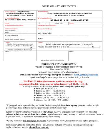 DRUK OPŁATY OKRESOWEJ Nazwa odbiorcy: Okręg Polskiego Nazwa odbiorcy: Okręg Polskiego Związku Wędkarskiego w Szczecinie ul. Mickiewicza 3, 70-383 Szczecin Związku Wędkarskiego w Szczecinie ul. Mickiewicza 3, 70-383 Szczecin Nr rachunku odbiorcy: 35 1240 3813 1111 0000 4375 6719 kwota: Nr rachunku odbiorcy: 35 1240 3813 1111 0000 4375 6719 W P waluta: PLN Nr rachunku lub kwota słownie: Nr rachunku lub kwota słownie: Nazwa zleceniodawcy: Nazwa zleceniodawcy: Imię i nazwisko: ……………………….………….. Adres: ……………………………………….……… Nr karty wędkarskiej …………………………..…. Rodzaj wody (nizinna, górska) ……………….… Tytułem: Składka okresowa na zagospodarowanie i ochronę wód. Ważna na dzień/ dni/ 3 m-ce ……..……………………………...….…….20…...r. kwota: Imię i nazwisko: …………………………………………..…………...................…………..……...….…… Adres: ……………………………………………………………………….…………………………...…..…….. Tytułem: Składka okresowa na zagospodarowanie i ochronę wód Ważna na dzień/ dni/ 1 m-c/ 3 m-ce ……………………………….………. 20……..….r. wraz z zezwoleniem okresowym Opłata: Opłata: /pieczęć, data i podpis(y) zleceniodawcy/ DRUK OPŁATY OKRESOWEJ ważny wyłącznie z zezwoleniem okresowym: dla członków PZW lub osób niezrzeszonych/ cudzoziemców Druk zezwolenia okresowego dostępny na stronie: www.pzwszczecin.com - pod tabelą opłat okresowych oraz w drukach do pobrania WAŻNE !!! Składki okresowe ważne są od daty do daty, natomiast składki roczne na rok kalendarzowy od 01.01. – 31.12. Do opłaty okresowej konieczne jest podanie konkretnej daty połowu np. 1 dzień (np. 10.01.2015r.) 3 dni (np. od 10.01. – 12.01.2015r.) 7 dni (np. od 10.01. – 16.01.2015r.) 14 dni (np. od 10.01. - 23.01.2015r.) 1 miesiąc (np. od 10.01. – 09.02.2015r.) 3 miesiące (np. od 10.01. - 09.04.2015r.) W przypadku nie wpisania daty na druku, będzie uwzględniana data wpłaty /pieczęć banku, urzędu pocztowego bądź data przelewu z prywatnego konta bankowego/ Każdy wędkarz wybierający się nad wodę Okręgu PZW w Szczecinie zobowiązany jest posiadać własną opłatę – na swoje imię i nazwisko, wydrukowane z naszej strony zezwolenie okresowe (wraz z wykazem wód), z wpisanym numerem karty wędkarskiej. Wpłaty okresowe nie podlegają zwrotowi /w przypadku nie wykorzystania wodę opłata przepada/. Dokonana wpłata na konkretny dzień – dni, miesiąć dotyczy wyłącznie wpisanego okresu i po wpłaceniu danej kwoty nie podlega zmianie.