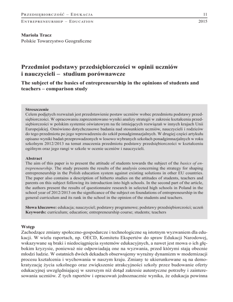 Prz e d s ię biorc z oś ć – E d u k ac j a 11 Entr e p re n e u rs h ip – E d u c at i on 2015 Mariola Tracz Polskie Towarzystwo Geograficzne Przedmiot podstawy przedsiębiorczości w opinii uczniów i nauczycieli – studium porównawcze The subject of the basics of entrepreneurship in the opinions of students and teachers – comparison study Streszczenie Celem podjętych rozważań jest przedstawienie postaw uczniów wobec przedmiotu podstawy przedsiębiorczości. W opracowaniu zaprezentowano wyniki analizy strategii w zakresie kształcenia przedsiębiorczości w polskim systemie oświatowym na tle istniejących rozwiązań w innych krajach Unii Europejskiej. Omówiono dotychczasowe badania nad stosunkiem uczniów, nauczycieli i rodziców do tego przedmiotu po jego wprowadzeniu do szkół ponadgimnazjalnych. W drugiej części artykułu opisano wyniki badań przeprowadzonych w losowo wybranych szkołach ponadgimnazjalnych w roku szkolnym 2012/2013 na temat znaczenia przedmiotu podstawy przedsiębiorczości w kształceniu ogólnym oraz jego rangi w szkole w ocenie uczniów i nauczycieli. Abstract The aim of this paper is to present the attitude of students towards the subject of the basics of entrepreneurship. The study presents the results of the analysis concerning the strategy for shaping entrepreneurship in the Polish education system against existing solutions in other EU countries. The paper also contains a description of hitherto studies on the attitudes of students, teachers and parents on this subject following its introduction into high schools. In the second part of the article, the authors present the results of questionnaire research in selected high schools in Poland in the school year of 2012/2013 on the significance of the subject on foundations of entrepreneurship in the general curriculum and its rank in the school in the opinion of the students and teachers. Słowa kluczowe: edukacja; nauczyciel; podstawy programowe; podstawy przedsiębiorczości; uczeń Keywords: curriculum; education; entrepreneurship course; students; teachers Wstęp Zachodzące zmiany społeczno-gospodarcze i technologiczne są istotnym wyzwaniem dla edukacji. W wielu raportach, np. OECD, Komitetu Ekspertów do spraw Edukacji Narodowej, wskazywane są braki i niedociągnięcia systemów edukacyjnych, a nawet jest mowa o ich głębokim kryzysie, ponieważ nie odpowiadają one na wyzwania, przed którymi stają obecnie młodzi ludzie. W ostatnich dwóch dekadach obserwujemy wyraźny dynamizm w modernizacji procesu kształcenia i wychowania w naszym kraju. Zmiany te ukierunkowane są na demokratyzację życia szkolnego oraz zwiększenie atrakcyjności szkoły przez budowanie oferty edukacyjnej uwzględniającej w szerszym niż dotąd zakresie autentyczne potrzeby i zainteresowania uczniów. Z tych raportów i opracowań jednoznacznie wynika, że edukacja powinna 392 Mariola Tracz wspierać zarówno realizację ogólnoświatowych wyzwań współczesności, jak i wszechstronny rozwój pojedynczej osoby, w tym wypadku ucznia. Jednym z istotnych zadań systemu edukacji i działań dydaktycznych podejmowanych przez nauczycieli jest przygotowanie młodych ludzi do ustawicznej pracy nad sobą, samokształcenia i uczenia się przez całe życie oraz odpowiedzialności za przyszłość swoją i innych. W tym kontekście istotne jest pytanie o kanon wykształcenia ogólnego w czasach, kiedy społeczność przemysłowa ustępuje miejsca społeczności informacyjnej, a dostęp do informacji i sposoby jej praktycznego zastosowania nabierają istotnego znaczenia w rozwoju i innowacyjności gospodarki oraz podnoszeniu jakości życia społecznego. Edukacja nie stanowi procesu wyizolowanego, jest ściśle powiązana z procesami politycznymi, gospodarczymi i społecznymi. Przyjęte po 1989 r. rozwiązania w systemie oświaty w Polsce istotnie zmieniły nie tylko system szkolnictwa, lecz także kanon wykształcenia ogólnego. Mocno zostało zaakcentowane m.in.: przygotowanie obywateli do życia w demokracji, gospodarka oparta na zasadach liberalizmu i prawa rynku, pluralizm polityczny i kulturowy, członkostwo w UE, globalny i lokalny kontekst zmian społeczno-gospodarczych. Wyrazem tych zmian w podejściu do kształcenia są opracowane przez MEN podstawy programowe, ramowe plany nauczania oraz wymagania egzaminacyjne. Nie ulega wątpliwości, że dokumenty te określają politykę edukacyjną państwa oraz wyznaczają kierunki działań dydaktycznych, zmierzających do przygotowania młodych ludzi do aktywnego uczestnictwa w szybko zmieniającej się rzeczywistości. Ramowe plany nauczania, zawierające zestaw przedmiotów i liczbę godzin przeznaczoną na ich realizację w poszczególnych typach szkół, są też informacją dla nauczycieli, uczniów i rodziców, jaką ma rangę dany przedmiot w kształceniu ogólnym. Wprowadzenie nowego przedmiotu podstawy przedsiębiorczości do szkół ponadgimnazjalnych w 2002 r. stanowiło odpowiedź na zachodzące w kraju przemiany społeczno-gospodarcze. Jego celem było pobudzanie przedsiębiorczości wśród społeczeństwa (Dorocki i inni, 2011; Rachwał, 2004, 2008; Rachwał i inni, 2009; Tracz, 2005, 2006; Tracz, Rachwał, 2007; Wach, 2008, 2013; Zioło, 2005, 2012). Cel i metody badań Z punktu widzenia efektywności procesu kształcenia istotne jest podejmowanie refleksji nad jego funkcjonowaniem, m.in. przez poszukiwanie odpowiedź na pytanie, w jakim stopniu przyjęte rozwiązania systemowe są realizowane w praktyce i spełniają pokładane w nich nadzieje. Niniejsze opracowanie ma na celu zdiagnozowanie rangi przedmiotu podstawy przedsiębiorczości w systemie szkolnym w świetle przyjętych rozwiązań systemowych oraz w ocenie uczniów i nauczycieli. Autorka przeprowadziła badania ankietowe wśród uczniów liceów ogólnokształcących i techników oraz wywiady z nauczycielami tego przedmiotu. Miały one na celu poznanie dwóch zagadnień: • opinii uc