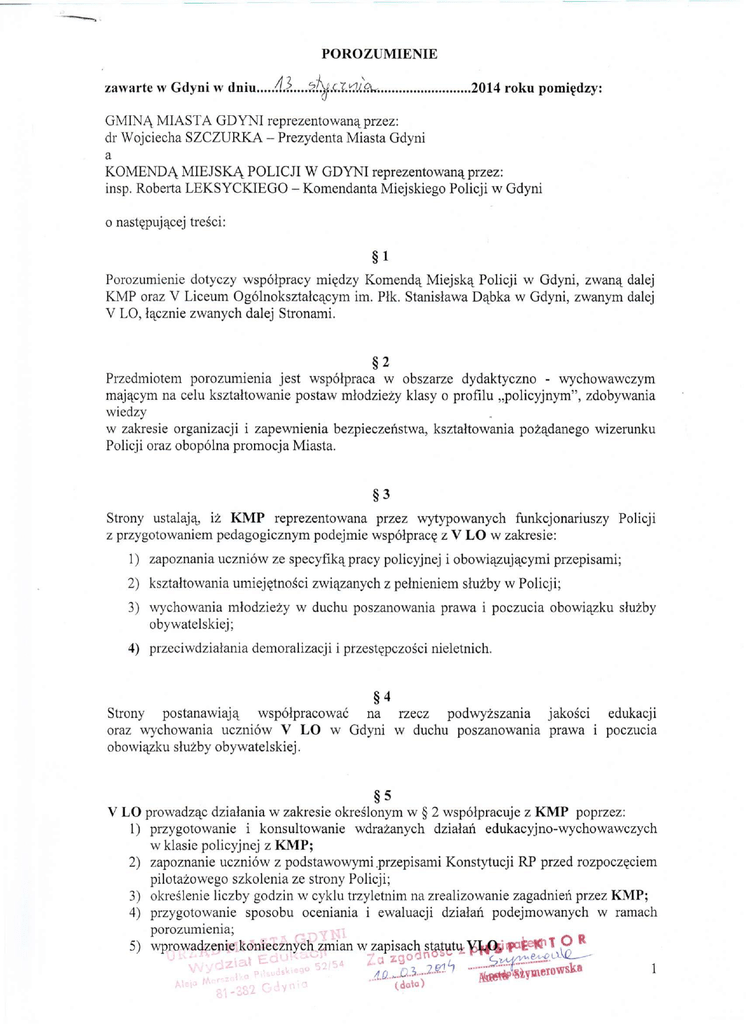 POROZUMIENIE zawarte w Gdyni w dniu. LT.&LGw. 2014 roku pomiędzy: GMINĄ M I A S T A G D Y N I reprezentowaną przez: dr Wojciecha S Z C Z U R K A - Prezydenta Miasta Gdyni a KOMENDĄ MIEJSKĄ POLICJI W G D Y N I reprezentowaną przez: insp. Roberta L E K S Y C K I E G O - Komendanta Miejskiego Policji w Gdyni o następującej treści: §1 Porozumienie dotyczy współpracy między Komendą Miejską Policji w Gdyni, zwaną dalej K M P oraz V Liceum Ogólnokształcącym im. Płk. Stanisława Dąbka w Gdyni, zwanym dalej V LO, łącznie zwanych dalej Stronami. §2 Przedmiotem porozumienia jest współpraca w obszarze dydaktyczno - wychowawczym mającym na celu kształtowanie postaw młodzieży klasy o profilu „policyjnym", zdobywania wiedzy w zakresie organizacji i zapewnienia bezpieczeństwa, kształtowania pożądanego wizerunku Policji oraz obopólna promocja Miasta. §3 Strony ustalają iż KMP reprezentowana przez wytypowanych funkcjonariuszy Policji z przygotowaniem pedagogicznym podejmie współpracę z V LO w zakresie: 1) zapoznania uczniów ze specyfiką pracy policyjnej i obowiązującymi przepisami; 2) kształtowania umiejętności związanych z pełnieniem służby w Policji; 3) wychowania młodzieży w duchu poszanowania prawa i poczucia obowiązku służby obywatelskiej; 4) przeciwdziałania demoralizacji i przestępczości nieletnich. §4 Strony postanawiają współpracować na rzecz podwyższania jakości edukacji oraz wychowania uczniów V LO w Gdyni w duchu poszanowania prawa i poczucia obowiązku służby obywatelskiej. §5 V LO prowadząc działania w zakresie określonym w § 2 współpracuje z KMP poprzez: 1) przygotowanie i konsultowanie wdrażanych działań edukacyjno-wychowawczych w klasie policyjnej z KMP; 2) zapoznanie uczniów z podstawowymi .przepisami Konstytucji RP przed rozpoczęciem pilotażowego szkolenia ze strony Policji; 3) określenie liczby godzin w cyklu trzyletnim na zrealizowanie zagadnień przez KMP; 4) przygotowanie sposobu oceniania i ewaluacji działań podejmowanych w ramach porozumienia; 5) wprowadzenie koniecznych zmian w zapisach statutu VL^OjJ P fe^ ^ Q I A 81 -382 Gdynia (dało) a 1 KMP 1) 2) 3) §6 prowadząc działania w zakresie określonym w § 2 współpracuje z V LO poprzez: prowadzenie zajęć z szeroko rozumianej tematyki policyjnej; udostępnienie pomocy dydaktycznych na wybrane zajęcia edukacyjne; umożliwienie uczniom łączenia nauki w szkole z wybranymi zajęciami zapoznającymi ze specyfiką służby w Policji. §7 Komendant Miejski Policji w Gdyni oraz Dyrektor V Liceum Ogólnokształcącego delegują swoich przedstawicieli do koordynowania współpracy i wspólnie określają ich zadania. §8 1. V LO zobowiązuje się do nie wnoszenia zmian w programie nauczania bez wiedzy i akceptacji K M P . 2. V L O zobowiązuje się do nie wykorzystywania logo Policji, nazwy „Komenda Miejska Policji w Gdyni" na wszelkich formularzach / podaniach o przyjęcie do szkoły lub emblematach mundurowych używanych przez uczniów. §9 Porozumienie zostaje zawarte na czas nieokreślony i obowiązuje od dnia 01 stycznia 2014 r. §10 Porozumienie może być rozwiązane w każdej chwili za zgodą stron lub z zachowaniem sześciomiesięcznego trybu wypowiedzenia przez jedną ze Stron bez podania przyczyny. §11 Wszelkie zmiany lub uzupełnienia niniejszego porozumienia wymagają formy pisemnej pod rygorem nieważności. §12 Porozumienie sporządzono w egzemplarzu dla każdej ze stron. Gdyni ira )YM| JRZAD T f|; dwóch jednobrzmiących egzemplarzach, po jednym Komendant Miejski Pplicji w Gdyni Za z g o d n o ś ć z o r y g ^ n f c K T O *
