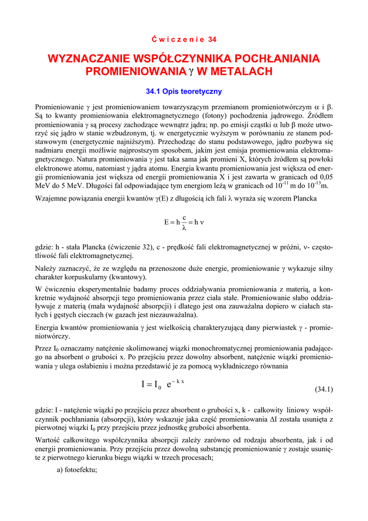 Ć w i c z e n i e 34 WYZNACZANIE WSPÓŁCZYNNIKA POCHŁANIANIA PROMIENIOWANIA γ W METALACH 34.1 Opis teoretyczny Promieniowanie γ jest promieniowaniem towarzyszącym przemianom promieniotwórczym α i β. Są to kwanty promieniowania elektromagnetycznego (fotony) pochodzenia jądrowego. Źródłem promieniowania γ są procesy zachodzące wewnątrz jądra; np. po emisji cząstki α lub β może utworzyć się jądro w stanie wzbudzonym, tj. w energetycznie wyższym w porównaniu ze stanem podstawowym (energetycznie najniższym). Przechodząc do stanu podstawowego, jądro pozbywa się nadmiaru energii możliwie najprostszym sposobem, jakim jest emisja promieniowania elektromagnetycznego. Natura promieniowania γ jest taka sama jak promieni X, których źródłem są powłoki elektronowe atomu, natomiast γ jądra atomu. Energia kwantu promieniowania jest większa od energii promieniowania jest większa od energii promieniowania X i jest zawarta w granicach od 0,05 MeV do 5 MeV. Długości fal odpowiadające tym energiom leżą w granicach od 10-11 m do 10-13m. Wzajemne powiązania energii kwantów γ(E) z długością ich fali λ wyraża się wzorem Plancka E=h c =hν λ gdzie: h - stała Plancka (ćwiczenie 32), c - prędkość fali elektromagnetycznej w próżni, ν- częstotliwość fali elektromagnetycznej. Należy zaznaczyć, że ze względu na przenoszone duże energie, promieniowanie γ wykazuje silny charakter korpuskularny (kwantowy). W ćwiczeniu eksperymentalnie badamy proces oddziaływania promieniowania z materią, a konkretnie wydajność absorpcji tego promieniowania przez ciała stałe. Promieniowanie słabo oddziaływuje z materią (mała wydajność absorpcji) i dlatego jest ona zauważalna dopiero w ciałach stałych i gęstych cieczach (w gazach jest niezauważalna). Energia kwantów promieniowania γ jest wielkością charakteryzującą dany pierwiastek γ - promieniotwórczy. Przez I0 oznaczamy natężenie skolimowanej wiązki monochromatycznej promieniowania padającego na absorbent o grubości x. Po przejściu przez dowolny absorbent, natężenie wiązki promieniowania γ ulega osłabieniu i można przedstawić je za pomocą wykładniczego równania I = I0 e− k x (34.1) gdzie: I - natężenie wiązki po przejściu przez absorbent o grubości x, k - całkowity liniowy współczynnik pochłaniania (absorpcji), który wskazuje jaka część promieniowania ∆I została usunięta z pierwotnej wiązki I0 przy przejściu przez jednostkę grubości absorbenta. Wartość całkowitego współczynnika absorpcji zależy zarówno od rodzaju absorbenta, jak i od energii promieniowania. Przy przejściu przez dowolną substancję promieniowanie γ zostaje usunięte z pierwotnego kierunku biegu wiązki w trzech procesach; a) fotoefektu; b) rozproszenia comptonowskiego; c) tworzenia par elektron-pozyton. W każdym z tych procesów promieniowanie traci energię całkowicie lub częściowo i zmienia kierunek propagacji. Jest to jednoznaczne z ubytkiem kwantów z pierwotnej wiązki. Dla każdego z tych procesów można wprowadzić częściowe współczynniki pochłaniania: w fotoelektrycznym - kf, w zjawisku tworzenia par elektron-pozyton - kp i rozpraszanie w zjawisku Comptona - kc. Całkowity współczynnik pochłaniania jest sumą współczynników w trzech wymienionych procesach k = kf + kc + kp Zjawisko fotoelektryczne polega na oddziaływaniu kwantów z elektronami atomów, w wyniku którego kwant γ zostaje całkowicie pochłonięty γ + e Z → eS gdzie: eZ - elektron związany, eS - elektron swobodny. Energia kwantu idzie na pokonanie energii wiązania elektronu i nadania mu znacznej energii kinetycznej. Proces ten nie może zachodzić dla elektronów swobodnych, gdyż nie jest wtedy spełnione prawo zachowania pędu. Dlatego też zjawisko fotoelektryczne zachodzi najwydatniej dla silnie związanych elektronów wewnętrznych (nadmiar pędu przejmuje jądro atomowe). W związku z tym prawdopodobieństwo zjawiska bardzo silnie zależy od liczby atomowej Z absorbenta (w przybliżeniu~ Z5) oraz szybko maleje ze wzrostem energii kwantu (~ E −γ 3,5 ). Zależność Z5 powoduje, że z łatwo dostępnych materiałów najlepszym absorbentem promieniowania rentgenowskiego i γ jest ołów. Zjawisko Comptona polega na rozpraszaniu kwantów na elektronach swobodnych γ + eS → γ′ + e R gdzie: eS - elektron swobodny, eR - elektron rozproszony, γ ′ - kwant rozproszony. Stratę energii kwantu oraz energię rozproszonego elektronu oblicza się z praw zachowania energii i pędu. Zjawisko Comptona zachodzi z największą wydajnością dla elektronów walencyjnych (elektrony związane na powłokach zewnętrznych można traktować jako swobodne, gdyż ich energia wiązania jest bardzo mała w porównaniu z energią kwantu γ) Prawdopodobieństwo zaistnienia efektu Comptona jest w przybliżeniu proporcjonalne do Z/Eγ. W zakresie energii rzędu 0,5-5 MeV udział tego zjawiska w całkowitej absorpcji jest dominujący. Zjawisko tworzenia par polega na całkowitej absorpcji fotonu i pojawieniu się pary elektronpozyton (e-, e+) γ → e− + e+ Ponieważ w tej reakcji nie mogą być równocześnie spełnione prawa zachowania energii i pędu (pęd kwantu γ jest zawsze większy od pędu pary e+ , e- ), zatem proces tworzenia pary zachodzi w silnym polu elektrycznym jądra , które przejmuje nadmiar pędu. Zjawisko tworzenia par zachodzi powyżej energii progowej równej 1,02 MeV, gdyż energia kwantu γ musi być wyższa od energii spoczynkowej pary elektron-pozyton: Eγ > 2 m c2 gdzie: m - masa spoczynkowa elektronu. Dla szeregu obliczeń zamiast zależności (34.1) wygodniej jest wprowadzić pojęcie warstwy półchłonnej d1/2 . Przy tej grubości warstwy intensywność, strumienia zmniejsza się o połowę. Związek pomiędzy d1/2 i liniowym współczynnikiem pochłaniania k można wprowadzić w następujący sposób: zgodnie ze wzorem dla warstwy półchłonnej mamy: I0 = I 0 e −