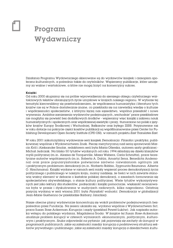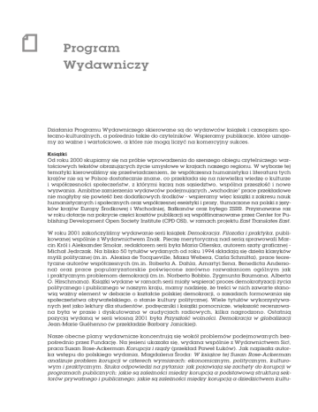50 Program Wydawniczy Program Wydawniczy Dzia³ania Programu Wydawniczego skierowane s¹ do wydawców ksi¹¿ek i czasopism spo³eczno-kulturalnych, a poœrednio tak¿e do czytelników. Wspieramy publikacje, które uznajemy za wa¿ne i wartoœciowe, a które nie mog¹ liczyæ na komercyjny sukces. Ksi¹¿ki Od roku 2000 skupiamy siê na próbie wprowadzenia do szerszego obiegu czytelniczego wartoœciowych tekstów obrazuj¹cych ¿ycie umys³owe w krajach naszego regionu. W wyborze tej tematyki kierowaliœmy siê przeœwiadczeniem, ¿e wspó³czesna humanistyka i literatura tych krajów nie s¹ w Polsce dostatecznie znane, co przek³ada siê na niewielk¹ wiedzê o kulturze i wspó³czesnoœci spo³eczeñstw, z którymi ³¹cz¹ nas s¹siedztwo, wspólna przesz³oœæ i nowe wyzwania. Ambitne zamierzenia wydawców podejmuj¹cych „wschodnie” prace przek³adowe nie mog³yby siê powieœæ bez dodatkowych œrodków - wspieramy wiêc ksi¹¿ki z zakresu nauk humanistycznych i spo³ecznych oraz wspó³czesnej eseistyki i prozy, t³umaczone na polski z jêzyków krajów Europy Œrodkowej i Wschodniej, Ba³kanów oraz by³ego ZSRR. Przyznawane raz w roku dotacje na pokrycie czêœci kosztów publikacji s¹ wspó³finansowane przez Center for Publishing Development Open Society Institute (CPD OSI), w ramach projektu East Translates East. W roku 2001 zakoñczyliœmy wydawanie serii ksi¹¿ek Demokracja. Filozofia i praktyka, publikowanej wspólnie z Wydawnictwem Znak. Pieczê merytoryczn¹ nad seri¹ sprawowali Marcin Król i Aleksander Smolar, redaktorem serii by³a Maria Ofierska, autorem szaty graficznej Micha³ Jêdrczak. Na blisko 50 tytu³ów wydanych od roku 1994 sk³adaj¹ siê dzie³a klasyków myœli politycznej (m.in. Alexisa de Tocqueville, Maxa Webera, Carla Schmitta), prace teoretyczne autorów wspó³czesnych (m.in. Roberta A. Dahla, Amartyi Sena, Benedicta Andersona) oraz prace popularyzatorskie poœwiêcone zarówno rozwa¿aniom ogólnym jak i praktycznym problemom demokracji (m.in. Norberto Bobbio, Zygmunta Baumana, Alberta O. Hirschmana). Ksi¹¿ki wydane w ramach serii mia³y wspieraæ proces demokratyzacji ¿ycia politycznego i publicznego w naszym kraju, mamy nadziejê, ¿e treœci w nich zawarte stanowi¹ wa¿ny element w debacie o kszta³cie polskiej demokracji, o zasadach formowania siê spo³eczeñstwa obywatelskiego, o stanie kultury politycznej. Wiele tytu³ów wykorzystywanych jest jako lektury dla studentów, podrêczniki i ksi¹¿ki pomocnicze, wiêkszoœæ recenzowana by³a w prasie i dyskutowana w audycjach radiowych, kilka nagrodzono. Ostatni¹ pozycj¹ wydan¹ w serii wiosn¹ 2001 by³a Przysz³oœæ wolnoœci. Demokracja w globalizacji Jean-Marie Guéhenno (w przek³adzie Barbary Janickiej). Nasze obecne plany wydawnicze koncentruj¹ siê wokó³ problemów podejmowanych bezpoœrednio przez Fundacjê. Na jesieni ukaza³a siê, wydana wspólnie z Wydawnictwem Sic!, praca Susan Rose-Ackerman Korupcja i rz¹dy (przek³ad Pawe³ £uków). Jak napisa³a autorka wstêpu do polskiego wydania, Magdalena Œroda: W ksi¹¿ce tej Susan Rose-Ackerman analizuje problem korupcji w czterech wymiarach: ekonomicznym, politycznym, kulturowym i praktycznym. Szuka odpowiedzi na pytania: jak pojawiaj¹ siê zachêty do korupcji w programach publicznych; jakie s¹ zale¿noœci miêdzy korupcj¹ a podstawow¹ struktur¹ sektorów prywatnego i publicznego; jakie s¹ zale¿noœci miêdzy korupcj¹ a dziedzictwem kultu- Program Wydawniczy rowym; jaka jest rola organizacji i spo³ecznoœci miêdzynarodowej w inicjowaniu reform przeciwdzia³aj¹cych korupcji. Wnioski, jakie autorka wysnuwa z obserwacji dzia³ania udanych programów antykorupcyjnych, mog¹ s³u¿yæ jako dobre Ÿród³o „pouczeñ dla wspó³czesnych reformatorów”. Wydaniu ksi¹¿ki towarzyszy³a wizyta w Polsce jej autorki, profesor prawa i nauk politycznych na Yale University. Pobyt prof. Rose-Ackerman w Polsce i promocjê ksi¹¿ki przygotowaliœmy wspólnie z Programem przeciw Korupcji; patronat medialny nad wydaniem Korupcji i rz¹dów objê³y Rzeczpospolita, Program III Polskiego Radia i portal Onet.pl. Czasopisma spo³eczno-kulturalne Fundacja konsekwentnie od kilku lat dotuje czasopisma spo³eczno-kulturalne oraz pisma mniejszoœci narodowych. Uwa¿amy to za wa¿ne ze wzglêdu na ich kulturotwórczy charakter, atrakcyjnoœæ tej formy uczestnictwa w ¿yciu publicznym oraz jakoœæ refleksji i krytyki uprawianej przez najlepsze z czasopism. Zale¿y nam zw³aszcza na wspieraniu redakcji, które tworz¹ wokó³ siebie ¿ywe œrodowiska i inicjuj¹ szerok¹ dzia³alnoœæ kulturaln¹; staramy siê pomagaæ sprawnym organizatorom, dbaj¹cym o racjonalizacjê kosztów, sensown¹ dystrybucjê i promocjê pisma. Popieramy i sami podejmujemy – poprzez projekt Witryna Czasopism – dzia³ania popularyzuj¹ce rozwi¹zania techniczne i organizacyjne pozwalaj¹ce trafiaæ do wiêkszej liczby czytelników, a tak¿e obni¿yæ koszty produkcji i dystrybucji czasopism (publikowanie, promocja i sprzeda¿ w internecie, itd.). Dotacje przyznawane s¹ na zasadach konkursowych. Dwa razy w roku przyjmujemy wnioski od wydawców niekomercyjnych, niskonak³adowych czasopism spo³eczno-kulturalnych, którzy wydali co najmniej 3 numery pisma (nie przyznajemy dotacji na za³o¿enie lub sta³e sponsorowanie pisma, nie wspieramy tak¿e czasopism naukowych, specjalistycznych, wyznaniowych, pism bêd¹cych organami partii politycznych lub administracji pañstwowej, a tak¿e gazet lokalnych, biuletynów i informatorów). Witryna czasopism Dzia³alnoœæ grantodawcz¹ prowadzimy równolegle z realizacj¹ projektu Witryna Czasopism. Jego celem jest promocja czasopism - i szerzej: promocja czytelnictwa - oraz udostêpnianie wydawcom i redakcjom rozwi¹zañ technicznych i organizacyjnych pozwalaj¹cych obni¿yæ koszty produkcji i dystrybucji i docieraæ do nowych czytelników (darmowe oprogramowanie do tworzenia wydañ elektronicznych i arch