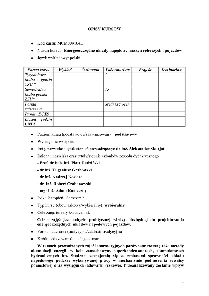 OPISY KURSÓW Kod kursu: MCM009104L Nazwa kursu: Energooszczędne układy napędowe maszyn roboczych i pojazdów Język wykładowy: polski Forma kursu Tygodniowa liczba godzin ZZU * Semestralna liczba godzin ZZU* Forma zaliczenia Punkty ECTS Liczba godzin CNPS Wykład Ćwiczenia Laboratorium 1 Projekt Seminarium 15 Średnia z ocen Poziom kursu (podstawowy/zaawansowany): podstawowy Wymagania wstępne: Imię, nazwisko i tytuł/ stopień prowadzącego: dr inż. Aleksander Skurjat Imiona i nazwiska oraz tytuły/stopnie członków zespołu dydaktycznego: - Prof. dr hab. inż. Piotr Dudziński - dr inż. Eugeniusz Grabowski - dr inż. Andrzej Kosiara - dr inż. Robert Czabanowski - mgr inż. Adam Konieczny Rok: 2 stopień Semestr: 2 Typ kursu (obowiązkowy/wybieralny): wybieralny Cele zajęć (efekty kształcenia): Celem zajęć jest nabycie praktycznej wiedzy niezbędnej do projektowania energooszczędnych układów napędowych pojazdów. Forma nauczania (tradycyjna/zdalna): tradycyjna Krótki opis zawartości całego kursu: W ramach prowadzonych zajęć laboratoryjnych porównane zostaną róże metody akumulacji energii: w kole zamachowym, superkondensatorach, akumulatorach hydraulicznych itp. Studenci zaznajomią się ze zmianami sprawności układu napędowego podczas wykonywanej pracy w mechanizmie podnoszenia suwnicy pomostowej oraz wysięgnika ładowarki łyżkowej. Przeanalizowany zostanie wpływ 1 różnych czynników na sprawność układu silnik spalinowy-prądnica oraz określone zostanie zużycie paliwa w funkcji generowanej energii. Wykład (podać z dokładnością do 2 godzin): Ćwiczenia - zawartość tematyczna: Seminarium - zawartość tematyczna: Laboratorium - zawartość tematyczna: L1 – Badania sprawności układu napędowego wciągarki suwnicy pomostowej, L2 – Akumulacja i rekuperacja energii w bezwładnościowych układach napędowych, L3 – Energooszczędność procesu napełniania łyżki pojazdu przemysłowego, L4 – Akumulacja i rekuperacja energii w elektrycznych i mechano-elektrycznych układach napędowych, L5 – Badanie możliwości akumulacji energii w hydrostatycznym układzie napędowym wysięgnika ładowarki łyżkowej, L6 – Badania sprawności przetwarzania energii generatora prądotwórczego, L7 – Badanie energooszczędnego hydrostatycznego układu napędowego. Projekt - zawartość tematyczna: Literatura podstawowa: 1. „Propulsion Systems for Hybrid Vehicles”, John Miller, IEE Power and Energy Series 45, 2004 2. “Odnawialne źródła energii i pojazdy proekologiczne”, Grażyna Jastrzębska, WNT, 2009 3. „Akumulacja energii w pojazdach”, Antoni Szymanowski, WKŁ, 1984 4. „Alternatywne napędy pojazdów”, Jerzy Merkisz, Wydawnictwo Politechniki Poznańskiej, 2006 5. „Modern Electric Vehicle Tehnology”, C. Chan, Oxford Universtity Press, 2001 6. “Electric vehicle technology explained”, James Larminie, West Sussex, England ; Hoboken, N.J. : J. Wiley, cop. 2003 7. „Maszyny elektryczne pojazdów samochodowych”, Eugeniusz Koziej, WNT, 1984 Literatura uzupełniająca: 1. „Alternative Fuels Guidebook - Properties, Storage, Dispensing, and Vehicle Facility Modifications”, Richard Bechtold, Society of Automotive Engineers, cop., 1997 Warunki zaliczenia: Pozytywna ocena na kolokwium 2 * - w zależności od systemu studiów 3