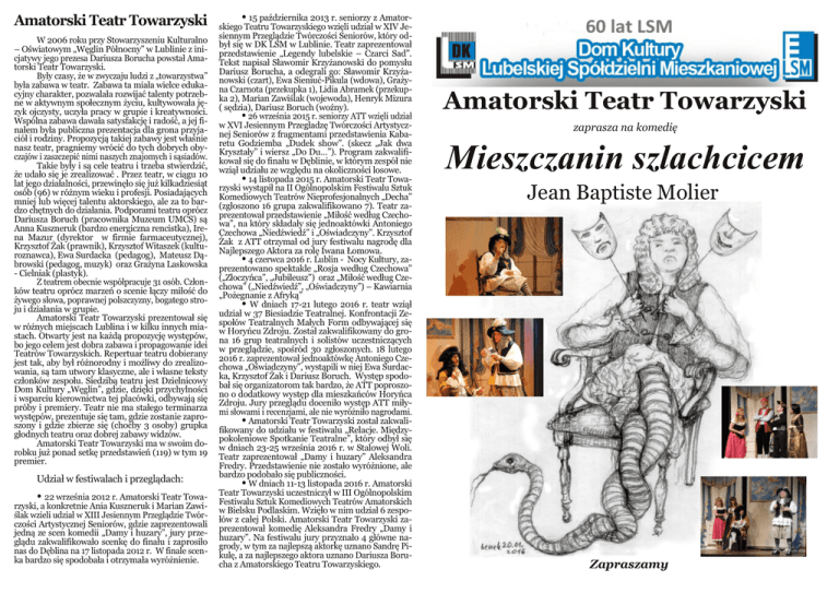 Amatorski Teatr Towarzyski W 2006 roku przy Stowarzyszeniu Kulturalno – Oświatowym „Węglin Północny” w Lublinie z ini cjatywy jego prezesa Dariusza Borucha powstał Ama torski Teatr Towarzyski. Były czasy, że w zwyczaju ludzi z „towarzystwa” była zabawa w teatr. Zabawa ta miała wielce eduka cyjny charakter, pozwalała rozwijać talenty potrzeb ne w aktywnym społecznym życiu, kultywowała ję zyk ojczysty, uczyła pracy w grupie i kreatywności. Wspólna zabawa dawała satysfakcję i radość, a jej fi nałem była publiczna prezentacja dla grona przyja ciół i rodziny. Propozycją takiej zabawy jest właśnie nasz teatr, pragniemy wrócić do tych dobrych oby czajów i zaszczepić nimi naszych znajomych i sąsiadów. Takie były i są cele teatru i trzeba stwierdzić, że udało się je zrealizować . Przez teatr, w ciągu 10 lat jego działalności, przewinęło się już kilkadziesiąt osób (96) w różnym wieku i profesji. Posiadających mniej lub więcej talentu aktorskiego, ale za to bar dzo chętnych do działania. Podporami teatru oprócz Dariusza Boruch (pracownika Muzeum UMCS) są Anna Kuszneruk (bardzo energiczna rencistka), Ire na Mazur (dyrektor w firmie farmaceutycznej), Krzysztof Żak (prawnik), Krzysztof Witaszek (kultu roznawca), Ewa Surdacka (pedagog), Mateusz Dą browski (pedagog, muzyk) oraz Grażyna Laskowska Cielniak (plastyk). Z teatrem obecnie współpracuje 31 osób. Człon ków teatru oprócz marzeń o scenie łączy miłość do żywego słowa, poprawnej polszczyzny, bogatego stro ju i działania w grupie. Amatorski Teatr Towarzyski prezentował się w różnych miejscach Lublina i w kilku innych mia stach. Otwarty jest na każdą propozycję występów, bo jego celem jest dobra zabawa i propagowanie idei Teatrów Towarzyskich. Repertuar teatru dobierany jest tak, aby był różnorodny i możliwy do zrealizo wania, są tam utwory klasyczne, ale i własne teksty członków zespołu. Siedzibą teatru jest Dzielnicowy Dom Kultury „Węglin”, gdzie, dzięki przychylności i wsparciu kierownictwa tej placówki, odbywają się próby i premiery. Teatr nie ma stałego terminarza występów, prezentuje się tam, gdzie zostanie zapro szony i gdzie zbierze się (choćby 3 osoby) grupka głodnych teatru oraz dobrej zabawy widzów. Amatorski Teatr Towarzyski ma w swoim do robku już ponad setkę przedstawień (119) w tym 19 premier. Udział w festiwalach i przeglądach: • 22 września 2012 r. Amatorski Teatr Towa rzyski, a konkretnie Ania Kuszneruk i Marian Zawi ślak wzieli udział w XIII Jesiennym Przeglądzie Twór czości Artystycznej Seniorów, gdzie zaprezentowali jedną ze scen komedii „Damy i huzary”, jury prze glądu zakwalifikowało scenkę do finału i zaprosiło nas do Dęblina na 17 listopada 2012 r. W finale scen ka bardzo się spodobała i otrzymała wyróżnienie. • 15 października 2013 r. seniorzy z Amator skiego Teatru Towarzyskiego wzięli udział w XIV Je siennym Przeglądzie Twórczości Seniorów, który od był się w DK LSM w Lublinie. Teatr zaprezentował przedstawienie „Legendy lubelskie – Czarci Sad”. Tekst napisał Sławomir Krzyżanowski do pomysłu Dariusz Borucha, a odegrali go: Sławomir Krzyża nowski (czart), Ewa SieniućPikula (wdowa), Graży na Czarnota (przekupka 1), Lidia Abramek (przekup ka 2), Marian Zawiślak (wojewoda), Henryk Mizura ( sędzia), Dariusz Boruch (woźny). • 26 września 2015 r. seniorzy ATT wzięli udział w XVI Jesiennym Przegładzę Twórczości Artystycz nej Seniorów z fragmentami przedstawienia Kaba retu Godziemba „Dudek show”. (skecz „Jak dwa Kryształy” i wiersz „Do Du…”). Program zakwalifi kował się do finału w Dęblinie, w którym zespół nie wziął udziału ze względu na okoliczności losowe. • 14 listopada 2015 r. Amatorski Teatr Towa rzyski wystąpił na II Ogólnopolskim Festiwalu Sztuk Komediowych Teatrów Nieprofesjonalnych „Decha” (zgłoszono 16 grupa zakwalifikowano 7). Teatr za prezentował przedstawienie „Miłość według Czecho wa”, na który składały się jednoaktówki Antoniego Czechowa „Niedźwiedź” i „Oświadczyny”. Krzysztof Żak z ATT otrzymał od jury festiwalu nagrodę dla Najlepszego Aktora za rolę Iwana Łomowa. • 4 czerwca 2016 r. Lublin Nocy Kultury, za prezentowano spektakle „Rosja według Czechowa” („Złoczyńca”, „Jubileusz”) oraz „Miłość według Cze chowa” („Niedźwiedź”, „Oświadczyny”) – Kawiarnia „Pożegnanie z Afryką” • W dniach 1721 lutego 2016 r. teatr wziął udział w 37 Biesiadzie Teatralnej. Konfrontacji Ze społów Teatralnych Małych Form odbywającej się w Horyńcu Zdroju. Został zakwalifikowany do gro na 16 grup teatralnych i solistów uczestniczących w przeglądzie, spośród 30 zgłoszonych. 18 lutego 2016 r. zaprezentował jednoaktówkę Antoniego Cze chowa „Oświadczyny”, wystąpili w niej Ewa Surdac ka, Krzysztof Żak i Dariusz Boruch. Występ spodo bał się organizatorom tak bardzo, że ATT poproszo no o dodatkowy występ dla mieszkańców Horyńca Zdroju. Jury przeglądu doceniło występ ATT miły mi słowami i recenzjami, ale nie wyróżniło nagrodami. • Amatorski Teatr Towarzyski został zakwali fikowany do udziału w festiwalu „Relacje. Między pokoleniowe Spotkanie Teatralne”, który odbył się w dniach 2325 września 2016 r. w Stalowej Woli. Teatr zaprezentował „Damy i huzary” Aleksandra Fredry. Przedstawienie nie zostało wyróżnione, ale bardzo podobało się publiczności. • W dniach 1113 listopada 2016 r. Amatorski Teatr Towarzyski uczestniczył w III Ogólnopolskim Festiwalu Sztuk Komediowych Teatrów Amatorskich w Bielsku Podlaskim. Wzięło w nim udział 6 zespo łów z całej Polski. Amatorski Teatr Towarzyski za prezentował komedię Aleksandra Fredry „Damy i huzary”. Na festiwalu jury przyznało 4 główne na grody, w tym za najlepszą aktorkę uznano Sandrę Pi kulę, a za najlepszego aktora uzna