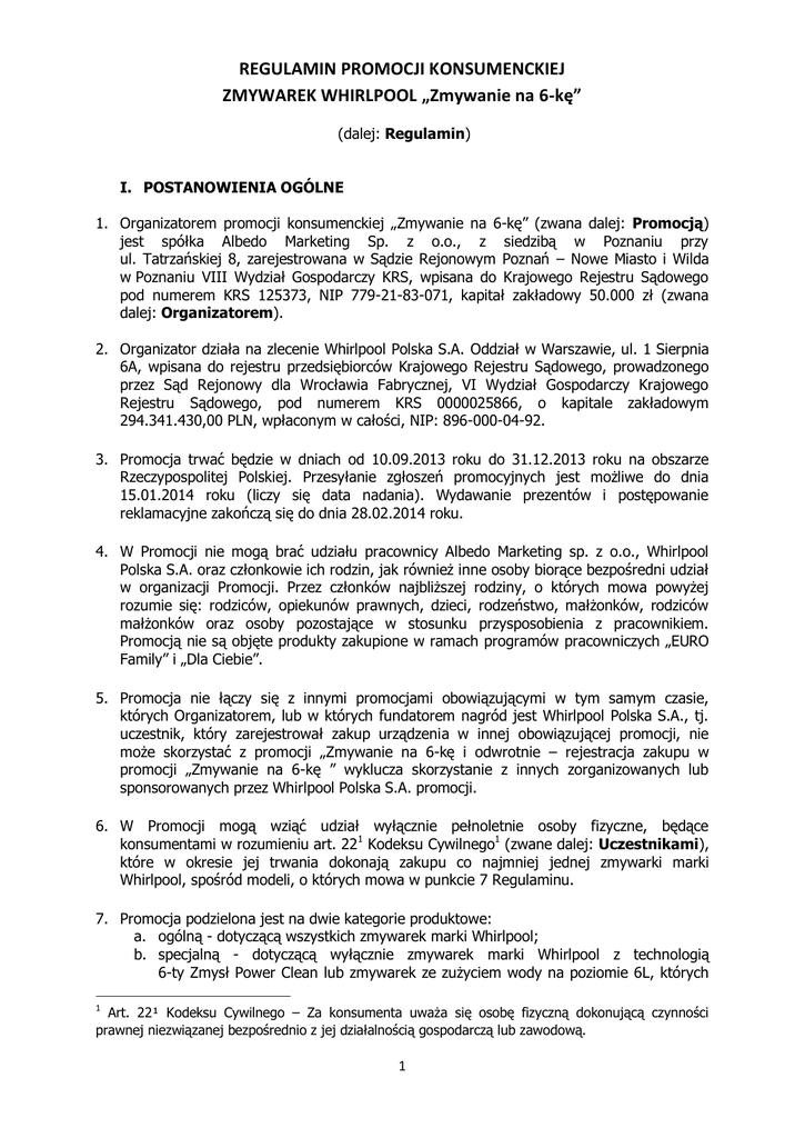 REGULAMIN PROMOCJI KONSUMENCKIEJ ZMYWAREK WHIRLPOOL „Zmywanie na 6-kę” (dalej: Regulamin) I. POSTANOWIENIA OGÓLNE 1. Organizatorem promocji konsumenckiej „Zmywanie na 6-kę” (zwana dalej: Promocją) jest spółka Albedo Marketing Sp. z o.o., z siedzibą w Poznaniu przy ul. Tatrzańskiej 8, zarejestrowana w Sądzie Rejonowym Poznań – Nowe Miasto i Wilda w Poznaniu VIII Wydział Gospodarczy KRS, wpisana do Krajowego Rejestru Sądowego pod numerem KRS 125373, NIP 779-21-83-071, kapitał zakładowy 50.000 zł (zwana dalej: Organizatorem). 2. Organizator działa na zlecenie Whirlpool Polska S.A. Oddział w Warszawie, ul. 1 Sierpnia 6A, wpisana do rejestru przedsiębiorców Krajowego Rejestru Sądowego, prowadzonego przez Sąd Rejonowy dla Wrocławia Fabrycznej, VI Wydział Gospodarczy Krajowego Rejestru Sądowego, pod numerem KRS 0000025866, o kapitale zakładowym 294.341.430,00 PLN, wpłaconym w całości, NIP: 896-000-04-92. 3. Promocja trwać będzie w dniach od 10.09.2013 roku do 31.12.2013 roku na obszarze Rzeczypospolitej Polskiej. Przesyłanie zgłoszeń promocyjnych jest możliwe do dnia 15.01.2014 roku (liczy się data nadania). Wydawanie prezentów i postępowanie reklamacyjne zakończą się do dnia 28.02.2014 roku. 4. W Promocji nie mogą brać udziału pracownicy Albedo Marketing sp. z o.o., Whirlpool Polska S.A. oraz członkowie ich rodzin, jak również inne osoby biorące bezpośredni udział w organizacji Promocji. Przez członków najbliższej rodziny, o których mowa powyżej rozumie się: rodziców, opiekunów prawnych, dzieci, rodzeństwo, małżonków, rodziców małżonków oraz osoby pozostające w stosunku przysposobienia z pracownikiem. Promocją nie są objęte produkty zakupione w ramach programów pracowniczych „EURO Family” i „Dla Ciebie”. 5. Promocja nie łączy się z innymi promocjami obowiązującymi w tym samym czasie, których Organizatorem, lub w których fundatorem nagród jest Whirlpool Polska S.A., tj. uczestnik, który zarejestrował zakup urządzenia w innej obowiązującej promocji, nie może skorzystać z promocji „Zmywanie na 6-kę i odwrotnie – rejestracja zakupu w promocji „Zmywanie na 6-kę ” wyklucza skorzystanie z innych zorganizowanych lub sponsorowanych przez Whirlpool Polska S.A. promocji. 6. W Promocji mogą wziąć udział wyłącznie pełnoletnie osoby fizyczne, będące konsumentami w rozumieniu art. 221 Kodeksu Cywilnego1 (zwane dalej: Uczestnikami), które w okresie jej trwania dokonają zakupu co najmniej jednej zmywarki marki Whirlpool, spośród modeli, o których mowa w punkcie 7 Regulaminu. 7. Promocja podzielona jest na dwie kategorie produktowe: a. ogólną - dotyczącą wszystkich zmywarek marki Whirlpool; b. specjalną - dotyczącą wyłącznie zmywarek marki Whirlpool z technologią 6-ty Zmysł Power Clean lub zmywarek ze zużyciem wody na poziomie 6L, których 1 Art. 22¹ Kodeksu Cywilnego – Za konsumenta uważa się osobę fizyczną dokonującą czynności prawnej niezwiązanej bezpośrednio z jej działalnością gospodarczą lub zawodową. 1 modele zostały określone w Załączniku nr 1 do niniejszego Regulaminu (dalej łącznie: Wybrane Modele Zmywarek Whirlpool). II. ZASADY PROMOCJI 8. Promocja polega na możliwości uzyskania przez Uczestnika nabywającego w okresie Promocji fabrycznie nową zmywarkę wolnostojącą lub do zabudowy marki Whirlpool, nagrody rzeczowej w postaci tabletek do zmywarki Fairy Platinum. 9. Każdy Uczestnik, który zakupił dowolną fabrycznie nową zmywarkę Whirlpool ma możliwość otrzymania 3 opakowań tabletek do zmywarki Fairy Platinum. Uczestnik, który zakupił fabrycznie nowy Wybrany Model Zmywarki Whirlpool ma możliwość otrzymania 6 opakowań tabletek do zmywarki Fairy Platinum. Jedno opakowanie Fairy Platinum zawiera 30 tabletek do zmywarki. 10. Dowodem zakupu zmywarki Whirlpool akceptowanym przez Organizatora będzie paragon, potwierdzający datę dokonania zakupu, miejsce dokonania zakupu (obszar Polski) oraz model zakupionej zmywarki. W Promocji będą akceptowane faktury VAT wystawione osobom fizycznym, niebędącym przedsiębiorcami. 11. W celu otrzymania nagrody, o której mowa w pkt 9, nabywca obowiązany jest prawidłowo wypełnić kupon promocyjny będący częścią ulotki promocyjnej komunikującej niniejszą promocję, lub dostępny na stronie Promocji www.whirlpool-promocja.pl poprzez podanie następujących danych: a. imię i nazwisko b. adres zamieszkania c. e-mail (obowiązkowe) d. numer telefonu (nieobowiązkowe – dla ułatwienia kontaktu) e. model zakupionej zmywarki f. numer seryjny zmywarki g. data zakupu zmywarki Ponadto Uczestnik obowiązany jest wyrazić zgodę na przetwarzanie jego danych osobowych na potrzeby realizacji niniejszej Promocji oraz zgodę na przesyłanie na podany przez Uczestnika adres e-mail informacji handlowych i marketingowych dotyczących produktów Whirlpool Polska S.A. Podanie danych ma charakter dobrowolny, jednak jest konieczne dla rozpatrzenia zgłoszenia Uczestnika. 12. Prawidłowo wypełniony kupon promocyjny Uczestnik powinien przesłać wraz z kserokopią dowodu zakupu na adres: „Zmywanie na 6kę”, Albedo Marketing, ul. Tatrzańska 8, 60-413 Poznań lub on-line za pośrednictwem strony: www.whirlpoolpromocja.pl (załączając skan dowodu zakupu). 13. W razie wątpliwości, co do wiarygodności zgłoszenia i spełnienia przez Uczestnika wszystkich warunków udziału w Promocji, Organizator może zobowiązać Uczestnika do przesłania lub udostępnienia w inny sposób oryginału dowodu zakupu zmywarki Whirlpool. 14. Jeden Uczestnik może przesłać tylko jeden kupon promocyjny w trakcie trwania Promocji i uzyskać z tego tytułu tylko jeden prezent – określoną ilość opakowań tabletek do zmywarki Fairy Platinum. Dowód zakupu wykorzystany w zgłoszeniu przez jednego Uczestnika, nie podlega ponownemu zgłoszeniu przez inne osoby. 15. Tabletki do zmywarki Fairy Platinum zostaną wysłane