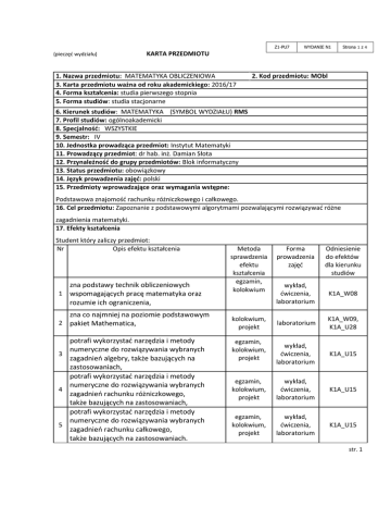 Z1-PU7 (pieczęć wydziału) WYDANIE N1 KARTA PRZEDMIOTU 1. Nazwa przedmiotu: MATEMATYKA OBLICZENIOWA 3. Karta przedmiotu ważna od roku akademickiego: 2016/17 4. Forma kształcenia: studia pierwszego stopnia 5. Forma studiów: studia stacjonarne Strona 1 z 4 2. Kod przedmiotu: MObl 6. Kierunek studiów: MATEMATYKA (SYMBOL WYDZIAŁU) RMS 7. Profil studiów: ogólnoakademicki 8. Specjalność: WSZYSTKIE 9. Semestr: IV 10. Jednostka prowadząca przedmiot: Instytut Matematyki 11. Prowadzący przedmiot: dr hab. inż. Damian Słota 12. Przynależność do grupy przedmiotów: Blok informatyczny 13. Status przedmiotu: obowiązkowy 14. Język prowadzenia zajęć: polski 15. Przedmioty wprowadzające oraz wymagania wstępne: Podstawowa znajomość rachunku różniczkowego i całkowego. 16. Cel przedmiotu: Zapoznanie z podstawowymi algorytmami pozwalającymi rozwiązywać różne zagadnienia matematyki. 17. Efekty kształcenia Student który zaliczy przedmiot: Nr Opis efektu kształcenia 1 zna podstawy technik obliczeniowych wspomagających pracę matematyka oraz rozumie ich ograniczenia, zna co najmniej na poziomie podstawowym 2 pakiet Mathematica, potrafi wykorzystać narzędzia i metody numeryczne do rozwiązywania wybranych 3 zagadnień algebry, także bazujących na zastosowaniach, potrafi wykorzystać narzędzia i metody numeryczne do rozwiązywania wybranych 4 zagadnień rachunku różniczkowego, także bazujących na zastosowaniach, potrafi wykorzystać narzędzia i metody numeryczne do rozwiązywania wybranych 5 zagadnień rachunku całkowego, także bazujących na zastosowaniach. Metoda sprawdzenia efektu kształcenia egzamin, kolokwium Forma prowadzenia zajęć Odniesienie do efektów dla kierunku studiów wykład, ćwiczenia, laboratorium K1A_W08 laboratorium K1A_W09, K1A_U28 wykład, ćwiczenia, laboratorium K1A_U15 egzamin, kolokwium, projekt wykład, ćwiczenia, laboratorium K1A_U15 egzamin, kolokwium, projekt wykład, ćwiczenia, laboratorium K1A_U15 kolokwium, projekt egzamin, kolokwium, projekt str. 1 18. Formy zajęć dydaktycznych i ich wymiar (liczba godzin) Wykład 30 Ćwiczenia 30 Laboratorium 30 Projekt Seminarium 19. Treści kształcenia: Podstawowe pojęcia metod numerycznych: zadanie numeryczne, algorytm. Analiza błędów: błąd bezwzględny i względny, przenoszenie się błędów. Przybliżone rozwiązywanie równań nieliniowych i ich układów: metoda bisekcji, metoda regula falsi, metoda siecznych, metoda Newtona, metoda iteracji prostej. Rozwiązywanie układów równań liniowych: eliminacja Gaussa, ogólna postać metod iteracyjnych i jako szczególne przypadki metoda Jacobiego i metoda Gaussa-Seidla. Interpolacja: sformułowanie zagadnienia, interpolacja za pomocą wielomianów algebraicznych, wzór interpolacyjny Lagrange'a, oszacowanie błędu interpolacji i zbieżność procesów interpolacyjnych. Interpolacja funkcjami sklejanymi (splajnami). Aproksymacja: sformułowanie zagadnienia, aproksymacja średniokwadratowa dyskretna i integralna. Całkowanie numeryczne: proste i złożone kwadratury Newtona-Cotesa. Metody rozwiązywanie zagadnień początkowych dla równań różniczkowych zwyczajnych: metoda Eulera, metody rzędu drugiego (Heuna, zmodyfikowana metoda Eulera), metody typu Rungego-Kutty. Na ćwiczeniach rozwiązywane będą zadania z matematyki obliczeniowej. Na laboratoriach studenci zapoznają się z pakietem matematycznym oraz implementują i testują poznane na wykładzie algorytmy. 20. Egzamin: tak 21. Literatura podstawowa: 1. D. Kincaid, W. Cheney, Analiza numeryczna, WNT, Warszawa 2006. 2. E. Majchrzak, B. Mochnacki, Metody numeryczne: podstawy teoretyczne, aspekty praktyczne i algorytmy, Wyd. Pol. Śl., Gliwice 2004. 3. H.Gliński, R.Grzymkowski, A.Kapusta, D.Słota, Mathematica 8, WPKJS, Gliwice 2012. 22. Literatura uzupełniająca: 1. Z. Fortuna, B. Macukow, J. Wąsowski, Metody numeryczne, WNT, Warszawa 2002. 2. J. Stoer, R. Bulirsch, Wstęp do analizy numerycznej, PWN, Warszawa 1987. 23. Nakład pracy studenta potrzebny do osiągnięcia efektów kształcenia Lp. 1 2 3 4 5 6 Forma zajęć Wykład Ćwiczenia Laboratorium Projekt Seminarium Inne: Suma godzin Liczba godzin kontaktowych / pracy studenta 30/30 30/60 30/60 / / / 90/150 24. Suma wszystkich godzin 25. Liczba punktów ECTS 240 8 str. 2 26. Liczba punktów ECTS uzyskanych na zajęciach z bezpośrednim udziałem nauczyciela akademickiego 27. Liczba punktów ECTS uzyskanych na zajęciach o charakterze 8 2 praktycznym (laboratoria, projekty) 28. Uwagi: Zasady przydziału punktów według schematu 30+30+40: ocena z ćwiczeń (max 30 punktów): o aktywność do 5 punktów, o kolokwium od 0 do 25 punktów, o za każdą nieusprawiedliwioną nieobecność (począwszy od drugiej), odejmuje się po 5 punktów; ocena z laboratorium (max 30 punktów): o dwa sprawdziany przy komputerze, każdy od 0 do 15 punktów, o za każdą nieusprawiedliwioną nieobecność (począwszy od drugiej), odejmuje się po 5 punktów, o projekty na laboratorium: każdy musi być zaliczony; egzamin od 0 do 40 punktów (na egzaminie należy uzyskać co najmniej 12 punktów). Do zaliczenia niezbędne jest osiągnięcie łącznie 41 pkt., w tym: co najmniej 30% punktów na egzaminie oraz zaliczenie wszystkich projektów w terminie do trzech tygodni od zajęć. Oceny będą wystawiane wg skali: 41 pkt. - 55 pkt. – dostateczny (3,0), 56 pkt. - 70 pkt. – plus dostateczny (3,5), 71 pkt. - 80 pkt. – dobry (4,0), 81 pkt. - 90 pkt. – plus dobry (4,5), 91 pkt. - 100 pkt. – bardzo dobry (5,0). Zatwierdzono: ……………………………. ………………………………………………… str. 3 (data i podpis prowadzącego) (data i podpis dyrektora instytutu/kierownika katedry/ Dyrektora Kolegium Języków Obcych/kierownika lub dyrektora jednostki międzywydziałowej) str. 4