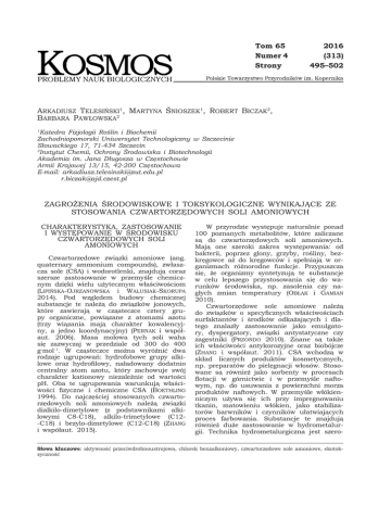 Tom 65 2016 Numer 4 (313) Strony495–502 Arkadiusz Telesiński1, Martyna Śnioszek1, Robert Biczak2, Barbara Pawłowska2 Katedra Fizjologii Roślin i Biochemii Zachodniopomorski Uniwersytet Technologiczny w Szczecinie Słowackiego 17, 71-434 Szczecin 2 Instytut Chemii, Ochrony Środowiska i Biotechnologii Akademia im. Jana Długosza w Częstochowie Armii Krajowej 13/15, 42-200 Częstochowa E-mail: [email protected] [email protected] 1 ZAGROŻENIA ŚRODOWISKOWE I TOKSYKOLOGICZNE WYNIKAJĄCE ZE STOSOWANIA CZWARTORZĘDOWYCH SOLI AMONIOWYCH CHARAKTERYSTYKA, ZASTOSOWANIE I WYSTĘPOWANIE W ŚRODOWISKU CZWARTORZĘDOWYCH SOLI AMONIOWYCH Czwartorzędowe związki amoniowe (ang. quaternary ammonium compounds), zwłaszcza sole (CSA) i wodorotlenki, znajdują coraz szersze zastosowanie w przemyśle chemicznym dzięki wielu użytecznym właściwościom (Lipińska-Ojrzanowska i Walusiak-Skorupa 2014). Pod względem budowy chemicznej substancje te należą do związków jonowych, które zawierają w cząsteczce cztery grupy organiczne, powiązane z atomami azotu (trzy wiązania mają charakter kowalencyjny, a jedno koordynacyjny) (Pernak i współaut. 2006). Masa molowa tych soli waha się zazwyczaj w przedziale od 300 do 400 g·mol-1. W cząsteczce można wyróżnić dwa rodzaje ugrupowań: hydrofobowe grupy alkilowe oraz hydrofilowy, naładowany dodatnio centralny atom azotu, który zachowuje swój charakter kationowy niezależnie od wartości pH. Oba te ugrupowania warunkują właściwości fizyczne i chemiczne CSA (Boethling 1994). Do najczęściej stosowanych czwartorzędowych soli amoniowych należą związki dialkilo-dimetylowe (z podstawnikami alkilowymi C8-C18), alkilo-trimetylowe (C12-C18) i bezylo-dimetylowe (C12-C18) (Zhang i współaut. 2015). W przyrodzie występuje naturalnie ponad 100 poznanych metabolitów, które zaliczane są do czwartorzędowych soli amoniowych. Mają one szeroki zakres występowania: od bakterii, poprzez glony, grzyby, rośliny, bezkręgowce aż do kręgowców i spełniają w organizmach różnorodne funkcje. Przypuszcza się, że organizmy syntetyzują te substancje w celu lepszego przystosowania się do warunków środowiska, np. zasolenia czy nagłych zmian temperatury (Obłąk i Gamian 2010). Czwartorzędowe sole amoniowe należą do związków o specyficznych właściwościach surfaktantów i środków odkażających i dlatego znalazły zastosowanie jako emulgatory, dyspergatory, związki antystatyczne czy zagęstniki (Przondo 2010). Znane są także ich właściwości antykorozyjne oraz biobójcze (Zhang i współaut. 2011). CSA wchodzą w skład licznych produktów kosmetycznych, np. preparatów do pielęgnacji włosów. Stosowane są również jako sorbenty w procesach flotacji w górnictwie i w przemyśle naftowym, np. do usuwania z powierzchni morza produktów naftowych. W przemyśle włókienniczym używa się ich przy impregnowaniu tkanin, matowieniu włókien, jako stabilizatorów barwników i czynników ułatwiających proces farbowania. Substancje te znajdują również duże zastosowanie w hydrometalurgii. Technika hydrometalurgiczna jest szero- Słowa kluczowe: aktywność przeciwdrobnoustrojowa, chlorek benzalkoniowy, czwartorzędowe sole amoniowe, ekotoksyczność 496 Arkadiusz Telesiński i współaut. ko stosowana w produkcji miedzi, kobaltu, niklu, wolframu, wanadu i uranu. Światowa produkcja uranu w 85% oparta jest na ekstrakcji za pomocą CSA (Grabińska-Sota 2004). Należy podkreślić, że w porównaniu z innymi surfaktantami, wykazują one odporność na wysokie pH, co także zwiększa ich możliwości aplikacyjne (Holmberg i współaut. 2003). Czwartorzędowe sole amoniowe znalazły również zastosowanie w medycynie. W anestezjologii używane są jako leki zwiotczające mięśnie szkieletowe. Ponadto, związki te ze względu na właściwości bakteriobójcze, stosowane są jako środki dezynfekcyjne (dezynfekcje przedoperacyjne nieuszkodzonej skóry czy błony śluzowej, narzędzi chirurgicznych, sal operacyjnych). Mają również zastosowanie w leczeniu takich chorób jak cukrzyca, arytmia serca, nerwice, alergie, a także wspomagają działanie leków przeciwnowotworowych. Czwartorzędowe sole amoniowe wykorzystane są w nanotechnologii, jako dodatek do nanowłókien stosowanych w inżynierii tkankowej, poprawiając ich biodegradowalność i porowatość; dzięki nim można uzyskać włókniny będące odpowiednikiem kolagenu, które umożliwiają wzrost i adhezje komórek. W związku z tym mogą mieć zastosowanie, jako opatrunki antybakteryjne stosowane bezpośrednio na tkanki (Obłąk i Gamian 2010). Według danych literaturowych roczna produkcja CSA przekracza milion ton, a zapotrzebowanie na nie stale wzrasta. Substancje te są zazwyczaj stosowane w bardzo niewielkich stężeniach, więc wielkość produkcji dowodzi ich ogromnego znaczenia gospodarczego (Grabińska-Sota 2004). Różnorodność zastosowania czwartorzędowych soli amoniowych powoduje duże możliwości przedostawania się ich do środowiska, bezpośrednio, bądź wraz ze ściekami bytowo-gospodarczymi, przemysłowymi lub wodami opadowymi. Ponadto, wraz ze wzrostem zapotrzebowania i wykorzystania ich zarówno w środowisku pracy, jak i poza nim pojawia się ryzyko ujawnienia ich negatywnego oddziaływania na organizm człowieka. Badania prowadzone przez Martinez-Carballo i współaut. (2007) wykazały w ściekach obecność dialkilo-dimetylowych oraz bezylo-dimetylowych CSA w stężeniach sięgających 170 μg·dm–3. Koncentracja alkilo-trimetylowych CSA była natomiast zdecydowanie niższa i wynosiła do 9,9 μg·dm–3. Podobne wyniki otrzymali Clara i współaut. (2007), którzy badając ścieki w dziewięciu austriackich oczyszczalniach stwierdzili w nich obecność wszystkich grup CSA. Kreuzinger i współaut. (2007) podają, że najwyższą zawartością czwartorzędowych soli amoniowych charakteryzują się ścieki z pralni oraz ze szpitali. Zawartość w 