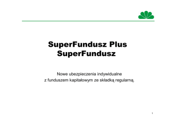 SuperFundusz Plus SuperFundusz Nowe ubezpieczenia indywidualne z funduszem kapitałowym ze składką regularną. 1 Jeden wybór , wiele możliwości 2 Dwa produkty SuperFundusz Składka minimalna 1800 PLN i załącznik na 20 lat SuperFundusz Plus Składka minimalna 6000 PLN i załącznika na 10 lat 3 Jakie fundusze są dostępne Fundusze z wyceną codzienną. Fundusze akcyjne 1. FIO Top 50 Małych i Średnich Spółek Plus 2. ARTS Best Momentum 3. ARTS Total Return Dynamic 4. HSBC BRIC Freestyle M2C 5. HSBC BRIC Markets Equite 6. Credit Suisse MultiFund Constellation Global 7. Credit Suisse MultiFund Equity Europe 8. Arka/Akcji 9. Europa Środkowa i Wschodnia WIOF 10.Skarbiec - Akcja Fundusz Inwestycyjny Otwarty Akcji 4 Jakie fundusze są dostępne Fundusze z wyceną codzienną Fundusze Bezpieczne 1. Bezpieczny Skarbiec Gotówkowy 2. Arka Stabilnego Wzrostu Fundusz Gwarantowany 1. Gwarantowany Compensa Fundusze Zrównoważone 1. ING Subfundusz Budownictwa i Nieruchomości Plus 2. ARTS Total Return Balanced 3. Credit Suisse MultiFund und Balanced Global 4. Credit Suisse MultiFund und Moderation 5. Arka Zrównoważony 6. Zrównoważony Skarbiec Waga 5 Ubezpieczający • Zawarł umowę i opłaca składki • Jeżeli Ubezpieczający i Ubezpieczony to różne osoby, Ubezpieczony nabywa prawa Ubezpieczającego gdy się na to zgodzi i: Na wniosek Ubezpieczającego W razie śmierci Ubezpieczającego - 6 Ubezpieczony • • Osoba, której życie i zdrowie jest przedmiotem ubezpieczenia. Wiek wstępu 1-55 lat 7 Uposażony • Osoba fizyczna, która jest wyznaczona przez Ubezpieczonego jako uprawniona do świadczenia. 8 Waluta polisy Waluta, w której w danej umowie ubezpieczenia wyrażona jest SU oraz opłaty i limity (PLN) Klient wpłaca składkę na wyznaczone konto w PLN ,a składkę jest inwestowana w odpowiedni fundusz ( waluta PLN, USD, Euro) 9 Rodzaje składek § Składka całkowita - Składka funduszowa – tytułem ubezpieczenia podstawowego Składka ochronna – tytułem ubezpieczeń dodatkowych § Składka dodatkowa - zakup j.u. 10 Odpowiedzialność Towarzystwa W razie śmierci Ubezpieczonego wypłacana jest suma: • • • Wartości j.u. zgromadzona na rachunku Gotówki na rachunku Suma Ubezpieczenia Po 65 roku życia Ubezpieczonego wypłata 10% SU z możliwością ustalenia SU na innym poziomie po akceptacji Towarzystwa. 11 Ochrona tymczasowa • • • • - Na drugi dzień po opłaceniu składki Nie dłużej niż 90 dni. Na wypadek śmierci NW Wypłata sumy: Wartość umorzonych j.u. zakupionych za składkę Wpłaconą składkę nie zamienioną na j.u. SU z wniosku do kwoty 100 000 PLN 12 Minimalna Suma Ubezpieczenia • • • Określa ją polisa Nie mniej niż 10% składki urocznionej w pierwszym roku trwania ubezpieczenia Nie mniej niż 5000PLN 13 Maksymalna Suma Ubezpieczenia Limity bez oświadczenia- max SU dla danego wieku i dla danej składki urocznionej. Przy SU i wzroście funduszu na poziomie 6,5% rocznie, indeksacji raz na 5 lat, polisa będzie trwać przynajmniej 30 lat. - Kobieta lat 30, składka 1800 PLN- max SU 197 565 PLN - Mężczyzna lat 30, składka 1800 PLN- max SU 70 210 PLN Limity z oświadczeniem - max SU dla danego wieku i dla danej składki urocznionej. Przy SU i wzroście funduszu na poziomie 6,5% rocznie, indeksacji raz na 5 lat, polisa będzie trwać przynajmniej 15 lat. - Kobieta lat 30, składka 1800 PLN- max SU 442 023 PLN - Mężczyzna lat 30, składka 1800 PLN- max SU 165 839 PLN 14 Zmiany SU i składki • • • Jest możliwa zmiana SU po 2 roku trwania umowy, ale nie mniej niż minimalna Zmiana składki na niższą za zgodą Towarzystwa. Podwyższenie SU powoduje ponowną ocenę ryzyka 15 Zasady opłacania składek • • • • Towarzystwo wskazuje odpowiedni rachunek bankowy Składka dodatkowa wpłacana jest na to samo konto z zaznaczeniem „składka dodatkowa”, wcześniej Towarzystwo musi być poinformowane przez klienta o chęci wpłaty dodatkowej Bez oznaczenia składka jest traktowana jako przedpłata na składkę regularną. Z przedpłaty opłacane będą w pierwszej kolejności składki ochronne a następnie funduszowe. 16 Zasady opłacania składek • W razie niezapłacenia składek w terminie wymaganym i dodatkowym: - Zamieniana jest na bezskładkową po opłaceniu składek za 2 lata - Ulega rozwiązaniu jeśli nie zapłacono wszystkich składek za pierwsze 2 lata okresu ubezpieczenia 17 Składki minimalne • SuperFundusz : składka funduszowa min 1 800 PLN rocznie z możliwością rat 1/2/4/12 • SuperFundusz Plus : składka funduszowa 6 000 PLN rocznie z możliwością rat 1/2/4/12 • Wpłata dodatkowa min 1 000 PLN. 18 Alokacja składek • - Składka funduszowa We wniosku o polisę. Jeżeli brak wskazania - 100% lokata w UFK Gwarantowany Compensa W trakcie trwania polisy możliwość zmiany alokacji • - Składka dodatkowa Zgodnie z alokacją składki funduszowej Ubezpieczający może każdorazowo zmienić alokację ważną dla najbliższej wpłaty • Ubezpieczony może złożyć pisemne oświadczenie o zmianie alokacji składki funduszowej 19 Zamiana składki na j.u. • Wg wyceny na koniec dnia, w którym dokonano zakupu j.u. • - Po prawidłowym zidentyfikowaniu wpłaty Jaka umowa Jaka wysokość Jaki rodzaj składki • Pierwsza składka powinna wpłynąć przed datą odpowiedzialności np. - Data odpowiedzialności 01.05.2007 - Data wpłynięcia składki 30.04.2007 • Jeśli składka wpłynęła po dniu wymagalności składki – najpóźniej czwartego dnia roboczego po dniu zapłaty składki 20 Konwersja jednostek • • Zlecenie operacji konwersji najpóźniej do 3 dnia roboczego po otrzymaniu przez Towarzystwo zlecenia Umorzenia i zakup jednostek w Funduszach odbywa się na koniec dnia wycen. 21 Opłaty • • • • • • • Za obsługę umowy 8 PLN miesięcznie. Za konwersję j.u. 10 PLN za każdą powyżej 4 w roku polisowym Za zmianę alokacji składki 10 PLN za każdą powyżej 4 w roku polisow