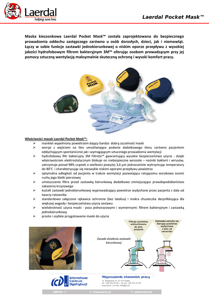 Laerdal Pocket Mask™ Maska kieszonkowa Laerdal Pocket Mask™ została zaprojektowana do bezpiecznego prowadzenia oddechu zastępczego zarówno u osób dorosłych, dzieci, jak i niemowląt. Łączy w sobie funkcje zastawki jednokierunkowej o niskim oporze przepływu z wysokiej jakości hydrofobowym filtrem bakteryjnym 3M™ oferując osobom prowadzącym przy jej pomocy sztuczną wentylację maksymalnie skuteczną ochronę i wysoki komfort pracy. Właściwości masek Laerdal Pocket Mask™: mankiet wypełniony powietrzem dający bardzo dobrą szczelność maski wersje z wejściem na tlen umożliwiające podanie dodatkowego tlenu zarówno pacjentom oddychającym spontanicznie jak i wymagającym sztucznego prowadzenia wentylacji hydrofobowy filtr bakteryjny 3M Filtrete™ gwarantujący wysokie bezpieczeństwo użycia - dzięki właściwościom elektrostatycznym blokuje on niebezpieczne aerozole – nośniki bakterii i wirusów, zatrzymuje ponad 98% cząstek o wielkości powyżej 3,6 µm jednocześnie wytrzymując temperatury do 80°C i charakteryzując się niezwykle niskimi oporami przepływu powietrza optymalna odległość od pacjenta w trakcie wentylacji pozwalająca ratującemu wzrokowo ocenić ruchy jego klatki piersiowej umieszczenie filtra przed zastawką kierunkową dodatkowo zmniejszające prawdopodobieństwo zakażenia krzyżowego kształt zastawki jednokierunkowej wyprowadzający powietrze wydychane przez pacjenta z dala od twarzy ratownika standardowo załączone rękawice ochronne (bez lateksu) i mokra chusteczka dezynfekująca dla większej wygody i bezpieczeństwa użycia zestawu wielokrotność użycia maski - poza jednorazowymi i wymiennymi: filtrem bakteryjnym i zastawką jednokierunkową proste i szybkie przygotowanie maski do użycia Zasada działania zastawki kierunkowej Dziecięca maska kieszonkowa Laerdal Paediatric Pocket Mask™ została zaprojektowana by sprostać odmiennym warunkom anatomicznym małych pacjentów podczas ich sztucznej wentylacji przy zachowaniu wysokiego bezpieczeństwa ratownika. Wykorzystując tę sama zastawkę jednokierunkową o niskim oporze przepływu co tradycyjna Laerdal Pocket Mask™ w kombinacji z miękką, przeźroczystą silikonową maską jest ona nieodzownym narzędziem dla wszystkich ratowników mających do czynienia z dziećmi i niemowlętami. Dostępne warianty masek Laerdal Pocket Mask: Maski standardowe dla dorosłych: 82 00 11 Laerdal Pocket Mask w/Gloves & Wipe in Yellow Hard Case – maska z rękawiczkami oraz chusteczką dezynfekującą w żółtym, twardym pudełku 82 00 40 Laerdal Pocket Mask w/Gloves & Wipe in Blue Soft Pack - maska z rękawiczkami oraz chusteczką dezynfekującą w niebiesko-żółtym etui z przypięciem do paska 82 00 41 Laerdal Pocket Mask w/Gloves & Wipe in Black Soft Pack - maska z rękawiczkami oraz chusteczką dezynfekującą w czarno-żółtym etui z przypięciem do paska 82 00 42 Laerdal Pocket Mask w/Gloves & Wipe in Camouflage Soft Pack - maska z rękawiczkami oraz chusteczką dezynfekującą w etui w kolorze wojskowym z przypięciem do paska Maski dla dorosłych z wejściem na tlen: 83 00 11 Laerdal Pocket Mask w/Oxygen Inlet & Head Strap w/Gloves & Wipe in Yellow Hard Case – maska z rękawiczkami oraz chusteczką dezynfekującą w żółtym, twardym pudełku 83 00 40 Laerdal Pocket Mask w/Oxygen Inlet & Head Strap w/Gloves & Wipe in Blue Soft Pack - maska z rękawiczkami oraz chusteczką dezynfekującą w niebiesko-żółtym etui z przypięciem do paska 83 00 41 Laerdal Pocket Mask w/Oxygen Inlet & Head Strap w/Gloves & Wipe in Black Soft Pack - maska z rękawiczkami oraz chusteczką dezynfekującą w czarno-żółtym etui z przypięciem do paska Maski pediatryczne: 82 00 50 Laerdal Paediatric Pocket Mask w/Gloves & Wipe in Blue/Yellow Soft Pack - maska z rękawiczkami oraz chusteczką dezynfekującą w niebiesko-żółtym etui z przypięciem do paska 82 00 51 Laerdal Paediatric Pocket Mask w/Gloves in Blue/Yellow Soft Pack - maska z rękawiczkami w niebiesko-żółtym etui z przypięciem do paska 82 00 52 Laerdal Paediatric Pocket Mask w/Gloves & Wipe in Blue/Yellow Soft Pack - maska z rękawiczkami w czerwono-czarnym etui z przypięciem do paska Maski kieszonkowe Laerdal Pocket Mask są również dostępne w wersji z własnym logo. Materiały zużywalne: 82 06 10 Filter - filtr bakteryjny 82 04 10 One-Way-Valve – zastawka jednokierunkowa 82 07 00 Update Pack - komplet: filtr bakteryjny i zastawka jednokierunkowa 83 01 10 Head Strap Adjustable - regulowany pasek do mocowania maski na głowie (10 szt.)