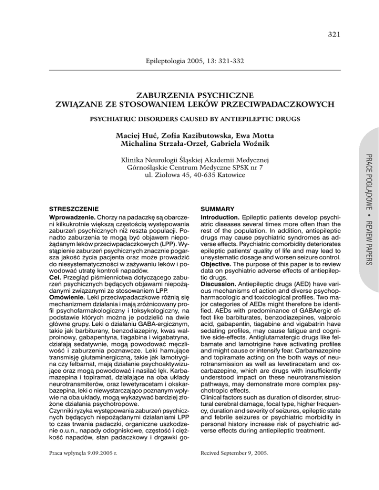 321 Epileptologia 2005, 13: 321-332 ZABURZENIA PSYCHICZNE ZWIĄZANE ZE STOSOWANIEM LEKÓW PRZECIWPADACZKOWYCH PSYCHIATRIC DISORDERS CAUSED BY ANTIEPILEPTIC DRUGS Maciej Huć, Zofia Kazibutowska, Ewa Motta Michalina Strzała-Orzeł, Gabriela Woźnik STRESZCZENIE SUMMARY Wprowadzenie. Chorzy na padaczkę są obarczeni kilkukrotnie większą częstością występowania zaburzeń psychicznych niż reszta populacji. Ponadto zaburzenia te mogą być objawem niepożądanym leków przeciwpadaczkowych (LPP). Wystąpienie zaburzeń psychicznych znacznie pogarsza jakość życia pacjenta oraz może prowadzić do niesystematyczności w zażywaniu leków i powodować utratę kontroli napadów. Cel. Przegląd piśmiennictwa dotyczącego zaburzeń psychicznych będących objawami niepożądanymi związanymi ze stosowaniem LPP. Omówienie. Leki przeciwpadaczkowe różnią się mechanizmem działania i mają zróżnicowany profil psychofarmakologiczny i toksykologiczny, na podstawie których można je podzielić na dwie główne grupy. Leki o działaniu GABA-ergicznym, takie jak barbiturany, benzodiazepiny, kwas walproinowy, gabapentyna, tiagabina i wigabatryna, działają sedatywnie, mogą powodować męczliwość i zaburzenia poznawcze. Leki hamujące transmisję glutaminergiczną, takie jak lamotrygina czy felbamat, mają działanie psychoaktywizujące oraz mogą powodować i nasilać lęk. Karbamazepina i topiramat, działające na oba układy neurotransmiterów, oraz lewetyracetam i okskarbazepina, leki o niewystarczająco poznanym wpływie na oba układy, mogą wykazywać bardziej złożone działania psychotropowe. Czynniki ryzyka występowania zaburzeń psychicznych będących niepożądanymi działaniami LPP to czas trwania padaczki, organiczne uszkodzenie o.u.n., napady odogniskowe, częstość i ciężkość napadów, stan padaczkowy i drgawki go- Introduction. Epileptic patients develop psychiatric diseases several times more often than the rest of the population. In addition, antiepileptic drugs may cause psychiatric syndromes as adverse effects. Psychiatric comorbidity deteriorates epileptic patients' quality of life and may lead to unsystematic dosage and worsen seizure control. Objective. The purpose of this paper is to review data on psychiatric adverse effects of antiepileptic drugs. Discussion. Antiepileptic drugs (AED) have various mechanisms of action and diverse psychopharmacologic and toxicological profiles. Two major categories of AEDs might therefore be identified. AEDs with predominance of GABAergic effect like barbiturates, benzodiazepines, valproic acid, gabapentin, tiagabine and vigabatrin have sedating profiles, may cause fatigue and cognitive side-effects. Antiglutamatergic drugs like felbamate and lamotrigine have activating profiles and might cause or intensify fear. Carbamazepine and topiramate acting on the both ways of neurotransmission as well as levetiracetam and oxcarbazepine, which are drugs with insufficiently understood impact on these neurotransmission pathways, may demonstrate more complex psychotropic effects. Clinical factors such as duration of disorder, structural cerebral damage, focal type, higher frequency, duration and severity of seizures, epileptic state and febrile seizures or psychiatric morbidity in personal history increase risk of psychiatric adverse effects during antiepileptic treatment. Praca wpłynęła 9.09.2005 r. Recived September 9, 2005. PRACE POGLĄDOWE • REVIEW PAPERS Klinika Neurologii Śląskiej Akademii Medycznej Górnośląskie Centrum Medyczne SPSK nr 7 ul. Ziołowa 45, 40-635 Katowice 322 Maciej Huć i wsp. PRACE POGLĄDOWE • REVIEW PAPERS rączkowe w wywiadzie oraz wcześniejsze występowanie zaburzeń psychicznych. Ciężkie psychiczne objawy niepożądane LPP zdarzają się u niewielkiego odsetka pacjentów, jednak te łagodne występują znacznie częściej. Uwzględnienie profilu psychofarmakologicznego przy doborze LPP może uchronić znaczną część pacjentów przed wystąpieniem niepożądanych objawów psychicznych. Serious psychiatric adverse events after antiepileptic drugs are rare but benign ones are quite common. Psychotropic profiles of antiepileptic drugs should be considered in the choice of drug for particular patient with epilepsy who is at risk for psychiatric adverse events to prevent their appearance. Key words: Epilepsy – Antiepileptic drugs – Psychiatric disorders – Adverse effects Słowa kluczowe: Padaczka – Leki przeciwpadaczkowe – Zaburzenia psychiczne – Objawy niepożądane WPROWADZENIE W piśmiennictwie epileptologicznym z okresu przed wprowadzeniem do leczenia leków przeciwpadaczkowych zaburzenia psychiczne ujmowano jako składowe zespołów padaczkowych. Sommer w 1881 r. opisywał padaczkę jako postępującą chorobę, której naturalny przebieg obejmował napady padaczkowe z następowym stanem pomrocznym, do których z czasem dołączały się zaburzenia zachowania, osobowości i otępienie. Ostatecznie chory umierał w przebiegu stanu padaczkowego uogólnionych napadów toniczno-klonicznych (Schmitz, 1999). Wprowadzenie leków przeciwpadaczkowych poprawiło rokowanie psychiatryczne pacjentów z padaczką, jednakże w dalszym ciągu są oni obarczeni dużo większym ryzykiem wystąpienia zaburzeń psychicznych i u wielu chorych dochodzi do pojawienia się różnego typu objawów psychopatologicznych (Rajna i wsp., 1996, 2005). Rozpowszechnienie depresji u chorych na padaczkę ocenia się na 11-60%, zaburzenia psychotyczne występują z częstością 2-8%, zaburzenia lękowe z częstością 19-45%, a zaburzenia koncentracji, włączając w to zespół ADHD dorosłych, u 25-30% pacjentów (Kanner, 2003; Rajna i wsp., 2005). Na szczególną uwagę zasługują zaburzenia psychiczne będące objawami niepożądanymi stosowania leków przeciwpadaczkowych. Z jednej strony lek przeciwpadaczkowy może być czynnikiem ryzyka wystąpienia zaburzeń psychicznych, a z drugiej wystąpienie za