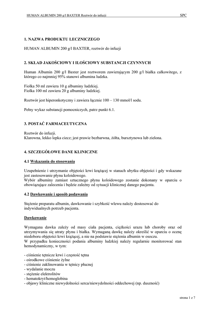 HUMAN ALBUMIN 200 g/l BAXTER Roztwór do infuzji SPC 1. NAZWA PRODUKTU LECZNICZEGO HUMAN ALBUMIN 200 g/l BAXTER, roztwór do infuzji 2. SKŁAD JAKOŚCIOWY I ILOŚCIOWY SUBSTANCJI CZYNNYCH Human Albumin 200 g/l Baxter jest roztworem zawierającym 200 g/l białka całkowitego, z którego co najmniej 95% stanowi albumina ludzka. Fiolka 50 ml zawiera 10 g albuminy ludzkiej. Fiolka 100 ml zawiera 20 g albuminy ludzkiej. Roztwór jest hiperonkotyczny i zawiera łącznie 100 – 130 mmol/l sodu. Pełny wykaz substancji pomocniczych, patrz punkt 6.1. 3. POSTAĆ FARMACEUTYCZNA Roztwór do infuzji. Klarowna, lekko lepka ciecz; jest prawie bezbarwna, żółta, bursztynowa lub zielona. 4. SZCZEGÓŁOWE DANE KLINICZNE 4.1 Wskazania do stosowania Uzupełnienie i utrzymanie objętości krwi krążącej w stanach ubytku objętości i gdy wskazane jest zastosowanie płynu koloidowego. Wybór albuminy zamiast sztucznego płynu koloidowego zostanie dokonany w oparciu o obowiązujące zalecenia i będzie zależny od sytuacji klinicznej danego pacjenta. 4.2 Dawkowanie i sposób podawania Stężenie preparatu albumin, dawkowanie i szybkość wlewu należy dostosować do indywidualnych potrzeb pacjenta. Dawkowanie Wymagana dawka zależy od masy ciała pacjenta, ciężkości urazu lub choroby oraz od utrzymywania się utraty płynu i białka. Wymaganą dawkę należy określić w oparciu o ocenę niedoboru objętości krwi krążącej, a nie na podstawie stężenia albumin w osoczu. W przypadku konieczności podania albuminy ludzkiej należy regularnie monitorować stan hemodynamiczny, w tym: - ciśnienie tętnicze krwi i częstość tętna - ośrodkowe ciśnienie żylne - ciśnienie zaklinowania w tętnicy płucnej - wydalanie moczu - stężenie elektrolitów - hematokryt/hemoglobina - objawy kliniczne niewydolności serca/niewydolności oddechowej (np. duszność) strona 1 z 7 HUMAN ALBUMIN 200 g/l BAXTER Roztwór do infuzji SPC - objawy kliniczne wzrostu ciśnienia śródczaszkowego (np. ból głowy) Sposób podawania HUMAN ALBUMIN 200 g/l BAXTER może być podawana bezpośrednio dożylnie lub może być rozcieńczona w roztworze izotonicznym (np. 5% glukoza lub 0,9% chlorek sodu). Szybkość infuzji należy dostosować do indywidualnej sytuacji i wskazań. Podczas wymiany osocza szybkość infuzji należy dostosować do szybkości usuwania. 4.3 Przeciwwskazania Nadwrażliwość na preparaty albumin lub na którąkolwiek substancję pomocniczą. 4.4 Specjalne ostrzeżenia i specjalne środki ostrożności dotyczące stosowania W przypadku podejrzenia reakcji alergicznej lub typu anafilaktycznego należy natychmiast przerwać infuzję. W przypadku wstrząsu należy zastosować standardowe zasady leczenia wstrząsu. Należy zachować ostrożność podczas podawania albumin, jeśli wystąpienie hiperwolemii i jej następstw lub hemodylucji mogłoby stwarzać szczególne ryzyko dla pacjenta. Przykładowo są to takie stany jak: - Niewyrównana niewydolność serca Nadciśnienie Żylaki przełyku Obrzęk płuc Skaza krwotoczna Ciężka niedokrwistość Bezmocz o etiologii nerkowej i pozanerkowej Efekt koloido-osmotyczny albuminy ludzkiej w stężeniu 200 g/l jest około czterokrotnie większy niż osocza krwi. Z tego względu podczas podawania koncentratu albumin należy zadbać o zapewnienie właściwego nawodnienia pacjenta. Należy ściśle monitorować pacjentów, aby zabezpieczyć ich przed przeciążeniem układu krążenia i przewodnieniem. Roztwory albuminy ludzkiej o stężeniu 200-250 g/l zawierają względnie mało elektrolitów w porównaniu do roztworów albuminy ludzkiej o stężeniu 40-50 g/l. Podczas podawania albuminy należy monitorować stężenie elektrolitów pacjenta (patrz punkt 4.2) i podjąć odpowiednie działania w celu przywrócenia lub utrzymania równowagi elektrolitowej. Nie wolno rozcieńczać roztworów albumin wodą do wstrzykiwań, ponieważ może to spowodować wystąpienie hemolizy u osób otrzymujących lek. W przypadku uzupełniania dużych niedoborów objętości należy koniecznie skontrolować parametry krzepnięcia i hematokryt. Należy zadbać o zapewnienie właściwej substytucji innych składników krwi (czynniki krzepnięcia, elektrolity, płytki krwi oraz erytrocyty). Jeśli dawka i szybkość infuzji nie zostały dostosowane do stanu układu krążenia pacjenta może wystąpić przewodnienie. W przypadku wystąpienia pierwszych oznak klinicznych przeciążenia układu krążenia (ból głowy, duszność, przepełnienie żył szyjnych) lub wzrostu ciśnienia krwi, strona 2 z 7 HUMAN ALBUMIN 200 g/l BAXTER Roztwór do infuzji SPC zwiększenia ośrodkowego ciśnienia żylnego lub obrzęku płuc, należy natychmiast przerwać wlew. Standardowe środki zapobiegania zakażeniom związanym z zastosowaniem produktów leczniczych otrzymywanych z ludzkiej krwi lub osocza obejmują selekcję dawców, badania przesiewowe poszczególnych donacji i całych pul osocza w kierunku swoistych markerów zakażenia i włączenie do procesu produkcji etapów skutecznej inaktywacji/usuwania wirusów. Pomimo tego, nie można całkowicie wykluczyć możliwości przeniesienia czynników zakaźnych podczas podawania produktów leczniczych otrzymanych z ludzkiej krwi lub osocza. Dotyczy to także wirusów nieznanych i nowo odkrytych oraz innych patogenów. Nie istnieją potwierdzone doniesienia na temat przeniesienia wirusów z preparatem albumin wyprodukowanym przy użyciu zatwierdzonego procesu, zgodnie ze specyfikacjami podanymi w Farmakopei Europejskiej. Zdecydowanie zaleca się zapisanie nazwy i numeru serii produktu przy każdorazowym podaniu pacjentowi HUMAN ALBUMIN 200 g/l BAXTER, aby zachować powiązanie pacjenta z daną serią produktu. 4.5 Interakcje z innymi lekami i inne rodzaje interakcji Nie są znane żadne specyficzne interakcje albuminy ludzkiej z innymi produktami leczniczymi. 4.6 Ciąża i laktacja Bezpieczeństwo stosowania HUMAN ALBUMIN 200 g/l BAXTER u kobiet w ciąży