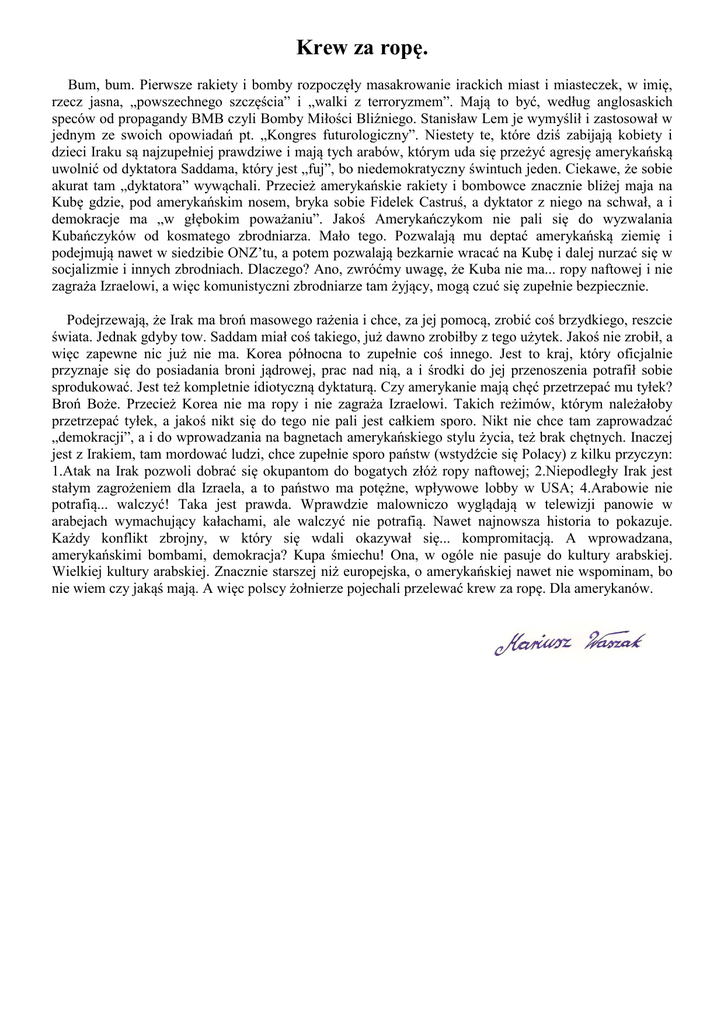 Krew za ropę. Bum, bum. Pierwsze rakiety i bomby rozpoczęły masakrowanie irackich miast i miasteczek, w imię, rzecz jasna, „powszechnego szczęścia” i „walki z terroryzmem”. Mają to być, według anglosaskich speców od propagandy BMB czyli Bomby Miłości Bliźniego. Stanisław Lem je wymyślił i zastosował w jednym ze swoich opowiadań pt. „Kongres futurologiczny”. Niestety te, które dziś zabijają kobiety i dzieci Iraku są najzupełniej prawdziwe i mają tych arabów, którym uda się przeżyć agresję amerykańską uwolnić od dyktatora Saddama, który jest „fuj”, bo niedemokratyczny świntuch jeden. Ciekawe, że sobie akurat tam „dyktatora” wywąchali. Przecież amerykańskie rakiety i bombowce znacznie bliżej maja na Kubę gdzie, pod amerykańskim nosem, bryka sobie Fidelek Castruś, a dyktator z niego na schwał, a i demokracje ma „w głębokim poważaniu”. Jakoś Amerykańczykom nie pali się do wyzwalania Kubańczyków od kosmatego zbrodniarza. Mało tego. Pozwalają mu deptać amerykańską ziemię i podejmują nawet w siedzibie ONZ’tu, a potem pozwalają bezkarnie wracać na Kubę i dalej nurzać się w socjalizmie i innych zbrodniach. Dlaczego? Ano, zwróćmy uwagę, że Kuba nie ma... ropy naftowej i nie zagraża Izraelowi, a więc komunistyczni zbrodniarze tam żyjący, mogą czuć się zupełnie bezpiecznie. Podejrzewają, że Irak ma broń masowego rażenia i chce, za jej pomocą, zrobić coś brzydkiego, reszcie świata. Jednak gdyby tow. Saddam miał coś takiego, już dawno zrobiłby z tego użytek. Jakoś nie zrobił, a więc zapewne nic już nie ma. Korea północna to zupełnie coś innego. Jest to kraj, który oficjalnie przyznaje się do posiadania broni jądrowej, prac nad nią, a i środki do jej przenoszenia potrafił sobie sprodukować. Jest też kompletnie idiotyczną dyktaturą. Czy amerykanie mają chęć przetrzepać mu tyłek? Broń Boże. Przecież Korea nie ma ropy i nie zagraża Izraelowi. Takich reżimów, którym należałoby przetrzepać tyłek, a jakoś nikt się do tego nie pali jest całkiem sporo. Nikt nie chce tam zaprowadzać „demokracji”, a i do wprowadzania na bagnetach amerykańskiego stylu życia, też brak chętnych. Inaczej jest z Irakiem, tam mordować ludzi, chce zupełnie sporo państw (wstydźcie się Polacy) z kilku przyczyn: 1.Atak na Irak pozwoli dobrać się okupantom do bogatych złóż ropy naftowej; 2.Niepodległy Irak jest stałym zagrożeniem dla Izraela, a to państwo ma potężne, wpływowe lobby w USA; 4.Arabowie nie potrafią... walczyć! Taka jest prawda. Wprawdzie malowniczo wyglądają w telewizji panowie w arabejach wymachujący kałachami, ale walczyć nie potrafią. Nawet najnowsza historia to pokazuje. Każdy konflikt zbrojny, w który się wdali okazywał się... kompromitacją. A wprowadzana, amerykańskimi bombami, demokracja? Kupa śmiechu! Ona, w ogóle nie pasuje do kultury arabskiej. Wielkiej kultury arabskiej. Znacznie starszej niż europejska, o amerykańskiej nawet nie wspominam, bo nie wiem czy jakąś mają. A więc polscy żołnierze pojechali przelewać krew za ropę. Dla amerykanów.