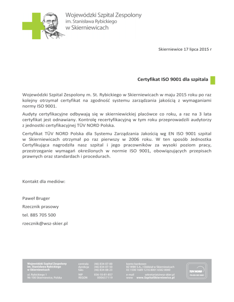Skierniewice 17 lipca 2015 r Certyfikat ISO 9001 dla szpitala Wojewódzki Szpital Zespolony m. St. Rybickiego w Skierniewicach w maju 2015 roku po raz kolejny otrzymał certyfikat na zgodność systemu zarządzania jakością z wymaganiami normy ISO 9001. Audyty certyfikacyjne odbywają się w skierniewickiej placówce co roku, a raz na 3 lata certyfikat jest odnawiany. Kontrolę recertyfikacyjną w tym roku przeprowadzili audytorzy z jednostki certyfikacyjnej TÜV NORD Polska. Certyfikat TÜV NORD Polska dla Systemu Zarządzania Jakością wg EN ISO 9001 szpital w Skierniewicach otrzymał po raz pierwszy w 2006 roku. W ten sposób Jednostka Certyfikująca nagrodziła nasz szpital i jego pracowników za wysoki poziom pracy, przestrzeganie wymagań określonych w normie ISO 9001, obowiązujących przepisach prawnych oraz standardach i procedurach. Kontakt dla mediów: Paweł Bruger Rzecznik prasowy tel. 885 705 500 [email protected]