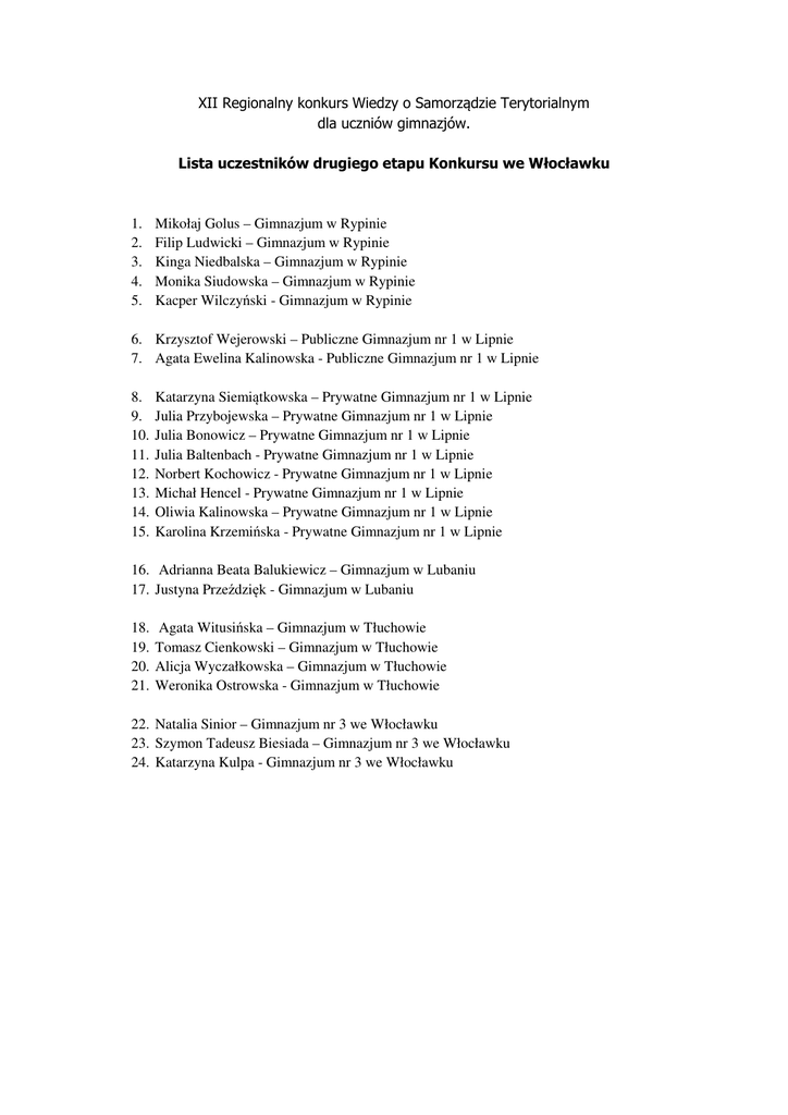 XII Regionalny konkurs Wiedzy o Samorządzie Terytorialnym dla uczniów gimnazjów. Lista uczestników drugiego etapu Konkursu we Włocławku 1. 2. 3. 4. 5. Mikołaj Golus – Gimnazjum w Rypinie Filip Ludwicki – Gimnazjum w Rypinie Kinga Niedbalska – Gimnazjum w Rypinie Monika Siudowska – Gimnazjum w Rypinie Kacper Wilczyński - Gimnazjum w Rypinie 6. Krzysztof Wejerowski – Publiczne Gimnazjum nr 1 w Lipnie 7. Agata Ewelina Kalinowska - Publiczne Gimnazjum nr 1 w Lipnie 8. 9. 10. 11. 12. 13. 14. 15. Katarzyna Siemiątkowska – Prywatne Gimnazjum nr 1 w Lipnie Julia Przybojewska – Prywatne Gimnazjum nr 1 w Lipnie Julia Bonowicz – Prywatne Gimnazjum nr 1 w Lipnie Julia Baltenbach - Prywatne Gimnazjum nr 1 w Lipnie Norbert Kochowicz - Prywatne Gimnazjum nr 1 w Lipnie Michał Hencel - Prywatne Gimnazjum nr 1 w Lipnie Oliwia Kalinowska – Prywatne Gimnazjum nr 1 w Lipnie Karolina Krzemińska - Prywatne Gimnazjum nr 1 w Lipnie 16. Adrianna Beata Balukiewicz – Gimnazjum w Lubaniu 17. Justyna Przeździęk - Gimnazjum w Lubaniu 18. 19. 20. 21. Agata Witusińska – Gimnazjum w Tłuchowie Tomasz Cienkowski – Gimnazjum w Tłuchowie Alicja Wyczałkowska – Gimnazjum w Tłuchowie Weronika Ostrowska - Gimnazjum w Tłuchowie 22. Natalia Sinior – Gimnazjum nr 3 we Włocławku 23. Szymon Tadeusz Biesiada – Gimnazjum nr 3 we Włocławku 24. Katarzyna Kulpa - Gimnazjum nr 3 we Włocławku