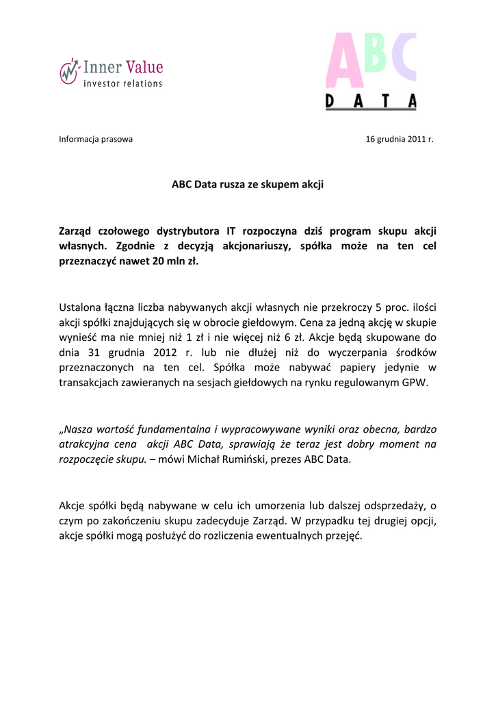 Informacja prasowa 16 grudnia 2011 r. ABC Data rusza ze skupem akcji Zarząd czołowego dystrybutora IT rozpoczyna dziś program skupu akcji własnych. Zgodnie z decyzją akcjonariuszy, spółka może na ten cel przeznaczyd nawet 20 mln zł. Ustalona łączna liczba nabywanych akcji własnych nie przekroczy 5 proc. ilości akcji spółki znajdujących się w obrocie giełdowym. Cena za jedną akcję w skupie wynieśd ma nie mniej niż 1 zł i nie więcej niż 6 zł. Akcje będą skupowane do dnia 31 grudnia 2012 r. lub nie dłużej niż do wyczerpania środków przeznaczonych na ten cel. Spółka może nabywad papiery jedynie w transakcjach zawieranych na sesjach giełdowych na rynku regulowanym GPW. „Nasza wartośd fundamentalna i wypracowywane wyniki oraz obecna, bardzo atrakcyjna cena akcji ABC Data, sprawiają że teraz jest dobry moment na rozpoczęcie skupu. – mówi Michał Rumioski, prezes ABC Data. Akcje spółki będą nabywane w celu ich umorzenia lub dalszej odsprzedaży, o czym po zakooczeniu skupu zadecyduje Zarząd. W przypadku tej drugiej opcji, akcje spółki mogą posłużyd do rozliczenia ewentualnych przejęd. O ABC Data S.A. ABC Data S.A. jest jednym z liderów rynku dystrybucji sprzętu IT w Polsce. Firma od 20 lat oferuje sprzęt komputerowy, oprogramowanie i elektronikę użytkową, sukcesywnie rozszerzając swoją działalnośd na rynek Czech, Słowacji oraz Litwy. Od grudnia ubiegłego roku ABC Data jest właścicielem 51% udziałów czołowego rumuoskiego dystrybutora IT – firmy Scop Computer. Spółka dysponuje największą na rynku ofertą ponad 30 tysięcy produktów 300 renomowanych dostawców. W czerwcu ABC Data S.A. rozpoczęła sprzedaż materiałów eksploatacyjnych pod własną marką Colorovo. Pod tą marką Spółka oferuje obecnie ponad 300 produktów we wszystkich krajach, na terenie których działa. Osoby do kontaktu: Wojciech Iwaniuk InnerValue [email protected] +48 504 207 566 Karolina Gnaś InnerValue [email protected] +48 516 091 124