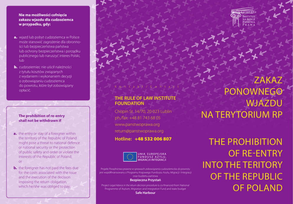 Nie ma możliwości cofnięcia zakazu wjazdu dla cudzoziemca w przypadku, gdy: a. wjazd lub pobyt cudzoziemca w Polsce może stanowić zagrożenie dla obronności lub bezpieczeństwa państwa lub ochrony bezpieczeństwa i porządku publicznego lub naruszyć interes Polski, lub b.cudzoziemiec nie uiścił należności z tytułu kosztów związanych z wydaniem i wykonaniem decyzji o zobowiązaniu cudzoziemca do powrotu, które był zobowiązany opłacić. K o n t a k t / C o n t a c t THE RULE OF LAW INSTITUTE FOUNDATION The prohibition of re-entry shall not be withdrawn if: a. the entry or stay of a foreigner within the territory of the Republic of Poland might pose a threat to national defence or national security or the protection of public safety and order or violate the interests of the Republic of Poland, or b. the foreigner has not paid the fees due for the costs associated with the issue and the execution of the decision imposing the return obligation, which he/she was obliged to pay. Chopin St. 14/70, 20-023 Lublin ph./fax: +48 81 743 68 05 www.panstwoprawa.org [email protected] Hotline: +48 532 006 807 Projekt Poradnictwo prawne w sprawach zobowiązania cudzoziemców do powrotu jest współfinansowany z Programu Krajowego Funduszu Azylu, Migracji i Integracji oraz budżetu państwa Bezpieczna Przystań Project Legal Advice in the return decision procedure is co-financed from National Programme of Asylum, Migration and Integration Fund and state budget Safe Harbour ZAKAZ PONOWNEGO WJAZDU NA TERYTORIUM RP THE PROHIBITION OF RE-ENTRY INTO THE TERITORY OF THE REPUBLIC OF POLAND W decyzji o zobowiązaniu cudzoziemca do powrotu określony zostaje zakaz ponownego wjazdu na terytorium RP. Zakaz ten może być wydany na okres od 6 miesięcy do 5 lat. Zakaz ponownego wjazdu zostaje wydany na następujące okresy: Od 6 miesięcy do 3 lat – w przypadkach, jeżeli cudzoziemiec: a. nie posiada ważnego dokumentu uprawniającego do pobytu na terytorium RP, lub b. nie opuścił Polski po wykorzystaniu dopuszczalnego okresu pobytu na terytorium (wszystkich lub niektórych) państw obszaru Schengen, lub c. nie posiada środków finansowych niezbędnych do pokrycia kosztów pobytu w Polsce, lub d. przebywa w Polsce po upływie okresu pobytu, do którego był uprawniony na podstawie zezwolenia na przekraczanie granicy w ramach małego ruchu granicznego, lub A decision imposing the return obligation on a foreigner shall provide for the prohibition of re-entry into the territory of the Republic of Poland. The prohibition can be ranged from 6 months to 5 years. The prohibition of re-entry shall be formulated for the following periods: From 6 months to 3 years – in the cases when a foreigner: a. resides within the territory of the Republic of Poland without a valid document authorising him/her to stay within it, or b. has not left the territory of the Republic of Poland after the lapse of the maximum duration of his/her stay within the territory of some or all Schengen countries, or c. does not have the financial resources necessary to cover the costs of his/her stay within the territory of the Republic of Poland, or d. stays within the territory of the Republic of Poland after the lapse of the period of stay to which he/ she was entitled under a permit to cross the border under the local border traffic, or e. została wydana decyzja o odmowie nadania statusu uchodźcy lub udzielenia ochrony uzupełniającej lub decyzja o umorzeniu postępowania w sprawie nadania statusu uchodźcy i nie opuścił on Polski w wskazanym terminie. Od 1 roku do 3 lat – jeżeli cudzoziemiec: a.wykonuje lub wykonywał pracę bez wymaganego zezwolenia lub zarejestrowanego oświadczenia pracodawcy o zamiarze powierzenia wykonywania pracy cudzoziemcowi, lub b.podjął działalność gospodarczą niezgodnie z polskim prawem. Od 3 lat do 5 lat – jeżeli cudzoziemiec: a.jest wpisany do Systemu Informacyjnego Schengen (SIS), lub b.został skazany prawomocnym wyrokiem w Polsce na karę pozbawienia wolności podlegającej wykonaniu, lub e. received a decision on refusal to grant refugee status or subsidiary protection or a decision to discontinue the proceedings on granting him/her refugee status and he/she has not left the territory of the Republic of Poland within the specified deadline. From 1 to 3 years – in the cases when a foreigner: a. performs or performed work without a required work permit or a registered employer’s declaration of intention to employ him/her to perform work, or b. operated an economic activity in breach of the Polish law applicable in this regard. From 3 years to 5 years – in the cases when: a. the foreigner’s data can be found in the Schengen Information System (SIS) for the purposes of refusing him/her entry, or b. a foreigner has been convicted in the Republic of Poland by a final decision for a custodial sentence subject to execution, or c.dalszy pobyt cudzoziemca w Polsce będzie stanowił zagrożenie dla zdrowia publicznego. 5 lat – jeżeli cudzoziemiec: a.ze względów obronności lub bezpieczeństwa państwa lub ochrony bezpieczeństwa i porządku publicznego nie może przebywać w Polsce. Kiedy zakaz wjazdu może zostać cofnięty? Na wniosek cudzoziemca, organ wydający decyzję zobowiązującą go do powrotu, może taki zakaz cofnąć, jeżeli cudzoziemiec wykaże, że: a. wykonał obowiązki wynikające z decyzji o zobowiązaniu cudzoziemca do powrotu (na przykład, wyjechał z Polski we wskazanym w decyzji terminie), lub b. jego ponowny wjazd do Polski lub innych państw obszaru Schengen ma nastąpić ze względu na uzasadnione okoliczności, zwłaszcza ze względów humanitarnych, lub c.została mu przyznana pomoc w dobrowolnym powrocie. c. further stay of a foreigner within the territory of the Republic of Poland would constitute a threat to public health. For 5 years – in the case when: a. it is justified by national security or defence, the protection of public order and 